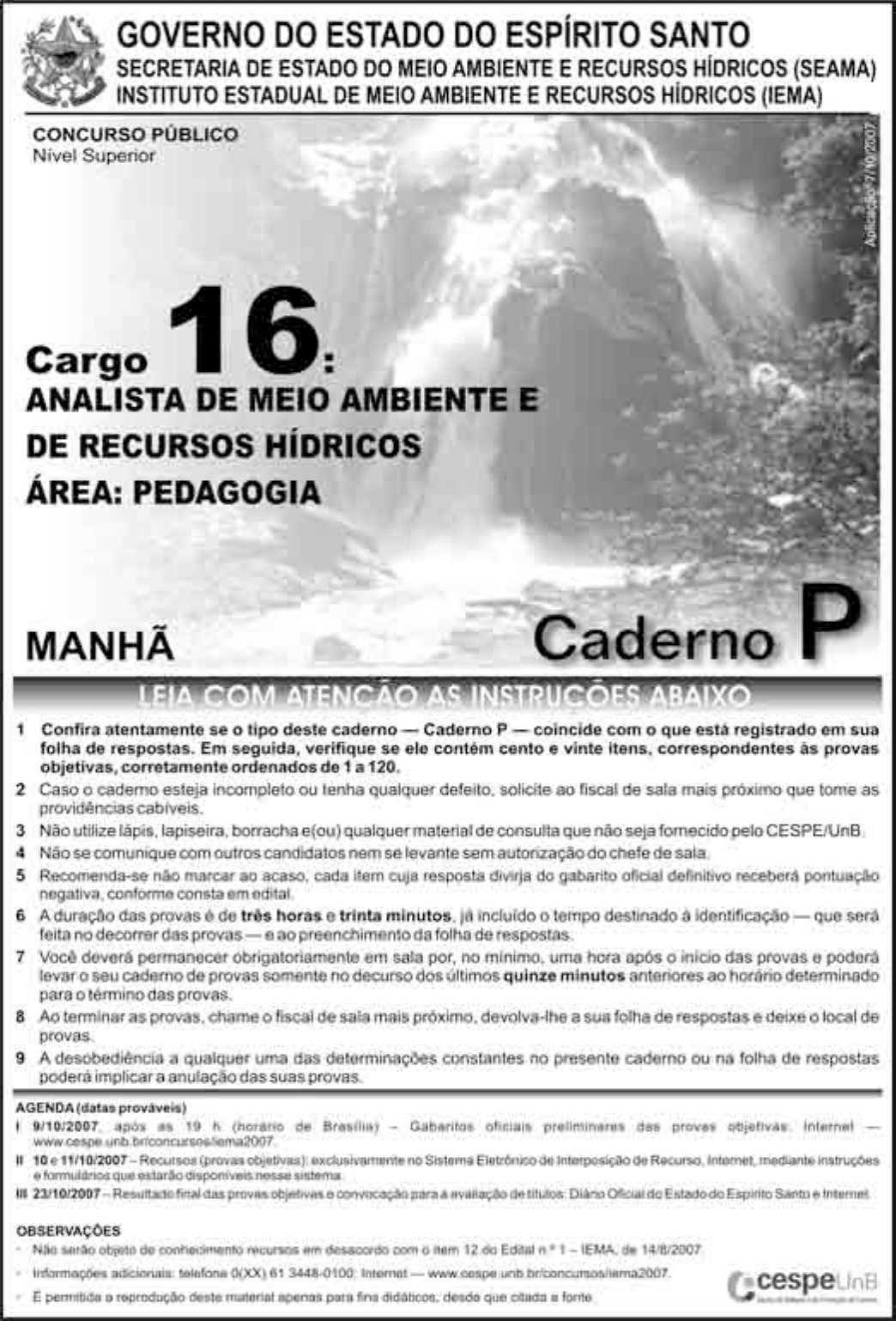 UnB/CESPE – IEMA Caderno P Cargo 16: Analista de Meio Ambiente e de Recursos Hídricos – Área: Pedagogia – 1 – • De acordo com o comando a que cada um dos itens de 1 a 120 se refira, marque, na folha de respostas, para cada item: o campo designado com o código C, caso julgue o item CERTO; ou o campo designado com o código E, caso julgue o item ERRADO. A ausência de marcação ou a marcação de ambos os campos não serão apenadas, ou seja, não receberão pontuação negativa. Para as devidas marcações, use a folha de respostas, único documento válido para a correção das suas provas. • Nos itens que avaliam Noções de Informática, a menos que seja explicitamente informado o contrário, considere que todos os programas mencionados estão em configuração-padrão, em português, que o mouse está configurado para pessoas destras e que expressões como clicar, clique simples e clique duplo referem-se a cliques com o botão esquerdo do mouse. Considere também que não há restrições de proteção, de funcionamento e de uso em relação aos programas, arquivos, diretórios e equipamentos mencionados. CONHECIMENTOS BÁSICOS A maioria do público acredita que os produtos1 químicos utilizados no dia-a-dia já foram exaustivamente testados e que seus criadores sabem exatamente como a natureza os receberá de volta quando eles forem jogados em4 esgotos ou simplesmente caírem no solo. Infelizmente essa não é toda a verdade. Apesar dos inúmeros cuidados e métodos7 desenvolvidos para se avaliar o impacto ambiental dos compostos químicos, a realidade é que é virtualmente impossível testar como cada um deles vai se comportar na10 natureza. “Leva um tempo muito grande para se estimar o destino ambiental dos compostos químicos — a indústria13 produz novos químicos muito mais rapidamente do que eles podem ser testados”, diz o Dr. Victor de Lorenzo, pesquisador que desenvolveu, no Centro Nacional de16 Biotecnologia da Espanha, um programa de computador capaz de prever com grande precisão como um determinado composto químico se comportará na natureza, se ele irá se19 biodegradar ou não. O destino dos compostos orgânicos no meio ambiente, dos mata-matos aos medicamentos, é largamente22 decidido pelos micróbios. Esses organismos quebram alguns compostos diretamente em dióxido de carbono (CO2), mas outros produtos químicos permanecem no meio ambiente25 por anos, absolutamente intocados. O novo sistema desenvolvido por Lorenzo mostra como os microrganismos digerem os compostos químicos.28 Diante de uma formulação que não seja digerida, é emitido um alerta que poderá auxiliar as autoridades a estabelecerem restrições ou até a proibir a comercialização do novo produto31 químico. O programa, chamado BDPServer, foi disponibilizado gratuitamente na Internet.34 Internet: <www.inovacaotecnologica.com.br> (com adaptações). Considerando as idéias, a tipologia e aspectos lingüísticos do texto acima, julgue os seguintes itens. 1 Infere-se do primeiro parágrafo do texto que as indústrias escondem a verdade acerca da natureza dos produtos químicos jogados diariamente no meio ambiente. 2 O programa desenvolvido pelo cientista espanhol pode ser considerado uma forma desinteressada, pelo menos do ponto de vista comercial, de preservação ambiental. 3 O texto apresenta aspectos textuais que permitem classificá- lo como dissertativo-informativo. 4 Mantendo-se a coerência de sentido e a correção gramatical do texto, o segundo parágrafo pode ser assim reescrito: É praticamente impossível testar o comportamento ambiental dos compostos químicos, embora sejam incontáveis os esforços despendidos na avaliação do impacto desses elementos no meio ambiente. 5 Os vocábulos “público”, “químicos” e “métodos” são acentuados de acordo com a mesma regra de acentuação gráfica. 6 Na linha 8, é possível, sem prejudicar a coerência ou a correção gramatical do texto, substituir “para se avaliar o impacto” por na avaliação do impacto. 7 O termo “Esses organismos” (R.23) está empregado em referência a “mata-matos” e “medicamentos”, ambos na linha 22. 8 O conector “mas” (R.24) introduz, no período, uma oração de sentido explicativo. O crescimento mundial da consciência ambiental1 está aumentando na sociedade o desejo de consumir produtos ambientalmente saudáveis. Vários países do mundo já adotam, voluntariamente, mecanismos de rotulagem4 ambiental, com atribuição de selos verdes a produtos que atendam critérios de controle ambiental previamente estabelecidos.7 A rotulagem ambiental está se tornando um poderoso instrumento de mercado, pelo qual se informa aos consumidores que determinados produtos são produzidos de10 acordo com padrões ambientalmente corretos. Internet: <www.mma.gov.br>(com adaptações). Com relação aos sentidos e aspectos gramaticais do texto acima, julgue os itens subseqüentes. 9 Depreende-se da leitura do texto que poderosas corporações detêm, no mercado mundial, o controle dos mecanismos de rotulagem ambiental. 10 De acordo com o texto, a rotulagem ambiental já faz parte da legislação de diversos países. 11 Estaria mantida a correção gramatical do texto, caso a expressão “na sociedade” (R.2) estivesse isolada entre vírgulas. UnB/CESPE – IEMA Caderno P Cargo 16: Analista de Meio Ambiente e de Recursos Hídricos – Área: Pedagogia – 2 – 12 Na linha 2, a forma verbal “consumir” poderia estar flexionada no plural — consumirem —, sem prejuízo para a correção gramatical do texto. 13 No grupo nominal “critérios de controle ambiental previamente estabelecidos” (R.6-7), os dois últimos elementos — “previamente estabelecidos” — podem, nessa ordem, ser posicionados logo após a palavra “critérios”, sem que haja prejuízo para a correção gramatical e a coerência do texto. 14 A partícula “se” em “pelo qual se informa” (R.9) 