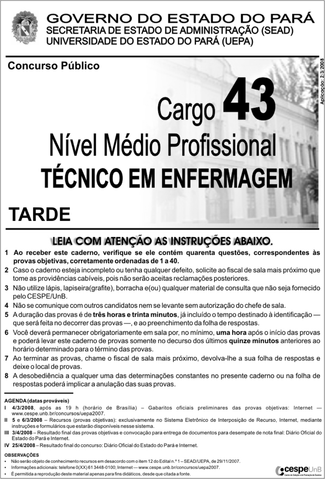 UnB/CESPE – SEAD/UEPA Cargo 43: Nível Médio Profissional – Técnico em Enfermagem – 1 – • Nas questões de 1 a 40, marque, em cada uma, a única opção correta, de acordo com o respectivo comando. Para as devidas marcações, use a folha de respostas, único documento válido para a correção das suas provas. • Nas questões que avaliam Noções de Informática, a menos que seja explicitamente informado o contrário, considere que todos os programas mencionados estão em configuração-padrão, em português, que o mouse está configurado para pessoas destras e que expressões como clicar, clique simples e clique duplo referem-se a cliques com o botão esquerdo do mouse. Considere também que não há restrições de proteção, de funcionamento e de uso em relação aos programas, arquivos, diretórios e equipamentos mencionados. CONHECIMENTOS BÁSICOS Texto para as questões de 1 a 8 Onde mais? A gente não se dá conta, mas existe um outro vício (eu diria: vírus) de linguagem infectando indiscriminadamente1 brasileiros de todas as idades, sexos e estratos sociais. Falo do insidioso “onde”. Sim: insidioso. À primeira vista, “onde” parece uma palavra inocente e inofensiva. Mas, sem fazer alarde, o danado do “onde” foi se imiscuindo na nossa vida, invadindo frases que não lhe dizem respeito e diminuindo4 consideravelmente as oportunidades de emprego para palavras honestas como “que”, “o qual” e “das quais”. Todos os momentos em que deveríamos usar “em que”, muitas situações nas quais antigamente se usava “nas quais” e uma série de casos “onde” pedem nada além de um simples “que”, de repente, viraram momentos “onde”, situações “onde” e casos7 “onde”. Casos “onde” ?!! Esse maldito “onde” é ainda mais perigoso, porque, na maioria das vezes, a gente nem nota que ele está ali, apodrecendo uma frase inteira. Tem vezes “onde” a gente consegue perceber, mas existem construções mais elaboradas “onde” até os ouvidos10 mais sensíveis acabam engambelados. É diferente do irritante “com certeza”, que tem uma melancia pendurada no pescoço e não esquece de se anunciar a cada aparição. Não é como a praga do gerundismo, que sempre vai estar chamando a atenção de todos os que não suportam estar13 ouvindo quem insiste em estar falando desse jeito. O “onde”, não. O “onde” é discreto. Vai chegar um momento “onde” você e eu vamos passar a falar assim e vamos achar normal. Confesso que eu não tinha me dado conta do problema até conversar com o professor Eduardo Martins em seu programa16 na Rádio Eldorado, o “De palavra em palavra”. (Parênteses. Sim, existe ALGUÉM nesse país que leva “Xongas” a sério. E esse alguém é ninguém menos que o professor Eduardo Martins. Não, leitor, você não precisa mais ler “Xongas” escondido, ou fingindo que está com os olhos no resto da página. O Eduardo Martins também lê! — obrigadíssimo pela audiência, Professor.)19 Depois do programa do professor Eduardo, vi o assunto sendo discutido no programa de TV do professor Pasquale, e ainda recebi várias newsletters pela Internet que tocavam no problema do “onde”. Ou seja: os estudiosos já estão há muito tempo cientes do problema. Agora é preciso envolver o resto da população no combate a essa epidemia. Aliás, aqui vai uma sugestão à produção22 da próxima “Casa dos Artistas”: vamos fazer da Tiazinha, da Feiticeira e dos Gêmeos os garotos-propaganda de uma campanha pela erradicação do “com certeza”, do “eu vou estar transferindo a sua ligação” e do “tem casos onde”. O absurdo maior é que o “onde” está deixando de ser usado justamente nos momentos em que deveria, ou seja, quando é relativo a lugares.25 Quase ninguém mais diz “o lugar onde nasci” ou “as cidades onde morei”. Agora é o lugar “que” eu nasci, as cidades “que” eu morei. Se essa troca de função entre o “onde” e o “que” for mais longe, aonde (a quê?) vamos parar? Já pensou? Em vez de “a mulher que eu amo”, você vai dizer “a mulher onde eu amo”. (Às vezes as duas coisas coincidem, mas outras vezes o28 objeto do desejo está inacessível ou com enxaqueca.) Mas o pior vai ser quando “por que” virar “por onde”. “Por que você não foi?” vai virar “Por onde você não foi?”, o que vai suscitar múltiplas interpretações. Além do que (do onde?), aprender de novo quando o poronde é junto, quando o por onde é separado e quando o porônde31 leva acento vai ser complicado demais nessa idade. Ricardo Freire. Época, 25/12/2001 (com adaptações). QUESTÃO 1 De acordo com o texto, “onde” A pode ser plenamente substituído por outras palavras, sem prejuízo de sentido. B deve ser empregado em todos os momentos em que se emprega em que. C é discreto e, por isso, pode ser empregado sem problemas, em lugar de que. D vem sendo indiscriminadamente empregado, em lugar de outros pronomes. QUESTÃO 2 Assinale o trecho do texto em que o emprego de onde está de acordo com a prescrição gramatical. A “e uma série de casos ‘onde’ pedem nada além de um simples ‘que’” (R.6-7). B “Tem vezes ‘onde’ a gente consegue perceber, mas existem construções mais elaboradas ‘onde’ até os ouvidos mais sensíveis acabam engambelados” (R.10-11). C “O ‘onde’, não. O ‘onde’ é discreto. Vai chegar um momento ‘onde’ você e eu vamos passar a falar assim e vamos achar normal” (R.14-15). D “Quase ninguém mais diz ‘o lugar onde nasci’ ou ‘as cidades onde morei’. Agora é o lugar ‘que’ eu nasci, as cidades ‘que’ eu morei” (R.26-27). UnB/CESPE – SEAD/UEPA Cargo 43: Nível Médio Profissional – Técnico em Enfermagem – 2 – QUESTÃO 3 De acordo com o texto, é correto afirmar que A o uso exagerado do pronome “onde” não é tão pernicioso quanto o uso do “com certeza” ou do gerundi