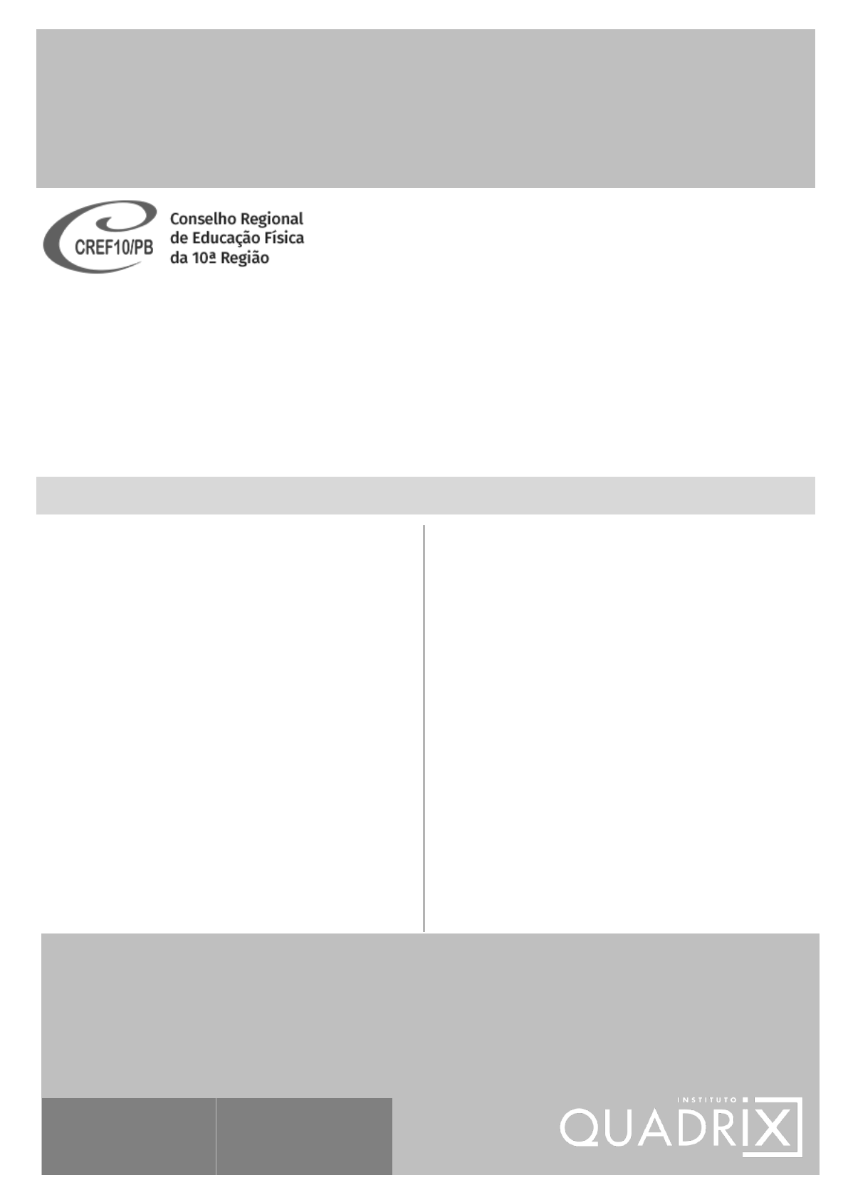 pcimarkpci MDAwMDowMDAwOjAwMDA6MDAwMDowMDAwOmZmZmY6YjE5NTo4Njdj:RnJpLCAwNSBKdW4gMjAyMCAwOTozNTozNSAtMDMwMA== 1 Confira se seu CADERNO DE PROVAS corresponde ao cargo escolhido em sua inscrição. Este caderno contém cinquenta questões objetivas, corretamente ordenadas de 1 a 50, uma prova de redação e uma folha rascunho. 2 Caso esteja incompleto ou contenha algum defeito, solicite ao fiscal de sala que tome as providências cabíveis, pois não serão aceitas reclamações posteriores nesse sentido. 3 O CARTÃO-RESPOSTA e a FOLHA DE TEXTO DEFINITIVO, que serão entregues pelo fiscal durante a prova, são os únicos documentos válidos para a correção das questões objetivas e da prova de redação expostas neste caderno. 4 Quando o CARTÃO-RESPOSTA estiver em suas mãos, confira-o para saber se está em ordem e se corresponde ao seu nome. Em caso de dúvidas, solicite orientação ao fiscal. 5 Ao receber a sua FOLHA DE TEXTO DEFINITIVO para a elaboração de sua resposta da prova de redação, verifique imediatamente se o número de sequência (canto superior direito) confere com o número impresso no seu CARTÃO- RESPOSTA. 6 No CARTÃO-RESPOSTA, a marcação das letras correspondente às suas respostas deve ser feita com caneta esferográfica azul ou preta. O preenchimento é de sua exclusiva responsabilidade. 7 Não danifique o CARTÃO-RESPOSTA ou a FOLHA DE TEXTO DEFINITIVO, pois em hipótese alguma haverá substituição por erro do candidato. 8 Para cada uma das questões objetivas são apresentadas 5 alternativas classificadas com as letras: A, B, C, D e E, havendo apenas uma que responde ao quesito proposto. O candidato deve assinalar uma resposta. Marcação rasurada, emendada, com campo de marcação não preenchido ou com marcação dupla não será considerada. 9 A duração total das provas objetiva e de redação é de 4 horas, incluindo o tempo destinado à identificação - que será feita no decorrer da prova -, à transcrição do texto para a FOLHA DE TEXTO DEFINITIVO da prova de redação e ao preenchimento do CARTÃO-RESPOSTA. 10 Reserve, no mínimo, os 25 minutos finais para preencher o CARTÃO-RESPOSTA e a FOLHA DE TEXTO DEFINITIVO. Não será concedido tempo adicional para o preenchimento. 11 Você deverá permanecer obrigatoriamente em sala por, no mínimo, 1 hora após o início das provas e poderá levar este caderno somente no decurso dos últimos 60 minutos anteriores ao horário determinado para o seu término. 12 É terminantemente proibido ao candidato copiar seus assinalamentos feitos no CARTÃO-RESPOSTA da prova objetiva. 13 Não se comunique com outros candidatos nem se levante sem a autorização do fiscal de sala. 14 Ao terminar a prova, chame o fiscal de sala, devolva-lhe o CARTÃO-RESPOSTA, a FOLHA DE TEXTO DEFINITIVO e deixe o local de prova. INFORMAÇÕES 11/09/2016 – Data de aplicação das provas objetiva e de redação. 12/09/2016 – A partir das 16h (horário de Brasília) – Divulgação do gabarito preliminar da prova objetiva. Não serão conhecidos os recursos em desacordo com o estabelecido em edital normativo. É permitida a reprodução deste material apenas para fins didáticos, desde que citada a fonte. A desobediência a qualquer uma das determinações constantes em edital, no presente caderno ou no CARTÃO-RESPOSTA poderá implicar a anulação da sua prova. CONSELHO REGIONAL EDUCAÇÃO FÍSICA DA 10ª REGIÃO CONCURSO PÚBLICO Nº 01/2016 CARGO DE NÍVEL SUPERIOR AGENTE DE FISCALIZAÇÃO CADERNO DE PROVAS - LEIA COM ATENÇÃO AS INSTRUÇÕES Para uso do Instituto QUADRIX TIPO 2 D Chave de Segurança AGF333 pcimarkpci MDAwMDowMDAwOjAwMDA6MDAwMDowMDAwOmZmZmY6YjE5NTo4Njdj:RnJpLCAwNSBKdW4gMjAyMCAwOTozNTozNSAtMDMwMA== │CREF-10_AGF333_2D│Cargo: AGENTE DE FISCALIZAÇÃO Instituto QUADRIX│CREF-10 – Aplicação: 2016│ -2- PROVA OBJETIVA LÍNGUA PORTUGUESA Para responder às questões de 1 a 5, leia o texto abaixo. Atletas plus size ganham destaque nas Olimpíadas do Rio Parece redundante, mas você já parou para pensar que assim como existem gordos doentes e magros saudáveis, também existem muitos gordos que superam alguns magros no quesito saúde? De acordo com a OMS (Organização Mundial de Saúde), quem tem IMC (índice de massa corporal) acima de 25 é considerado acima do peso. Mas o que pouca gente sabe é que nos Jogos Olímpicos do Rio 2016 há mais de 300 atletas inscritos com IMC superior a 30. E isso mostra, na prática, o que muitas pesquisas científicas têm afirmado, ou seja, que mais importante do que "quantos quilos" o indivíduo pesa é a quantidade de tempo que ele dedica para colocar o corpo em movimento. Em outras palavras, o sedentarismo é muito mais prejudicial para a saúde do que os quilos que podemos carregar. Já parou para pensar nisso? São atletas cujos corpos fogem, e muito, ao padrão pré-estabelecido e que a mídia vende como o corpo ideal para um atleta. Provavelmente esqueceram que diante de tantas modalidades esportivas em uma olimpíada, é natural que haja dentre as delegações mundiais atletas com alturas, pesos, IMCs e corpos diferentes. Portanto, não deveria importar se eles estão ou não dentro do padrão - criado pela mídia - considerado "ideal" para um atleta. A verdade é que são homens e mulheres que estão nas Olimpíadas quebrando as barreiras dos seus próprios limites. Gordos ou magros, deveriam servir de exemplo de superação para todos! Para mostrar que qualquer pessoa pode ultrapassar os próprios limites e realizar seus sonhos, independentemente do corpo ou peso. (g1.globo.com) QUESTÃO 1 As expressões "gordos doentes" e "magros saudáveis", juntas, contêm: (A) quatro palavras todas parônimas entre si. (B) dois pares de parônimos. (C) quatro palavras sinônimas entre si. (D) dois pares de antônimos. (E) dois hipônimos e dois hiperônimos. QUESTÃO 2 A palavra "que", em destaque no segundo parágrafo, é: (A) um pronome relativo e retoma "OMS". (B) um 