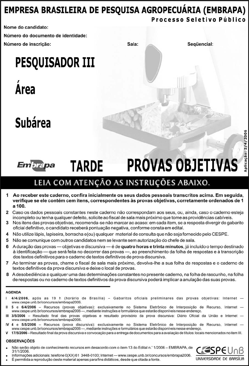 UnB / CESPE – EMBRAPA / Nome do candidato: – 1 – Cargo 2: Pesquisador III – Área 4 – Subáreas de 1 a 5 É permitida a reprodução apenas para fins didáticos, desde que citada a fonte. • De acordo com o comando a que cada um dos itens de 1 a 100 se refira, marque, na folha de respostas, para cada item: o campo designado com o código C, caso julgue o item CERTO; ou o campo designado com o código E, caso julgue o item ERRADO. A ausência de marcação ou a marcação de ambos os campos não serão apenadas, ou seja, não receberão pontuação negativa. Para as devidas marcações, use a folha de rascunho e, posteriormente, a folha de respostas, único documento válido para a correção das suas provas. CONHECIMENTOS BÁSICOS A cada dia que passa, mais me convenço de que1 vivemos num mundo inventado, e não apenas no que se refere às tecnologias e valores que sustentam a vida, mas no que diz respeito à história ou histórias que constituem4 nosso passado. Ferreira Gullar. Folha de S. Paulo. 29/1/2006 (com adaptações). Julgue os seguintes itens a respeito do fragmento de texto acima. 1 Dado que o termo “A cada dia” (R.1) mantém correspondência semântica com a expressão Todos os dias, esta pode substituí-la, sem prejudicar a coerência e a correção gramatical do texto. 2 A presença da preposição “de” (R.1) antes da conjunção “que” indica que esta introduz uma oração, de função substantiva, que complementa o verbo convencer. 3 Na linha 2, a repetição do termo “inventado” depois de “e” produziria redundância, que funcionaria como ênfase para a idéia expressa, sem prejudicar a coerência argumentativa ou a correção gramatical do texto. Nenhum autor sintetiza melhor do que Pico della1 Mirandola a imagem que os pensadores italianos tinham do homem. Ele nos fala de maneira eloqüente desse ser cheio de potencialidades que, ao contrário dos outros4 animais, recebeu de Deus o direito de forjar o próprio rosto. Um homem assim constituído certamente não7 pode compreender sua passagem pelo mundo da mesma forma que os homens a compreendiam em plena Idade Média. Pico sugere não só que não somos prisioneiros de10 nenhuma lei externa, mas que podemos escolher nossa própria natureza, moldando-a segundo nossos desejos e criando nossas próprias leis. O que essa imagem de um13 homem totalmente livre tem de encantadora não é a descoberta do caráter não necessário das escolhas que operamos no mundo, os medievais já sabiam disso, e sim16 o fato de que o pensador italiano sugere que podemos inventar uma natureza e também sua forma de estar no mundo. Em outras palavras, somos os inventores de nossa19 natureza e também de nossa história. Newton Bignotto, O círculo e a linha. In: Adauto Novaes (org.), Tempo e história (com adaptações). Com base no texto acima, julgue os seguintes itens. 4 Para que esse texto faça parte de um documento oficial, respeitando-se as normas do padrão culto da língua portuguesa, a contração da preposição em “do” (R.1) deveria ser omitida ou, ao menos, o artigo nela presente deveria ser retirado. 5 A expressão “ser cheio de potencialidades” (R.3-4), que qualifica “Pico della Mirandola”, evidencia a admiração do autor do texto por esse “pensador italiano” (R.17). 6 Preservam-se a coerência e a correção gramatical do texto ao se utilizar, alternativamente, a preposição a no lugar da preposição “de” em “o direito de forjar” (R.5). 7 Apesar de, no texto, serem focalizadas reflexões sobre situações e eventos passados e empregados vários verbos no pretérito, o que se diz a respeito de “Um homem assim constituído” (R.7) está no presente, pois, se a oração fosse considerada de pretérito, o verbo seria grafado podia ou pôde, em vez de “pode” (R.8). 8 O pronome “a” (R.9) está empregado no feminino singular porque se refere a “sua passagem pelo mundo” (R.8). 9 Nas linhas 10 e 11, a repetição da conjunção “que” indica que a forma verbal “sugere” é complementada pelas duas orações iniciadas por essa conjunção, sendo, nesse caso, facultativa a segunda ocorrência da conjunção. 10 Pela natureza da informação, a oração “os medievais já sabiam disso” (R.16) poderia ser iniciada pela conjunção pois e demarcada pelo sinal de parênteses ou de duplo travessão no lugar de vírgulas. 11 Para se evitar o uso excessivo da palavra que, poderia ser feita a substituição do trecho “o fato de que o pensador” (R.17) por o fato do pensador, sem prejuízo da argumentação e correção gramatical do texto. O futuro da humanidade será cada vez mais movido1 pelo uso intensivo de conhecimento, quer na atividade produtiva quer em atividades cotidianas, como entretenimento e convívio. Criar mecanismos capazes de não apenas estimular a4 produção como também sua ampla difusão é tarefa para todos, devendo ocupar opção preferencial na agenda das empresas contemporâneas.7 Compartilhar conhecimentos é um fato social tão relevante quanto o próprio ato de criação de novos conhecimentos, principalmente se levarmos em conta que boa10 parte da produção destes resulta da combinação de saberes já existentes e utilizados parcialmente ou com outros fins. A gestão do conhecimento na Eletronuclear, UnB Revista, maio/jun./jul./ 2005, p. 58 (com adaptações). Julgue os seguintes itens a respeito do emprego das estruturas lingüísticas do texto acima. 12 Para enfatizar a idéia de “uso intensivo de conhecimento” (R.2), uma redação para o primeiro período do texto, preservando-se a coerência e a correção, seria: O uso intensivo do conhecimento moverá cada vez mais o futuro da humanidade. 13 Preservam-se a coerência da argumentação e a correção gramatical do texto ao enumerar as atividades movidas pelo uso do conhecimento, empregando-se as conjunções seja ... seja ou tanto ... quanto, em lugar de “quer ... quer”