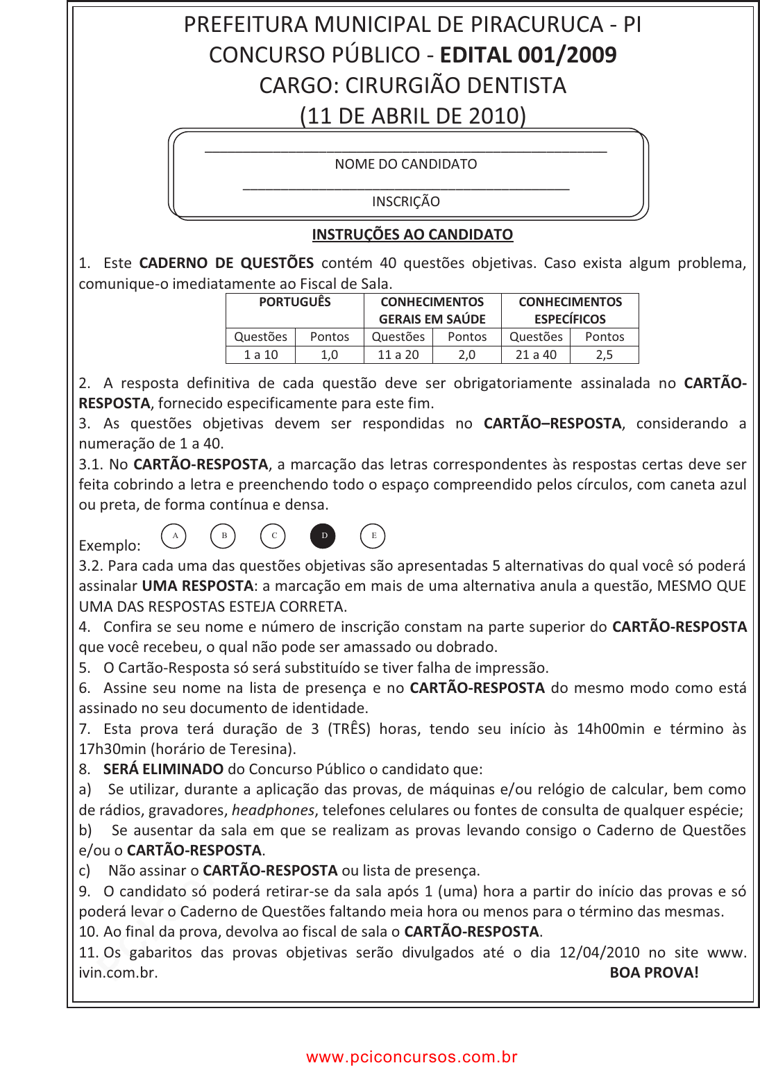 pcimarkpci MDAwMDowMDAwOjAwMDA6MDAwMDowMDAwOmZmZmY6OGE2MTo0MGUy:RnJpLCAxMiBKdWwgMjAxOSAxOTo0MTowOSAtMDMwMA== PREFEITURA MUNICIPAL DE PIRACURUCA - PI CONCURSO PÚBLICO - EDITAL 001/2009 CARGO: CIRURGIÃO DENTISTA (11 DE ABRIL DE 2010) INSTRUÇÕES AO CANDIDATO 1. Este CADERNO DE QUESTÕES contém 40 questões objetivas. Caso exista algum problema, comunique-o imediatamente ao Fiscal de Sala. PORTUGUÊS CONHECIMENTOS GERAIS EM SAÚDE CONHECIMENTOS ESPECÍFICOS Questões Pontos Questões Pontos Questões Pontos 1 a 10 1,0 11 a 20 2,0 21 a 40 2,5 2. A resposta definitiva de cada questão deve ser obrigatoriamente assinalada no CARTÃO- RESPOSTA, fornecido especificamente para este fim. 3. As questões objetivas devem ser respondidas no CARTÃO–RESPOSTA, considerando a numeração de 1 a 40. 3.1. No CARTÃO-RESPOSTA, a marcação das letras correspondentes às respostas certas deve ser feita cobrindo a letra e preenchendo todo o espaço compreendido pelos círculos, com caneta azul ou preta, de forma contínua e densa. Exemplo: 3.2. Para cada uma das questões objetivas são apresentadas 5 alternativas do qual você só poderá assinalar UMA RESPOSTA: a marcação em mais de uma alternativa anula a questão, MESMO QUE UMA DAS RESPOSTAS ESTEJA CORRETA. 4. Confira se seu nome e número de inscrição constam na parte superior do CARTÃO-RESPOSTA que você recebeu, o qual não pode ser amassado ou dobrado. 5. O Cartão-Resposta só será substituído se tiver falha de impressão. 6. Assine seu nome na lista de presença e no CARTÃO-RESPOSTA do mesmo modo como está assinado no seu documento de identidade. 7. Esta prova terá duração de 3 (TRÊS) horas, tendo seu início às 14h00min e término às 17h30min (horário de Teresina). 8. SERÁ ELIMINADO do Concurso Público o candidato que: a) Se utilizar, durante a aplicação das provas, de máquinas e/ou relógio de calcular, bem como de rádios, gravadores, headphones, telefones celulares ou fontes de consulta de qualquer espécie; b) Se ausentar da sala em que se realizam as provas levando consigo o Caderno de Questões e/ou o CARTÃO-RESPOSTA. c) Não assinar o CARTÃO-RESPOSTA ou lista de presença. 9. O candidato só poderá retirar-se da sala após 1 (uma) hora a partir do início das provas e só poderá levar o Caderno de Questões faltando meia hora ou menos para o término das mesmas. 10. Ao final da prova, devolva ao fiscal de sala o CARTÃO-RESPOSTA. 11. Os gabaritos das provas objetivas serão divulgados até o dia 12/04/2010 no site www. ivin.com.br. BOA PROVA! _____________________________________________________ NOME DO CANDIDATO ___________________________________________ INSCRIÇÃO A B C D E www.pciconcursos.com.br pcimarkpci MDAwMDowMDAwOjAwMDA6MDAwMDowMDAwOmZmZmY6OGE2MTo0MGUy:RnJpLCAxMiBKdWwgMjAxOSAxOTo0MTowOSAtMDMwMA== CARGO: CIRURGIÃO DENTISTA 2 PORTUGUÊS 1. Leia: 1- Ai, palavras, ai, palavras, que estranha potência a vossa! 3- Todo o sentido da vida principia à vossa porta; o mel do amor cristaliza 6- seu perfume em vossa rosa; sois o sonho e sois a audácia, calúnia, fúria, derrota... (Cecília Meireles) Aponte a alternativa correta sobre as relações de significados que esse trecho apresenta. a) A reiteração do vocativo do verso 1 enfatiza o tom de reflexão, isenta de emoção b) O adjunto adverbial de lugar do verso 4, expresso por uma metáfora, aponta para a intangibilidade das palavras. c) Os versos 7 e 8 apresentam predicativos do sujeito, que se organizam num paradoxo. d) Há um objeto direto no verso 3 que define, numa verdade atemporal, o alcance ilimitado do poder das palavras. e) Os adjetivos possessivos do verso 6 referem-se “ao sentido da vida” a às “palavras”, recuperando tais termos, para infantilizá-los. Com base nos versos, responda as questões 2 e 3: “_ Muito bom dia, senhora, que nessa janela está; sabe dizer se é possível algum trabalho encontrar” (João Cabral de Melo Neto) 2. No primeiro verso, senhora vem entre vírgulas porque o termo é: a) Um aposto b) Um sujeito deslocado c) Um vocativo d) Um predicativo e) Um sujeito simples 3. Nos versos “sabe dizer se é possível / algum trabalho encontrar?”, a oração destacada é: a) Subordinada substantiva adjetiva b) Subordinada substantiva objetiva indireta c) Subordinada substantiva objetiva direta d) Subordinada substantiva predicativa e) Subordinada substantiva completiva nominal 4. Assinale a alternativa em que não ocorre erro de grafia: a) Escasso, massa, carrocel, senário, senso b) Honradez, quizestes, ruço, dissertar, cessar c) Empossar, incipiente, obscecação, assessório, maçudo d) Celeiro, exegese, cerração, intensão, alcanse e) Atraso, maçã, ascensorista, exceção, obsessão Texto para as Questões 5 a 9 Assine IMPRENSA. Um olhar diferente sobre comunicação. Em duas décadas, o jeito de fazer notícia mudou muito. E o de ler também. Desde 1987, IMPRENSA traz para você um olhar apurado e crítico sobre o mundo do jornalismo e da comunicação. São vinte anos de grandes reportagens, análises precisas e entrevistas históricas. Um conteúdo de qualidade, que você pode receber todos os meses na sua casa. Assine IMPRENSA. E passe a ver a notícia com outros olhos. Língua Portuguesa, segmento, nº 28, 2007 5. No trecho acima a intenção do autor é: a) Convencer o leitor de que a revista imprensa pode levá-lo “a ver a notícia com outros olhos”. www.pciconcursos.com.br pcimarkpci MDAwMDowMDAwOjAwMDA6MDAwMDowMDAwOmZmZmY6OGE2MTo0MGUy:RnJpLCAxMiBKdWwgMjAxOSAxOTo0MTowOSAtMDMwMA== CARGO: CIRURGIÃO DENTISTA 3 b) Vender a revista para um público mais seleto sem a preocupação com o conteúdo abordado. c) Convencer o leitor para que compre apenas exemplares desta revista, com a preocupação de massificá-la. d) Buscar dentro de outras camadas sociais um público mais adequado, de acordo com a visão da revista. e) Inserir novos contextos nas notícias para atingir outras camadas sociais. 6.