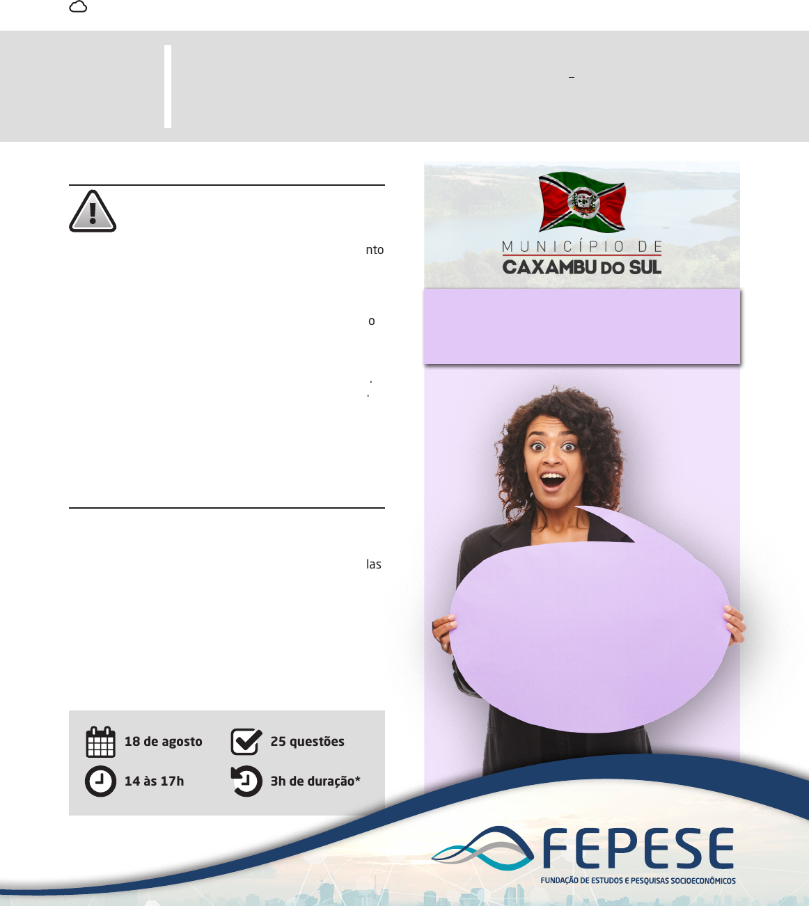 Município de Caxambu do Sul Processo Seletivo • Edital 002/2019 http://caxambudosul.fepese.org.br Instruções Confira o número que você obteve no ato da inscrição com o que está indicado no cartão-resposta. * A duração da prova inclui o tempo para o preenchimento do cartão-resposta. Para fazer a prova você usará: � este caderno de prova. � um cartão-resposta que contém o seu nome, número de inscrição e espaço para assinatura. Verifique, no caderno de prova, se: � faltam folhas e a sequência de questões está correta. � há imperfeições gráficas que possam causar dúvidas. Comunique imediatamente ao fiscal qualquer irregularidade! Atenção! � Não é permitido qualquer tipo de consulta durante a realização da prova. � Para cada questão são apresentadas 5 alternativas diferentes de respostas (a, b, c, d, e). Apenas uma delas constitui a resposta correta em relação ao enunciado da questão. � A interpretação das questões é parte integrante da prova, não sendo permitidas perguntas aos fiscais. � Não destaque folhas da prova. Ao terminar a prova, entregue ao fiscal o caderno de prova completo e o cartão-resposta devidamente preenchido e assinado. 18 de agosto 14 às 17h 25 questões 3h de duração* C A D E R N O D E P R O V A P25 Professor Ensino Fundamental - Séries Finais (6 o ao 9o Ano) • Ciências Processo Seletivo Boa Prova . Página 3 Município de Caxambu do Sul • Processo Seletivo • Edital 002/2019 P25 Professor Ensino Fundamental - Séries Finais (6o ao 9o Ano) • Ciências Aspectos históricos, geográficos, econômicos, políticos e culturais 5 questões 1. Apenas dois países sul-americanos não fazem fron- teira com o Brasil. Assinale a alternativa que os identifica. a. SQUARE Argentina e Bolívia b. SQUARE Canadá e Uruguai c. Check-square Chile e Equador d. SQUARE Chile e Paraguai e. SQUARE Panamá e Colômbia 2. O Brasil é, segundo o OEC (The Observatory of Eco- nomic Complexity), a 22a maior economia de exporta- ção no mundo. Assinale a alternativa que indica o produto catari- nense, que em maio de 2019 foi o principal produto da pauta de exportações do nosso Estado, contri- buindo para o incremento das exportações nacionais. a. Check-square carnes de aves b. SQUARE flores e verduras c. SQUARE móveis de madeira d. SQUARE ova de tainha salgada e. SQUARE arenque e tilápia defumados 3. A dança clássica, ou balé clássico, tem sua provável origem na Itália, no século XV, e ainda hoje atrai milha- res de pessoas. Entre as grandes companhias de balé do mundo contemporâneo está o Ballet Bolshoi , a Companhia do Grande Teatro Acadêmico para Ópera e Ballet de Moscou. No Brasil existe uma Escola do Teatro Bolshoi que tem como proposta formar artistas e promover a arte-educação. Assinale a cidade onde funciona essa escola. a. SQUARE Campinas, São Paulo b. Check-square Joinville, Santa Catarina c. SQUARE Petrópolis, Rio de Janeiro d. SQUARE Florianópolis, Santa Catarina e. SQUARE Rio de Janeiro, Rio de Janeiro 4. O início do povoamento da região de Chapecó está intimamente ligado à expansão de uma atividade econômica. Assinale a alternativa que indica essa atividade. a. SQUARE Pescado b. SQUARE Extração de carvão c. SQUARE Mineração e erva mate d. SQUARE Agricultura de soja, sorgo e milho e. Check-square Criação e transporte de gado 5. O povo catarinense é resultado do caldeamento de muitos povos, muitas línguas, muitas culturas. Assinale a alternativa que indica uma cidade catari- nense fundada por imigrantes austríacos. a. SQUARE Piçarras b. SQUARE São José c. SQUARE Gramado d. Check-square Treze Tílias e. SQUARE Alfredo Wagner Língua Nacional 5 questões Leia atentamente o texto abaixo. O piscinão da Torre Eiffel Os (1) neste início de verão europeu cravaram temperaturas inéditas, insufladas por uma massa de ar quente vinda direto do Saara. Calejados que estão pela inclemente temporada de calor de agosto de 2003, que varreu a Europa e, só na França, deixou 15000 mortos, vários países ativaram o alerta laranja – o número 3 na escala do perigo que vai até 4. No rol dos mais castigados estão Espanha, Bélgica, Alemanha e França, que deve experimentar o mesmo sufoco de 1947, cujo recorde (médias de 40 graus no dia) nunca foi ultrapassado. E eis que, voilà, os parisienses acharam um jeito de fazer do “inferno”, como definiu a meteorologia local, uma festa. Muita gente se banhou nos chafarizes belle époque e em piscinas temporárias, como a que deu graça ao cartão- -postal da Torre Eiffel, para amenizar a canícula . A pre- feitura ainda espalhou um arsenal de bebedouros e vaporizadores de água pelos bulevares e, em espaços internos públicos, instalou salas climatizadas. Carros Página 4 Município de Caxambu do Sul • Processo Seletivo • Edital 002/2019 P25 Professor Ensino Fundamental - Séries Finais (6o ao 9o Ano) • Ciências mais antigos e poluentes (algo aferido por um adesivo afixado ao veículo) não podem circular até segunda ordem. Espera-se para os próximos dias temperatura de 40 graus ou mais, e sensação térmica ainda pior. Paris concentra relativamente pouco verde em relação ao tanto de pedras e concreto que acumula, o que faz da cidade uma (2) arquite- tônica de distintos estilos – e uma estufa ao mesmo tempo. Os cientistas (3) nessas ondas de calor cada vez mais frequentes, precoces e intensas, um sintoma dos novos tempos de aqueci- mento global. Enquanto isso, os parisienses reclamam, mas também aproveitam. Weinberg, M. Editora Abril; Veja ano 52, no 27. 6. Assinale a alternativa que completa corretamente as lacunas numeradas do texto. a. SQUARE (1) termometros • (2) apoteose • (3) vêem b. SQUARE (1) termometros • (2) apoteóse • (3) vêem c. Check-square (1) termômetros • (2) apoteose • (3) veem d. SQUARE (1) termometros • (2) apoteóse • (3) veem e. SQUARE (1) termômetros • (2) apoteóse • (3) veem