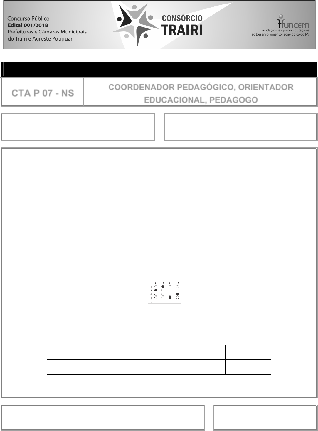 Caderno de Provas CTA P 07 - NS COORDENADOR PEDAGÓGICO, ORIENTADOR EDUCACIONAL, PEDAGOGO Edital Nº. 01/2018 – Prefeituras e Câmaras Municipais do Trairi e Agreste Potiguar 21 de outubro de 2018 INSTRUÇÕES GERAIS PARA A REALIZAÇÃO DA PROVA Use apenas caneta esferográfica azul ou preta. Escreva o seu nome completo e o número do seu documento de identificação no espaço indicado nesta capa. A prova terá duração máxima de 3 (três) horas, incluindo o tempo para responder a todas as questões do Caderno de Provas e preencher as Folhas de Respostas. Antes de retirar‐se definitivamente da sala, entregue as Folhas de Respostas ao fiscal. O Caderno de Provas só poderá ser levado pelo candidato após o encerramento do prazo estabelecido para a sua aplicação. Este Caderno de Provas contém, respectivamente, 10 (dez) questões de Língua Portuguesa, 20 (vinte) de Conhecimentos Específicos. Se o Caderno de Provas contiver alguma imperfeição gráfica que impeça a leitura, comunique isso imediatamente ao Fiscal. Cada questão de múltipla escolha apresenta apenas uma resposta correta. Para a marcação da alternativa escolhida na Folha de Respostas, pinte completamente o campo correspondente conforme a figura a seguir: Os rascunhos e as marcações feitas neste Caderno de Provas não serão considerados para efeito de avaliação. Interpretar as questões faz parte da avaliação; portanto, não adianta pedir esclarecimentos aos Fiscais. O preenchimento das Folhas de Respostas é de sua inteira responsabilidade. A quantidade de questões e respectivas pontuações desta prova estão apresentadas a seguir: Disciplina Número de questões Pontos Língua Portuguesa (Objetivas) 10 questões 30 pontos Conhecimentos Específicos (Objetivas) 20 questões 70 pontos Total de questões 30 questões 100 pontos NOME COMPLETO: DOCUMENTO DE IDENTIFICAÇÃO: _________________________ CONCURSO PÚBLICO – PREFEITURAS E CÂMARAS MUNICIPAIS DO TRAIRI/AGRESTE POTIGUAR EDITAL Nº. 001/2018 Prefeituras e Câmaras Municipais do Trairi/Agreste Potiguar – Concurso Público - 2018 1 QUESTÕES DE MÚLTIPLA ESCOLHA LÍNGUA PORTUGUESA NÍVEL SUPERIOR O texto abaixo servirá de base para as questões 1 e 2. Noção de erro de português é afetada pela ideia de que, vista do passado, toda evolução é corrupção Aldo Bizzocchi Somos um povo que adora discutir a própria língua. E quando o fazemos, um dos assuntos que invariavelmente vêm à baila é a famigerada questão do erro gramatical. Muito se tem debatido a respeito, e a suposta existência de erros em nossa fala (bem como na escrita) ensejou até o surgimento de uma nova profissão, por sinal lucrativa, a de consultor gramatical. Igualmente, peritos no assunto têm mantido com sucesso colunas em jornais, sites, programas de rádio ou televisão com o propósito de ensinar as pessoas a falar corretamente o seu próprio idioma. Isso porque, segundo o diagnóstico catastrofista desses entendidos, nunca se falou tão mal o português como agora, nossa língua caminha inelutavelmente para a ruína e a dissolução, já não se escreve mais como antigamente, e toda uma interminável cantilena de rabugices. (...) É preciso, então, definir claramente o que é o erro em matéria de língua. É evidente que, se um estrangeiro tentando falar português disser “O meu mulher ser muito bonita”, cometerá um erro, a ponto de se poder dizer que isso não é português. Da mesma forma, quando cometemos um lapsus linguae, isto é, um equívoco involuntário do qual temos consciência, estamos diante de um erro linguístico. Mas o que se costuma chamar de “erro de português” é uma expressão linguística que nada tem de acidental, já que é sistemática e, geralmente, proferida por pessoas de menor nível escolar e socioeconômico, embora possa ocorrer até nos mais altos escalões da sociedade. Para a linguística, que é a ciência da linguagem humana, esse fenômeno não pode ser chamado de erro. Se a língua é um sistema de signos que se articulam segundo leis definidas para permitir a comunicação e o pensamento humanos, toda expressão linguística, mesmo a das pessoas iletradas, cumpre esse papel com eficiência. (...) A maioria dos chamados erros constitui, na verdade, um uso linguístico inadequado à situação de comunicação. Para entendermos melhor essa inadequação, vamos fazer uma analogia entre a língua que falamos e a roupa que usamos. Ninguém em sã consciência vai a uma cerimônia de formatura de camiseta e bermudas tampouco vai à praia de terno. Assim como há uma roupa adequada a cada ocasião, há uma forma de expressão linguística, chamada registro ou nível de linguagem, adequada a cada situação de discurso. (...) Mas e aquelas pessoas que moram na periferia ou na zona rural e dizem “pobrema”, “cardeneta” ou “puliça”, elas não estão falando errado? Do ponto de vista normativo, sim. Mas, como disse, a gramática normativa só se aplica a situações e ambientes formais. O registro deve, antes de tudo, estar adequado ao contexto social da comunicação. Pessoas que vivem num meio de baixa escolaridade e pronunciam “pobrema” estão adaptadas ao seu habitat. Se você duvida, experimente entrar numa favela do Rio vestindo roupa social e vá conversar com os traficantes usando linguagem de magistrado para ver o que lhe acontece. Não estou dizendo com isso que o linguajar das pessoas não-escolarizadas deva ser incentivado. É evidente que, como cidadãos, devemos lutar para acabar com a pobreza e a ignorância. Nesse sentido, não apenas pronunciar “pobrema” é errado; morar em favelas ou andar maltrapilho é muito mais. No entanto, muitos brasileiros moram em barracos ou na rua e só têm uma roupa – muitas vezes esfarrapada – para vestir e só um registro para falar. Sua fala é pobre como é pobre a sua existência, tanto física quanto mental. O imaginário da classe média idealiza es