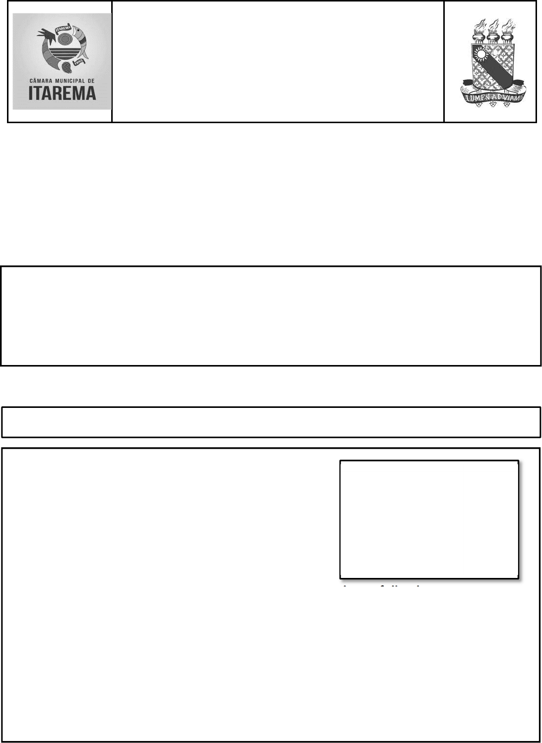 Câmara Municipal de Itarema Gabinete da Presidência Fundação Universidade Estadual do Ceará – FUNECE Comissão Executiva do Vestibular – CEV Concurso Público de Provas para Provimento de Cargos Efetivos na Câmara Municipal de Itarema Edital Nº 01/2018 – CMI, de 16 de outubro de 2018 PROVA OBJETIVA Nível Fundamental DATA DA APLICAÇÃO: 09 DE DEZEMBRO DE 2018 DURAÇÃO: 3 HORAS INÍCIO: 9 HORAS TÉRMINO: 12 HORAS ATENÇÃO! Este Caderno de Prova contém: Língua Portuguesa – 10 questões; Matemática – 10 questões; Conhecimentos Gerais – 10 questões. Ao sair definitivamente da sala, o candidato deverá assinar a folha de presença e entregar ao fiscal de mesa: a FOLHA DE RESPOSTAS preenchida e assinada; o CADERNO DE PROVA. IMPORTANTE! SERÁ ATRIBUÍDA NOTA ZERO, NA PROVA, AO CANDIDATO QUE NÃO ENTREGAR SUA FOLHA DE RESPOSTAS. OUTRAS INFORMAÇÕES PARA A REALIZAÇÃO DA PROVA ENCONTRAM-SE NO VERSO DESTA PÁGINA. Após receber sua folha de respostas, copie, nos locais apropriados, uma vez com letra cursiva e outra, com letra de forma, a seguinte frase: Educa-se com bons exemplos. NÚMERO DO GABARITO Marque, no local indicado na folha de respostas, o número 1, que é o número do gabarito deste caderno de prova. Essa informação também se encontra no rodapé de cada página. Nome: _____________________________________________________ Data de Nascimento: __________________ Nome de sua mãe: ________________________________________________________________________________ Assinatura: __________________________________________________________________ Sala Nº_________ CÂMARA MUNICIPAL DE ITAREMA – UNIVERSIDADE ESTADUAL DO CEARÁ – COMISSÃO EXECUTIVA DO VESTIBULAR CONCURSO PÚBLICO DE PROVAS PARA PROVIMENTO DE CARGOS EFETIVOS NA CÂMARA MUNICIPAL DE ITAREMA PROVA OBJETIVA REALIZADA EM 09 DE DEZEMBRO DE 2018 O número do gabarito deste caderno de prova é 1. Página 2 LEIA COM ATENÇÃO! INSTRUÇÕES PARA A REALIZAÇÃO DA PROVA 1. O candidato deverá verificar se seu caderno de prova, com 30 questões, está completo ou se há falhas ou imperfeições gráficas que causem qualquer dúvida. A CEV poderá não aceitar reclamações após 30 minutos do início da prova. 2. O candidato deverá preencher os campos em branco da capa da prova, com as devidas informações. 3. A folha de respostas será o único documento válido para a correção da prova. Ao recebê-la, o candidato deverá verificar se seu nome e número de inscrição estão corretos. Se houver discrepância, deverá comunicar imediatamente ao fiscal de sala. 4. A folha de respostas não deverá ser amassada nem dobrada, para que não seja rejeitada pela leitora óptica. 5. Após receber a folha de respostas, o candidato deverá ler as instruções nela contidas e seguir as seguintes rotinas: a. copiar, no local indicado, duas vezes, uma vez com letra cursiva e outra, com letra de forma, a frase que consta na capa do caderno de prova; b. marcar, na folha de respostas, pintando completamente, com caneta transparente de tinta azul ou preta, o interior do círculo correspondente ao número do gabarito que consta no caderno de prova; c. assinar a folha de respostas 2 (duas) vezes. 6. As respostas deverão ser marcadas, na folha de respostas, seguindo as mesmas instruções da marcação do número do gabarito (item 5 b), indicando a letra da alternativa de sua opção. É vedado o uso de qualquer outro material para marcação das respostas. Será anulada a resposta que contiver emenda ou rasura, apresentar mais de uma alternativa assinalada por questão, ou, ainda, aquela que, devido à marcação, não for identificada pela leitura eletrônica, uma vez que a correção da prova se dá por meio eletrônico. 7. O preenchimento de todos os campos da folha de respostas da Prova Objetiva será da inteira responsabilidade do candidato. Não haverá substituição da folha de respostas por erro do candidato. 8. Será eliminado do Concurso Público de Provas da Câmara Municipal de Itarema o candidato que se enquadrar, dentre outras, em pelo menos uma das condições seguintes: a. não marcar, na folha de respostas, o número do gabarito de seu caderno de prova, desde que não seja possível a identificação de tal número; b. não assinar a folha de respostas; c. marcar, na folha de respostas, mais de um número de gabarito, desde que não seja possível a identificação do número correto do gabarito do caderno de prova; d. fizer, na folha de respostas, no espaço destinado à marcação do número do gabarito de seu caderno de prova, emendas, rasuras, marcação que impossibilite a leitura eletrônica, ou fizer sinais gráficos ou qualquer outra marcação que não seja a exclusiva indicação do número do gabarito de seu caderno de prova. 9. Para garantia da segurança, é proibido ao candidato copiar o gabarito em papel, na sua roupa ou em qualquer parte de seu corpo. No entanto, o gabarito oficial preliminar e o enunciado das questões da prova estarão disponíveis na página da CEV/UECE (www.uece.br), a partir das 14 horas do dia 10 de dezembro de 2018 e a imagem completa de sua folha de respostas estará disponível a partir das 17 horas do dia 14 de dezembro de 2018. 10. Qualquer forma de comunicação entre candidatos implicará a sua eliminação do Concurso Público de Provas da Câmara Municipal de Itarema. 11. Por medida de segurança, não será permitido ao candidato, durante a realização da prova, portar, dentro da sala de prova, nos corredores ou nos banheiros: armas, aparelhos eletrônicos, gravata, chaves, chaveiro, controle de alarme de veículos, óculos (excetuando-se os de grau), caneta (excetuando-se aquela fabricada em material transparente, de tinta de cor azul ou preta), lápis, lapiseira, borracha, corretivo e objetos de qualquer natureza (moedas, clips, grampos, cartões magnéticos, carteira de cédulas, lenços, papeis, anotações, panfletos, lanches, etc.) que estejam nos b