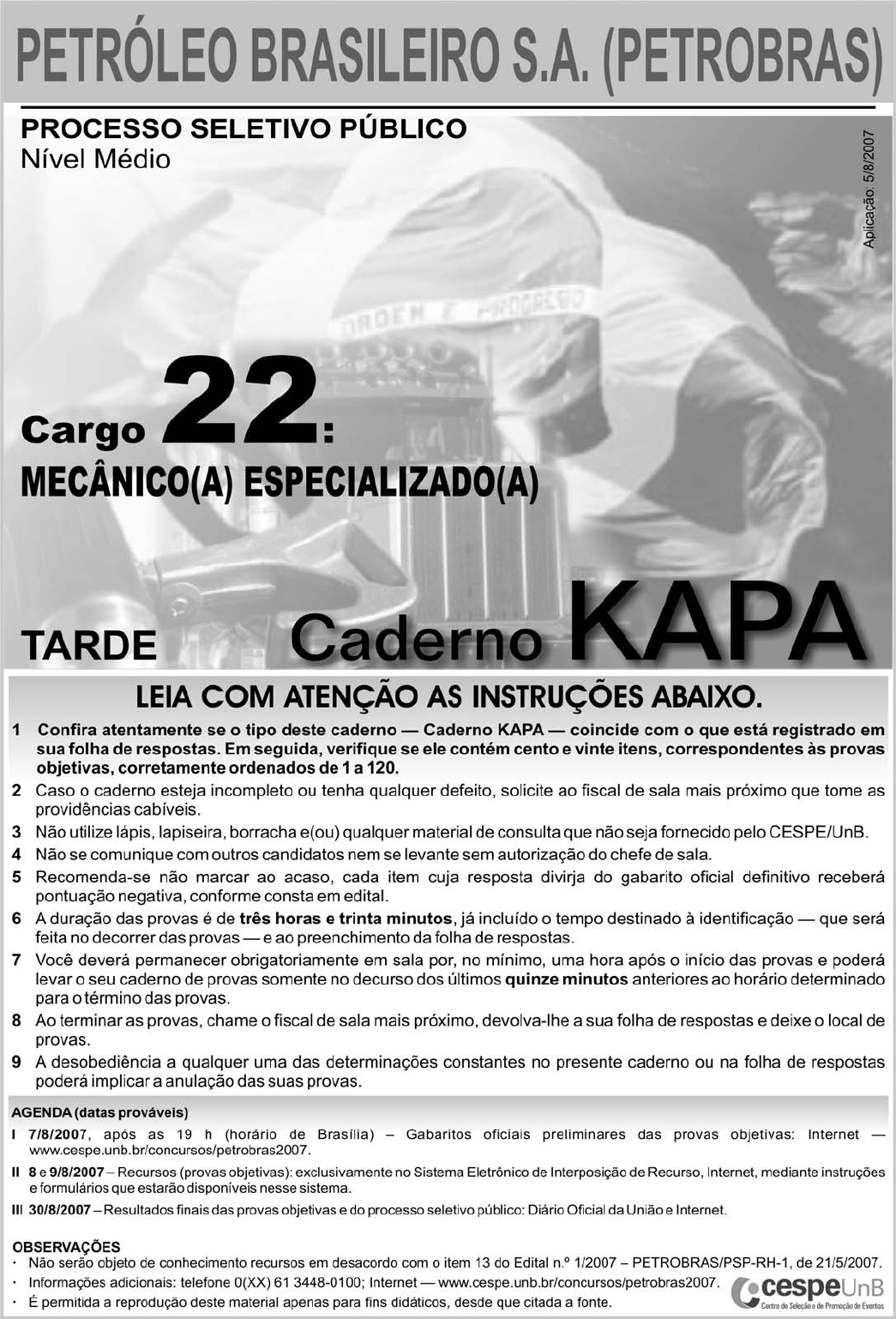 UnB/CESPE – PETROBRAS Caderno KAPA Cargo 22: Mecânico(a) Especializado(a) – 1 – De acordo com o comando a que cada um dos itens de 1 a 120 se refira, marque, na folha de respostas, para cada item: o campo designado com o código C, caso julgue o item CERTO; ou o campo designado com o código E, caso julgue o item ERRADO. A ausência de marcação ou a marcação de ambos os campos não serão apenadas, ou seja, não receberão pontuação negativa. Para as devidas marcações, use a folha de respostas, único documento válido para a correção das suas provas. CONHECIMENTOS BÁSICOS Na coletiva de imprensa que antecedeu o batismo1 da P-52, o diretor de Produção e Exploração da PETROBRAS, Guilherme Estrella, destacou o índice de nacionalização da obra e falou sobre os projetos da empresa.4 “A P-52 é um marco na história da PETROBRAS e da recuperação da capacidade construtiva do setor naval brasileiro. É a primeira plataforma a ser concluída no Brasil após a decisão7 do presidente Lula, à época candidato, de que tudo que pudesse ser construído no Brasil seria feito aqui, a começar pelas plataformas da PETROBRAS. Hoje tornamos isso realidade.10 A P-52 é mais uma plataforma que colocamos em operação. De 2006 até 2011, temos mais de 60 grandes projetos a serem instalados no Brasil. Isso vai nos garantir a sustentação definitiva13 da auto-suficiência conquistada em 2005.” Internet: <www2.petrobras.com.br>. Em relação ao texto acima, julgue os itens a seguir. 1 As vírgulas logo após “PETROBRAS” (R.2) e “Estrella” (R.3) isolam aposto. 2 Mantém-se a correção gramatical do texto ao se substituir o trecho ‘do setor naval brasileiro. É a primeira plataforma’ (R.6-7) por do setor naval brasileiro, uma vez que é a primeira plataforma. 3 As informações do texto deixam pressuposta a idéia de que a capacidade construtiva do setor naval brasileiro sempre esteve em plena atividade. 4 Na expressão ‘vai nos garantir’ (R.13), o uso do pronome no plural indica a inserção, no texto, do autor, do leitor e dos brasileiros em geral. 5 Pelas informações do texto, infere-se que os 60 grandes projetos a serem instalados no Brasil dependem da sustentação definitiva da auto-suficiência em petróleo. Ao entrar em capacidade máxima de operação, a unidade1 P-52, que é do tipo semi-submersível, poderá processar 180 mil barris de petróleo e comprimir 9,3 milhões de metros cúbicos de gás natural por dia. Integrante do programa de desenvolvimento4 do Campo de Roncador, na Bacia de Campos, a P-52 ficará ancorada em uma profundidade de 1.800 metros e será interligada a 29 poços (18 produtores e 11 injetores de água).7 O escoamento da produção de petróleo e gás natural será feito por dutos submarinos. Idem, ibidem. Com base no texto acima, julgue os próximos itens. 6 Na linha 2, as vírgulas isolam oração de natureza restritiva. 7 De acordo com as informações do texto, a plataforma P-52 já está operando em sua capacidade máxima de produção. 8 Em “ficará ancorada em uma profundidade” (R.6), a substituição de “em” por a mantém a correção gramatical do período. 9 Na linha 7, a substituição dos parênteses por um travessão logo após “poços” mantém correta a pontuação do período. 10 Na linha 8, a expressão verbal “será feito” está no singular para concordar com “gás natural”. Nos itens a seguir, os fragmentos constituem trechos sucessivos de um texto. Julgue-os quanto à grafia das palavras e à acentuação gráfica. 11 Há exatamente um ano foi concluída a operação mais delicada do empreendimento da plataforma P-52: a união dos módulos da parte superior ao casco. 12 A operação, poucas vezes realizada no mundo devido à extrema complexidade, era inédita no país e foi concluida em 24 horas, o que confirma a capacitação da engenharia naval brasileira e a excelencia da PETROBRAS em tecnologia de águas profundas. 13 Terminada a obra, a P-52 passará pela etapa de testes e ajustes e será levada para a Bacia de Campos para ancorajem e interligação de poços. 14 O início das operações no Campo de Roncador está previsto para setembro deste ano. Na obra, iniciada em maio de 2004, utilizou-se processo inédito no país e foram gerados 2.500 empregos diretos e 10 mil indiretos. 15 A unidade P-52, cujo custo total foi de cerca de US$ 1 bilhão, foi a primeira a atender aos novos requisitos de nacionalização, com um índice de 76%, e acrescentará 180 mil barris/dia à produção nacional, o que contribuirá para a manutenção da auto-suficiência. Itens adaptados de Internet: <www2.petrobras.com.br>. Nos itens que se seguem, os fragmentos constituem trechos sucessivos de um texto. Julgue-os quanto à correção gramatical. 16 O patrocínio da PETROBRAS ao Pan 2007 é um dos pontos culminantes da histórica parceria entre a Companhia e o esporte. 17 Os objetivos do patrocínio, porém, não se restringe à contribuição para o desenvolvimento do esporte nacional. 18 Também contribuíram decisivamente fatores como o grande impacto social do evento, tanto na criação de empregos na fase de construção da infra-estrutura necessária quanto no envolvimento de vários setores na comercialização de produtos e serviços durante e após o Pan. 19 O valor do investimento chega à 65 milhões em mídia e patrocínio direto, além de R$ 5,8 milhões em dois anos para a Confederação Brasileira de Handebol. 20 A PETROBRAS sempre esteve perto do esporte olímpico brasileiro e não poderia estar fora do maior evento das Américas. Além disso, estarão com sua marca exposta em toda América Latina, que é um mercado em expansão para a PETROBRAS. Itens adaptados de Internet: <www.noticiaspetrobras.com.br>. UnB/CESPE – PETROBRAS Caderno KAPA Cargo 22: Mecânico(a) Especializado(a) – 2 – Por ser uma versão continental dos Jogos Olímpicos, o1 Pan é o mais importante evento esportivo d