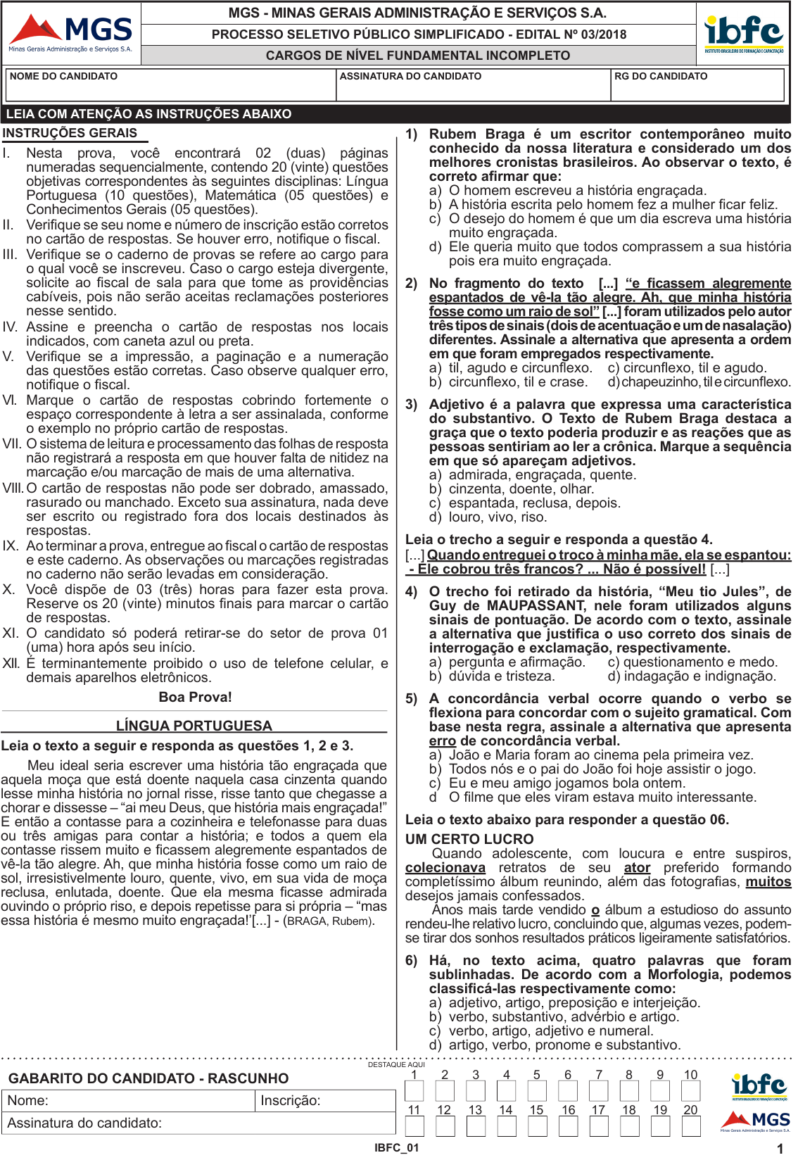 1IBFC_01 DESTAQUE AQUI MGS - MINAS GERAIS ADMINISTRAÇÃO E SERVIÇOS S.A. CARGOS DE NÍVEL FUNDAMENTAL INCOMPLETO NOME DO CANDIDATO ASSINATURA DO CANDIDATO RG DO CANDIDATO INSTRUÇÕES GERAIS I. Nesta prova, você encontrará 02 (duas) páginas numeradas sequencialmente, contendo 20 (vinte) questões objetivas correspondentes às seguintes disciplinas: Língua Portuguesa (10 questões), Matemática (05 questões) e Conhecimentos Gerais (05 questões). II. Verifique se seu nome e número de inscrição estão corretos no cartão de respostas. Se houver erro, notifique o fiscal. III. Verifique se o caderno de provas se refere ao cargo para o qual você se inscreveu. Caso o cargo esteja divergente, solicite ao fiscal de sala para que tome as providências cabíveis, pois não serão aceitas reclamações posteriores nesse sentido. IV. Assine e preencha o cartão de respostas nos locais indicados, com caneta azul ou preta. V. Verifique se a impressão, a paginação e a numeração das questões estão corretas. Caso observe qualquer erro, notifique o fiscal. VI. Marque o cartão de respostas cobrindo fortemente o espaço correspondente à letra a ser assinalada, conforme o exemplo no próprio cartão de respostas. VII. O sistema de leitura e processamento das folhas de resposta não registrará a resposta em que houver falta de nitidez na marcação e/ou marcação de mais de uma alternativa. VIII. O cartão de respostas não pode ser dobrado, amassado, rasurado ou manchado. Exceto sua assinatura, nada deve ser escrito ou registrado fora dos locais destinados às respostas. IX. Ao terminar a prova, entregue ao fiscal o cartão de respostas e este caderno. As observações ou marcações registradas no caderno não serão levadas em consideração. X. Você dispõe de 03 (três) horas para fazer esta prova. Reserve os 20 (vinte) minutos finais para marcar o cartão de respostas. XI. O candidato só poderá retirar-se do setor de prova 01 (uma) hora após seu início. XII. É terminantemente proibido o uso de telefone celular, e demais aparelhos eletrônicos. Boa Prova! LEIA COM ATENÇÃO AS INSTRUÇÕES ABAIXO 1 2 3 4 5 6 7 8 9 10 11 12 13 14 15 16 17 18 19 20 PROCESSO SELETIVO PÚBLICO SIMPLIFICADO - EDITAL Nº 03/2018 LÍNGUA PORTUGUESA Leia o texto a seguir e responda as questões 1, 2 e 3. Meu ideal seria escrever uma história tão engraçada que aquela moça que está doente naquela casa cinzenta quando lesse minha história no jornal risse, risse tanto que chegasse a chorar e dissesse – “ai meu Deus, que história mais engraçada!” E então a contasse para a cozinheira e telefonasse para duas ou três amigas para contar a história; e todos a quem ela contasse rissem muito e ficassem alegremente espantados de vê-la tão alegre. Ah, que minha história fosse como um raio de sol, irresistivelmente louro, quente, vivo, em sua vida de moça reclusa, enlutada, doente. Que ela mesma ficasse admirada ouvindo o próprio riso, e depois repetisse para si própria – “mas essa história é mesmo muito engraçada!’[...] - (BRAGA, Rubem). 1) Rubem Braga é um escritor contemporâneo muito conhecido da nossa literatura e considerado um dos melhores cronistas brasileiros. Ao observar o texto, é correto afirmar que: a) O homem escreveu a história engraçada. b) A história escrita pelo homem fez a mulher ficar feliz. c) O desejo do homem é que um dia escreva uma história muito engraçada. d) Ele queria muito que todos comprassem a sua história pois era muito engraçada. 2) No fragmento do texto [...] “e ficassem alegremente espantados de vê-la tão alegre. Ah, que minha história fosse como um raio de sol” [...] foram utilizados pelo autor três tipos de sinais (dois de acentuação e um de nasalação) diferentes. Assinale a alternativa que apresenta a ordem em que foram empregados respectivamente. a) til, agudo e circunflexo. c) circunflexo, til e agudo. b) circunflexo, til e crase. d) chapeuzinho, til e circunflexo. 3) Adjetivo é a palavra que expressa uma característica do substantivo. O Texto de Rubem Braga destaca a graça que o texto poderia produzir e as reações que as pessoas sentiriam ao ler a crônica. Marque a sequência em que só apareçam adjetivos. a) admirada, engraçada, quente. b) cinzenta, doente, olhar. c) espantada, reclusa, depois. d) louro, vivo, riso. Leia o trecho a seguir e responda a questão 4. [...] Quando entreguei o troco à minha mãe, ela se espantou: - Ele cobrou três francos? ... Não é possível! [...] 4) O trecho foi retirado da história, “Meu tio Jules”, de Guy de MAUPASSANT, nele foram utilizados alguns sinais de pontuação. De acordo com o texto, assinale a alternativa que justifica o uso correto dos sinais de interrogação e exclamação, respectivamente. a) pergunta e afirmação. c) questionamento e medo. b) dúvida e tristeza. d) indagação e indignação. 5) A concordância verbal ocorre quando o verbo se flexiona para concordar com o sujeito gramatical. Com base nesta regra, assinale a alternativa que apresenta erro de concordância verbal. a) João e Maria foram ao cinema pela primeira vez. b) Todos nós e o pai do João foi hoje assistir o jogo. c) Eu e meu amigo jogamos bola ontem. d O filme que eles viram estava muito interessante. Leia o texto abaixo para responder a questão 06. UM CERTO LUCRO Quando adolescente, com loucura e entre suspiros, colecionava retratos de seu ator preferido formando completíssimo álbum reunindo, além das fotografias, muitos desejos jamais confessados. Anos mais tarde vendido o álbum a estudioso do assunto rendeu-lhe relativo lucro, concluindo que, algumas vezes, podem- se tirar dos sonhos resultados práticos ligeiramente satisfatórios. 6) Há, no texto acima, quatro palavras que foram sublinhadas. De acordo com a Morfologia, podemos classificá-las respectivamente como: a) adjetivo, artigo, preposição e interjeição. b) verbo, substantivo, advérbio e artigo. c) verbo, artigo