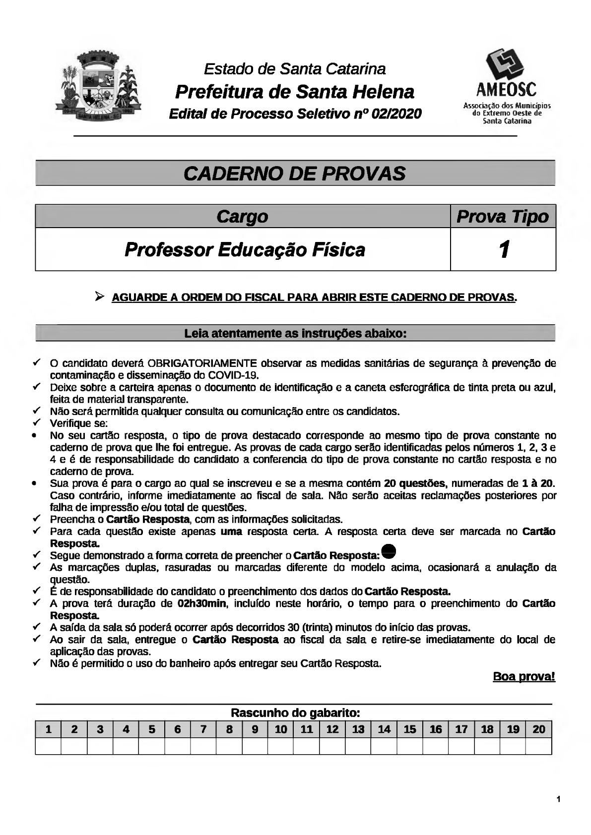 \ \ \ \ • • \ \ Estado de Santa Catarina Prefeitura de Santa Helena Editai de Processo Seletivo n° 02/2020 AMEOSC Associação dos Municípios do Extremo Oeste de Santa Catarina CADERNO DE PROVAS Cargo Prova Tipo Professor Educação Física 1 > AGUARDE A ORDEM DO FISCAL PARA ABRIR ESTE CADERNO DE PROVAS. Leia atentamente as instruções abaixo: s O candidato deverá OBRIGATORIAMENTE observar as medidas sanitárias de segurança à prevenção de contaminação e disseminação do COVID-19. S Deixe sobre a carteira apenas o documento de identificação e a caneta esferográfica de tinta preta ou azul, feita de material transparente. Não será permitida qualquer consulta ou comunicação entre os candidatos. Verifique se: No seu cartão resposta, o tipo de prova destacado corresponde ao mesmo tipo de prova constante no caderno de prova que lhe foi entregue. As provas de cada cargo serão identificadas pelos números 1, 2, 3 e 4 e é de responsabilidade do candidato a conferência do tipo de prova constante no cartão resposta e no caderno de prova. Sua prova é para o cargo ao qual se inscreveu e se a mesma contém 20 questões, numeradas de 1 à 20. Caso contrário, informe imediatamente ao fiscal de sala. Não serão aceitas reclamações posteriores por falha de impressão e/ou total de questões. Preencha o Cartão Resposta, com as informações solicitadas. Para cada questão existe apenas uma resposta certa. A resposta certa deve ser marcada no Cartão Resposta. ^ Segue demonstrado a forma correta de preencher o Cartão Resposta: w As marcações duplas, rasuradas ou marcadas diferente do modelo acima, ocasionará a anulação da questão. S É de responsabilidade do candidato o preenchimento dos dados do Cartão Resposta. ■s A prova terá duração de 02h30min, incluído neste horário, o tempo para o preenchimento do Cartão Resposta S A saída da sala só poderá ocorrer após decorridos 30 (trinta) minutos do início das provas. * Ao sair da sala, entregue o Cartão Resposta ao fiscal da sala e retire-se imediatamente do local de aplicação das provas. s Não é permitido o uso do banheiro após entregar seu Cartão Resposta. Boa prova! Rascunho do gabarito: 1 2 3 4 5 6 7 8 9 10 11 12 13 14 15 16 17 18 19 20 1 Estado de Santa Catarina Prefeitura de Santa Helena Edital de Processo Seletivo n° 01/2020 AMEOSC Associação dos Municípios do Extremo Oeste de Santa Catarina Conhecimentos Específicos Questão 01 Tony Istarque e acabou machucando o braço. Como a queda aparentemente foi grave, o professor ficou com forte suspeita de que o aluno tenha fraturado o braço, nesse caso o professor deve, EXCETO: (A) Tentar endireitar o braço e pôr o osso no lugar, afim de amenizar a dor que o aluno está sentindo. (B) Aguardar o auxílio médico. Caso não seja possível, recomenda-se levar a vítima para o pronto-socorro mais próximo. (C) Manter o membro afetado em repouso, numa posição natural e confortável. (D) Se possível e tiver o conhecimento necessário imobilizar as articulações que ficam acima e abaixo da lesão. Questão 02 Letramento e alfabetização muitas vezes são interpretados e entendidos como sinônimos. É compreensivo esse equívoco, tendo em vista que esses conceitos caminham juntos, em especial nos anos escolares iniciais. Ocorre que, cada um tem suas especificidades e não são a mesma coisa. Acerca desses conceitos preencha os parênteses, utilizando (1) para LETRAMENTO e (2) para ALFABETIZAÇÃO. (__)Processo em que a criança aprende a decodificar os elementos que compõem a escrita. (__)Desenvolvimento de competências quanto à memorização do alfabeto, o reconhecimento das letras, a ligação entre sílabas e formação das palavras, utilizando-as na leitura e na escrita. (__)Capacidade e competência que o sujeito adquire a partir de uma função social da leitura e da escrita. (__)Diz respeito a um conceito mais amplo, além da aprendizagem de letras e símbolos escritos. (__)Refere-se a compreensão, interpretação e uso da língua nas práticas sociais. A sequência CORRETA está na letra: (A) 1,1, 2, 1,2. (B) 2, 2, 1,1,1. (C) 2, 2, 1,2, 1. (D) 1, 1,2, 2, 2. Questão 03 No atletismo a modalidade decatlo é uma competição composta por dez provas. Em relação as provas, marque a alternativa que apresenta duas modalidades que NÃO fazem parte do decatlo: (A) 200 metros rasos e salto triplo. (B) 400 metros rasos e 110 metros barreiras. (C) Lançamento de disco e salto com vara. (D) Arremesso de peso e salto em altura. Questão 04 Os Parâmetros Curriculares Nacionais indicam como objetivos do ensino fundamental que os alunos sejam capazes de, EXCETO: (A) Posicionar-se de maneira acrítica, responsável e construtiva nas diferentes situações sociais, utilizando o diálogo como forma de mediar conflitos e de tomar decisões coletivas. (B) Conhecer características fundamentais do Brasil nas dimensões sociais, materiais e culturais como meio para construir progressivamente a noção de identidade nacional e pessoal e o sentimento de pertinência ao País. (C) Compreender a cidadania como participação social e política, assim como exercício de direitos e deveres políticos, civis e sociais, adotando, no dia-a-dia, atitudes de solidariedade, cooperação e repúdio às injustiças, respeitando o outro e exigindo para si o mesmo respeito. (D) Conhecer e valorizar a pluralidade do patrimônio sociocultural brasileiro, bem como aspectos socioculturais de outros povos e nações, posicionando-se contra qualquer discriminação baseada em diferenças culturais, de classe social, de crenças, de sexo, de etnia ou outras características individuais e sociais. Questão 05 A Educação Física Escolar pode e deve se apropriar das modalidades esportivas e suas regras como conteúdo a serem trabalhados, muito embora não deva ser esse o principal foco de abordagem nas aulas. Em uma aula de Educação Física a professora explicando sobre as regr