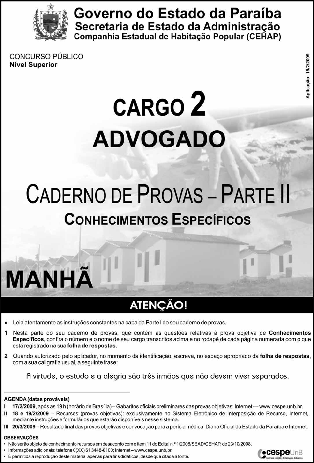 UnB/CESPE – SEAD/CEHAP/PB Cargo 2: Advogado – 1 – Nas questões de 21 a 50, marque, para cada uma, a única opção correta, de acordo com o respectivo comando. Para as devidas marcações, use a folha de respostas, único documento válido para a correção das suas provas. CONHECIMENTOS ESPECÍFICOS QUESTÃO 21 A expressão bens públicos é constituída por duas palavras equívocas. Uma é o substantivo bem, outra é o adjetivo público. O vocábulo bem pode ter, por exemplo, ora uma acepção filosófica, ora um sentido jurídico. Em termos filosóficos, é tudo aquilo que satisfaz o homem. Nessa acepção, diz-se que a inteligência, a bondade, a saúde e o amor são bens. Em sentido jurídico, é todo valor material ou imaterial que pode ser objeto de direito. Assim, afirma-se que uma gleba de terra, um crédito, um semovente e um livro são bens. A palavra público, de outro lado, tanto pode expressar o proprietário do bem (União, estado- membro, Distrito Federal, município) como seu usuário (administrado, povo, público). Desse modo, pode-se ter: 1) bem público = bem de propriedade do município; 2) bem público = bem usado pelo povo. Diógenes Gasparini. Direito Administrativo. 13.ª ed. São Paulo: Saraiva, 2008, p. 864 (com adaptações). Tendo o texto acima como referência inicial e acerca dos bens públicos e da legislação correlata, assinale a opção correta. A Quanto à destinação, os bens públicos se classificam em uso comum do povo, dominicais e de uso especial. No primeiro, prevalece a destinação pública, ou seja, os bens são utilizados diretamente pelos membros da coletividade. Já os de uso especial são os bens pertencentes às pessoas jurídicas de direito público a que se tenha dado estrutura de direito privado. B Os bens públicos devem ser desafetados caso a administração resolva aliená-los. Não pode o poder público, contudo, desafetar um bem de uso comum para construir no local o edifício sede da prefeitura. C Para que o poder público promova a alienação de um bem público, é exigido por lei que seja realizada licitação na modalidade de concorrência. Essa exigência se mantém como regra na hipótese de alienação de bem imóvel a órgãos da administração direta e entidades autárquicas e fundacionais. D A dispensa da licitação para a locação de imóvel destinado ao atendimento das finalidades precípuas da administração, cujas necessidades de instalação e localização condicionem a sua escolha, é legítima, desde que o preço do bem seja compatível com o valor de mercado, segundo avaliação prévia. QUESTÃO 22 No processo de urbanização de determinada área, o estado da Paraíba contratou a empresa TERRAPLAN para a execução dos serviços de terraplanagem. Durante a execução do contrato, a administração verificou que era grande a demanda por moradia na região. Assim, resolveu celebrar termo aditivo para aumentar a área beneficiada pelos serviços, o que ocasionaria um acréscimo de 22% no valor do contrato. Considerando a situação hipotética apresentada, assinale a opção correta. A A empresa TERRAPLAN pode se negar a celebrar o termo aditivo e, consequentemente, a executar o serviço adicional, uma vez que a modificação do contrato depende da vontade de ambos os contratantes. B A empresa TERRAPLAN terá de executar o serviço adicional independentemente de sua vontade, porquanto os contratos administrativos podem ser alterados unilateralmente pela administração quando necessário o acréscimo no quantitativo do objeto. Esse acréscimo, contudo, não pode superar em 25% o valor inicialmente previsto no contrato. C Consoante com a lei, no contrato administrativo, as partes podem, em comum acordo, aumentar ou diminuir ilimitadamente o quantitativo inicialmente contratado, em atenção ao princípio da liberdade contratual. D Caso a TERRAPLAN não execute o contrato na forma em que pactuado, a administração poderá rescindi-lo unilateralmente, executar a garantia contratual, mas não poderá reter os créditos decorrentes do contrato nem aplicar qualquer sanção à empresa. UnB/CESPE – SEAD/CEHAP/PB Cargo 2: Advogado – 2 – QUESTÃO 23 As parcerias público-privadas (PPPs) abrem oportunidade para ampliar a participação do setor privado na provisão de serviços, em especial no setor de infraestrutura, potencializando ganhos de eficiência e desoneração dos contribuintes. Constituem, assim, instrumento fundamental para ampliar os investimentos públicos. O sucesso do programa de PPP depende da adequada modelagem dos projetos, identificando com clareza os benefícios líquidos associados e sua sustentabilidade financeira. Internet: <www.tesouro.fazenda.gov.br> (com adaptações). Considerando o texto acima e o tema da descentralização dos serviços públicos, assinale a opção correta. A Enquanto as concessões comuns, reguladas por lei, são divididas em concessões de serviço público simples e concessões de serviço público precedidas de execução de obra pública, as PPPs se dividem em concessão patrocinada e concessão administrativa. B A celebração de contrato de PPP, qualquer que seja o valor envolvido na contratação, é autorizada por lei. C Como os serviços públicos objeto de concessão e de permissão são prestados por pessoas jurídicas de direito privado, os danos causados por estas aos usuários dos serviços devem ser reparados, desde que comprovados o nexo de causalidade e a culpa da concessionária/ permissionária na ocorrência do evento danoso. D A doutrina brasileira é unânime ao afirmar que, caso a concessionária não tenha condições financeiras de reparar o dano por ela causado ao usuário dos serviços prestados, o lesado somente poderá cobrar da pessoa jurídica de direito público interno que transferiu a execução dos serviços se comprovar que esse ente público concorreu para a ocorrência do evento danoso. Dessa forma, a responsabilida