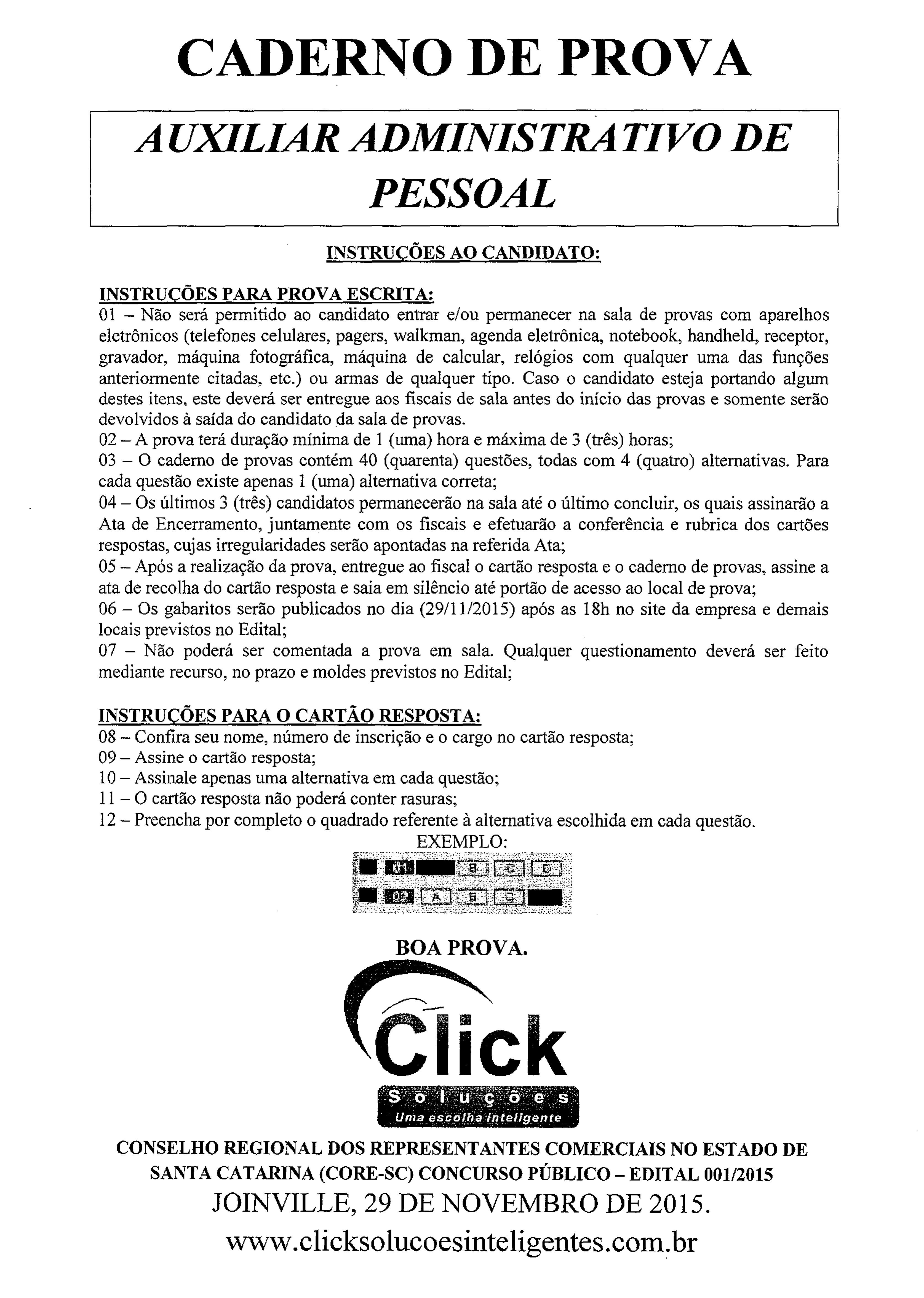 CADERNO DE PROVA A UXILIAR ADMINISTRA TI VO DE PESSOAL INSTRUÇÕES AO CANDIDATO: INSTRUÇÕES PARA PROVA ESCRITA: 01 - Não será permitido ao candidato entrar e/ou permanecer na sala de provas com aparelhos eletrônicos (telefones celulares, pagers, walkman, agenda eletrônica, notebook, handheld, receptor, gravador, máquina fotográfica, máquina de calcular, relógios com qualquer uma das funções anteriormente citadas, etc.) ou armas de qualquer tipo. Caso o candidato esteja portando algum destes itens, este deverá ser entregue aos fiscais de sala antes do início das provas e somente serão devolvidos à saída do candidato da sala de provas* 02 - A prova terá duração mínima de 1 (uma) hora e máxima de 3 (três) horas; 0 3 - 0 caderno de provas contém 40 (quarenta) questões, todas com 4 (quatro) alternativas* Para cada questão existe apenas 1 (uma) alternativa correta; 04 - Os últimos 3 (três) candidatos permanecerão na sala até o último concluir, os quais assinarão a Ata de Encerramento, juntamente com os fiscais e efetuarão a conferência e rubrica dos cartões respostas, cujas irregularidades serão apontadas na referida Ata; 05 - Após a realização da prova, entregue ao fiscal o cartão resposta e o caderno de provas, assine a ata de recolha do cartão resposta e saia em silêncio até portão de acesso ao local de prova; 06 - Os gabaritos serão publicados no dia (29/11/2015) após as 18h no site da empresa e demais locais previstos no Edital; 07 - Não poderá ser comentada a prova em sala* Qualquer questionamento deverá ser feito mediante recurso, no prazo e moldes previstos no Edital; INSTRUÇÕES PARA O CARTÃO RESPOSTA: 08 - Confira seu nome, número de inscrição e o cargo no cartão resposta; 09 - Assine o cartão resposta; 10 - Assinale apenas uma alternativa em cada questão; 1 1 - 0 cartão resposta não poderá conter rasuras; 12 - Preencha por completo o quadrado referente à alternativa escolhida em cada questão. EXEMPLO: BOA PROVA. CONSELHO REGIONAL DOS REPRESENTANTES COMERCIAIS NO ESTADO DE SANTA CATARINA (CORE-SC) CONCURSO PÚBLICO - EDITAL 001/2015 JOINVILLE, 29 DE NOVEMBRO DE 2015. www.clicksolucoesinteligentes.com.br http://www.clicksolucoesinteligentes.com.br P á g i n a j l CONHECIMENTOS GERAIS - LÍNGUA PORTUGUESA 01) A ortografia se caracteriza por estabelecer padrões para a forma escrita das palavras. Essa escrita está relacionada tanto a critérios etimológicos (ligados à origem das palavras) quanto fonológicos (ligados aos fonemas r representados). E importante compreender que a ortografia é fruto de uma convenção. A forma de grafar as palavras é produto de acordos ortográficos que envolvem os diversos países em que a língua portuguesa é oficial. Indique a alínea que contém um erro de ortografia: A) beleza, princesa, francesa. B) esplêndido, meteorologia, hesitar. C) cabeleireiro, consciencioso, manteigueira. D) estrupar, pretensioso, deslizar. 02) Indique a alternativa cujos verbos preenchem adequadamente as lacunas abaixo. “Assim que forem ________ os documentos e __________os problemas, será______________ a razão das grandes despesas em nossa repartição”. A) lidos, resolvidos, discutida. B) lidos, resolvidos, discutido. C) lidos, resolvida, discutidas. D) lido, discutido, discutida. 03) A parte da população mundial que ascendeu _____ classe média na últimas décadas passou _____comprar mais,_____ um ritmo acelerado, o que coloca em risco a sustentabilidade do planeta. As lacunas da frase acima estarão corretamente preenchidas, respectivamente, por: A) à ~ à - a. B) à - a - à. C) à - a - a. D) a - a - à. 04) Marque a opção em que a forma verbal está INCORRETA: A) Paralisia - paralisar, B) comércio - comercializar. C) ironia - ironizar. D) catequese - catequisar. 05) Assinale a alternativa em que todas as palavras seguem a mesma regra de acentuação. A) ângulo, mágico, tóxico, câmera. B) paletó, dó, sapê, jiló, maré, cajá. C) Pátria, júri, país, pó, cômico. D) balaústre, órgão, tórax, patê. 06) Em: Ele chegou à conclusão de que a secretária passou o dia inteiro na internet. De igual maneira, a ocorrência da crase em destaque na frase acima, justifica-se na alínea: A) e chegou então à usar a internet em demasia. B) e chegou à tempo de presenciar o uso exagerado. C) e chegou à uma conclusão precipitada. D) e chegou finalmente à inevitável conclusão. 07) O B R A SIL É UMA M ARAVILHA. NÃO TEM D E MUDAR NADA. DO OU ê LOUCO OU 3 E IT O QUE E S T Á , TÁ É SANOUEIROÍ BOM DEM AISl } Em: O Brasil é uma maravilha. Indique a classificação morfológica de cada palavra na ordem em que aparecem: A) artigo _ substantivo _ verbo _ numeral _ advérbio. B) artigo _ substantivo _ verbo _ artigo _ substantivo. C) substantivo _ substantivo _ verbo _ artigo_ adjetivo. D) substantivo __ adjetivo __ advérbio _ artigo _ substantivo. 08) Em: “Alcançará a vitória com dedicação e empenho”. Indique o tempo e o modo da forma verbal destacada. A) Futuro do presente do modo indicativo. B) Futuro do pretérito do modo indicativo. C) Presente do modo indicativo. D) Presente do subjuntivo._____________________ CONHECIMENTOS GERAIS - NOÇÕES DE ______________INFORMÁTICA______________ 09) Analise as configurações dos computadores abaixo e selecione a alternativa que representa o computador com maior capacidade de armazenamento de dados: A) Processador 13, Memória RAM de 2Gb, Disco Rígido de 500Gb; B) Processador 15, Memória RAM de 4Gb, Disco Rígido de 160Gb; C) Processador 17, Memória RAM de 1Gb, Disco Rígido de 80Gb; D) Todas as configurações acima possuem um mesmo espaço de armazenamento de dados. 10) Sobre teclas de atalho e suas funções no Microsoft Word 2007, assinale a alternativa INCORRETA: A) Ctrl + N -> Negrito; B) Ctrl + A -> Abrir; C) Ctrl + S -> Substituir; D) Ctrl + L Localizar. 11) Assinale a alternativa que representa a função do botão abai