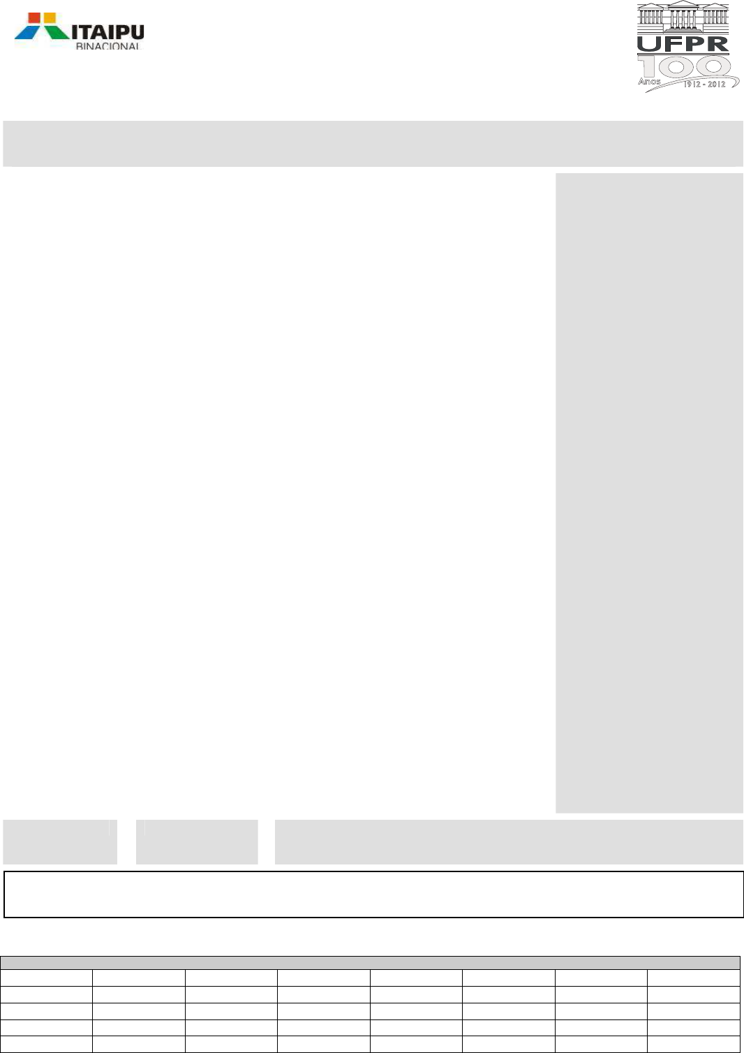Anos 206 – Técnico em Hidrologia I INSTRUÇÕES 1. Confira, abaixo, o seu número de inscrição, turma e nome. Assine no local indicado. 2. Aguarde autorização para abrir o caderno de prova. Antes de iniciar a resolução das questões, confira a numeração de todas as páginas. 3. A prova é composta de 40 questões objetivas. 4. Nesta prova, as questões objetivas são de múltipla escolha, com 5 alternativas cada uma, sempre na sequência a, b, c, d, e, das quais somente uma deve ser assinalada. 5. A interpretação das questões é parte do processo de avaliação, não sendo permitidas perguntas aos aplicadores de prova. 6. Ao receber o cartão-resposta, examine-o e verifique se o nome impresso nele corresponde ao seu. Caso haja qualquer irregularidade, comunique-a imediatamente ao aplicador de prova. 7. O cartão-resposta deverá ser preenchido com caneta esferográfica preta, tendo-se o cuidado de não ultrapassar o limite do espaço para cada marcação. 8. Não serão permitidos empréstimos, consultas e comunicação entre os candidatos, tampouco o uso de livros, apontamentos e equipamentos eletrônicos ou não, inclusive relógio. O não cumprimento dessas exigências implicará a eliminação do candidato. 9. Os aparelhos celulares deverão ser desligados e colocados OBRIGATORIAMENTE no saco plástico. Caso essa exigência seja descumprida, o candidato será excluído do concurso. 10. A duração da prova é de 4 horas. Esse tempo inclui a resolução das questões e a transcrição das respostas para o cartão-resposta. 11. Ao concluir a prova, permaneça em seu lugar e comunique ao aplicador de prova. Aguarde autorização para entregar o caderno de prova e o cartão-resposta. 12. Se desejar, anote as respostas no quadro abaixo, recorte na linha indicada e leve-o consigo. DURAÇÃO DESTA PROVA: 4 horas Conhecimento Específico NÚMERO DE INSCRIÇÃO TURMA NOME DO CANDIDATO ASSINATURA DO CANDIDATO ���� ............................................................................................................................................................................................................... RESPOSTAS 01 - 06 - 11 - 16 - 21 - 26 - 31 - 36 - 02 - 07 - 12 - 17 - 22 - 27 - 32 - 37 - 03 - 08 - 13 - 18 - 23 - 28 - 33 - 38 - 04 - 09 - 14 - 19 - 24 - 29 - 34 - 39 - 05 - 10 - 15 - 20 - 25 - 30 - 35 - 40 - ITAIPU – BINACIONAL Processo Seletivo – Edital n° 1001 Prova Objetiva – 27/02/2011 2 3 01 - Em Hidrologia, a evaporação E, a precipitação P e a vazão Q em uma bacia hidrográfica estão relacionadas por Q = P − E: a) em qualquer escala de tempo. b) na escala horária. c) na escala diária. d) na escala mensal. *e) na escala anual ou plurianual. 02 - Em uma bacia hidrográfica: a) não é possível a entrada de água subterrânea. b) é obrigatória a saída de água superficial pela calha do rio principal. c) o movimento da água em estado líquido se dá sob a ação da pressão. *d) o movimento da água em estado líquido se dá sob a ação da gravidade, da capilaridade e da pressão osmótica. e) não é possível a saída de água subterrânea. 03 - Em uma bacia hidrográfica de 250 km 2, durante 10 dias choveu um total de 56 mm, e a eva potranspiração acumulada foi de 16 mm. O volume total interceptado, infiltra do e escoado através da bacia foi: a) 1,0 × 106 L. b) 1,0 km3. c) 100.000,0 L. d) 0,10 km3. *e) 1,0 × 107 m3. 04 - Em uma bacia hidrográfica, o fluxo da substânci a H2O da atmosfera para a superfície da bacia ocorre: *a) nos estados líquido, sólido ou gasoso. b) no estado líquido apenas. c) nos estados líquido ou sólido apenas. d) nos estados líquido ou gasoso apenas. e) nos estados sólido ou gasoso apenas. 05 - A forma prática de se delimitar uma bacia hidr ográfica baseia-se em dados de: a) cobertura vegetal. *b) topografia. c) uso do solo. d) tipo de solo. e) chuva e vazão. 06 - Transpiração é o nome que se dá à transferênci a de vapor d’água da vegetação para a atmosfera, at ravés dos estômatos das plantas. A transpiração: a) é em geral controlada artificialmente. b) é nula durante a noite. c) é independente da velocidade do vento. *d) depende da umidade do solo. e) é medida rotineiramente em estações meteorológicas. 07 - A infiltração: a) se inicia após o fim da precipitação. *b) ocorre sempre que a capacidade de interceptação da chuva pela vegetação é excedida. c) ocorre da região não saturada do solo para os rios. d) cessa após a subida dos níveis d’água nas calhas. e) não é limitada pelo tipo e estrutura do solo. *08 - A água subterrânea: a) abastece as águas superficiais. b) não se conecta com as águas superficiais. c) não evapora. d) não ascende no solo. e) é abastecida pela chuva ou pelas águas superficiais. (*) – Questão anulada, portanto todos os candidatos serão pontuados. 09 - Em grandes rios, o escoamento é: a) supercrítico. b) subcrítico. *c) turbulento. d) laminar. e) permanente. 4 10 - A vazão volumétrica em uma seção de rio: a) é definida em um ponto da seção transversal. b) varia de ponto a ponto ao longo da seção transversal. c) é máxima na superfície do rio. *d) depende da distribuição de velocidades ao longo da seção transversal. e) é nula no fundo do rio. 11 - O número de Froude em uma seção de rio: *a) depende da vazão. b) varia entre 0 e 1. c) depende da viscosidade. d) é menor que 1 em escoamentos supercríticos. e) quando é maior que 1 impossibilita a medição de vazão. 12 - Sobre a fórmula de Manning, 2 / 3 1/ 20(1/ )V Sn R= , é correto afirmar: *a) O raio hidráulico R é função da geometria da seção transversal. b) O coeficiente de Manning n é adimensional. c) É preciso medir a velocidade V em cada ponto da seção transversal. d) É necessária para a medição de vazão com molinetes. e) É aplicável quando o número de Froude é menor do que 1, e o número de Reynolds maior que 2300.