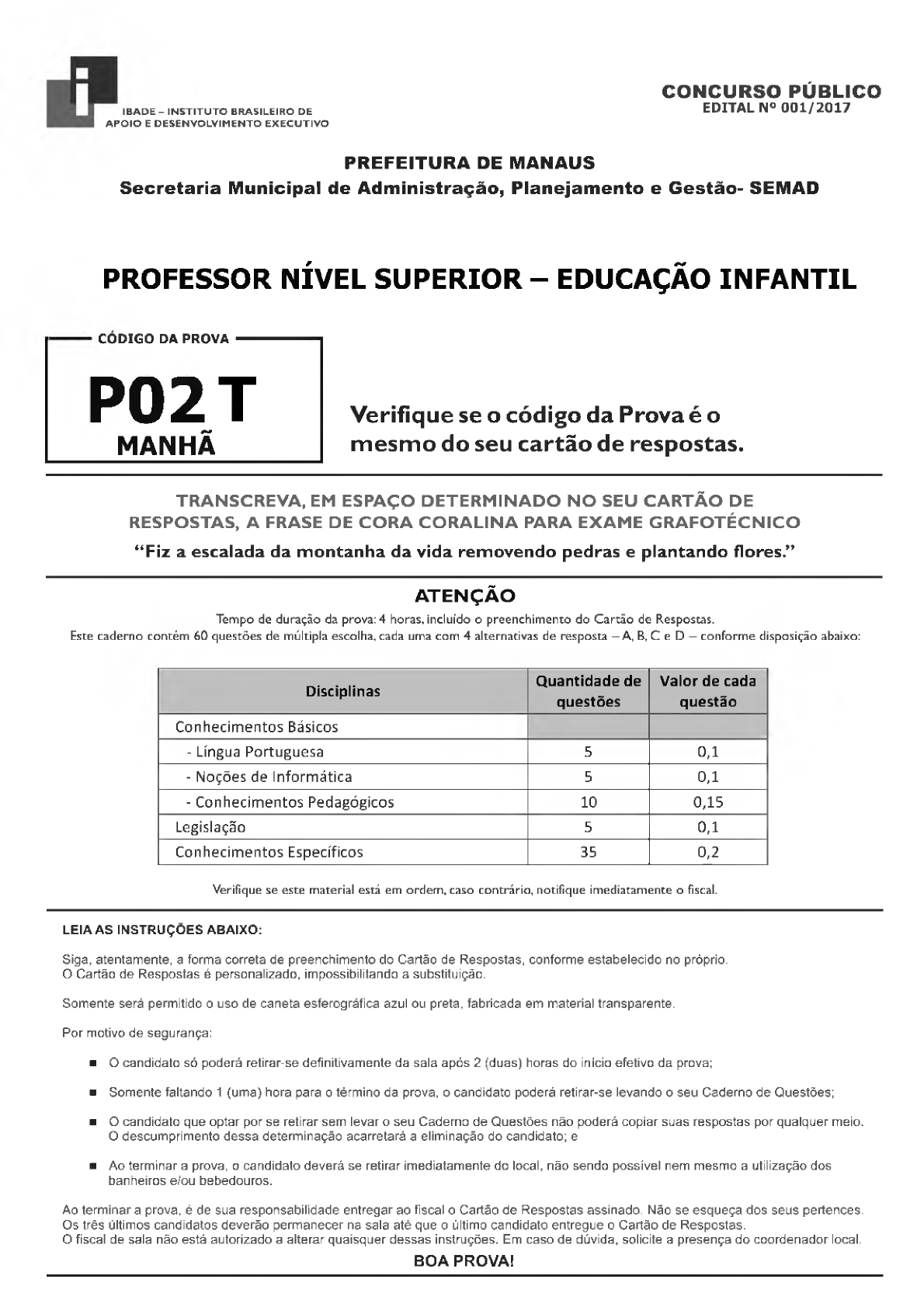 IBADE - IN S TITU TO BRASILEIRO DE A PO IO E DESENVOLVIMENTO EXECUTIVO C O NCURSO PÚ BLIC O EDITAL N° 001 /20 1 7 PREFEITURA DE MANAUS S ecretaria Municipal de Adm inistração, P lanejam ento e Gestão- SEMAD PROFESSOR NÍVEL SUPERIOR - EDUCAÇÃO INFANTIL CODIGO DA PROVA P02T MANHÃ Verifique se o código da Prova é o m esm o do seu cartão de respostas. TRANSCREVA, EM ESPAÇO DETERMINADO NO SEU CARTÃO DE RESPOSTAS, A FRASE DE CORA CORALINA PARA EXAME GRAFOTÉCNICO “Fiz a escalada da montanha da vida removendo pedras e plantando flores.” ATENÇÃO Tempo de duração da prova: 4 horas, incluído o preenchimento do Cartão de Respostas. Este caderno contém 60 questões de múltipla escolha, cada uma com 4 alternativas de resposta — A, B, C e D — conforme disposição abaixo: Disciplinas Quantidade de questões Valor de cada questão C onhec im en tos Básicos - Língua Portuguesa 5 0,1 - Noções de In fo rm á tica 5 0,1 - C onhec im en tos Pedagógicos 10 0,15 Legislação 5 0,1 C onhec im en tos Específicos 35 0,2 Verifique se este material está em ordem, caso contrário, notifique imediatamente o fiscal. LEIA AS INSTRUÇÕES ABAIXO: Siga, atentamente, a forma correta de preenchimento do Cartão de Respostas, conforme estabelecido no próprio. O Cartão de Respostas é personalizado, impossibilitando a substituição. Somente será permitido o uso de caneta esferográfica azul ou preta, fabricada em material transparente. Por motivo de segurança: ■ O candidato só poderá retirar-se definitivamente da sala após 2 (duas) horas do início efetivo da prova; ■ Somente faltando 1 (uma) hora para o término da prova, o candidato poderá retirar-se levando o seu Caderno de Questões; ■ O candidato que optar por se retirar sem levar o seu Caderno de Questões não poderá copiar suas respostas por qualquer meio. O descumprimento dessa determinação acarretará a eliminação do candidato; e ■ Ao terminar a prova, o candidato deverá se retirar imediatamente do local, não sendo possível nem mesmo a utilização dos banheiros e/ou bebedouros. Ao terminar a prova, é de sua responsabilidade entregar ao fiscal o Cartão de Respostas assinado. Não se esqueça dos seus pertences. Os três últimos candidatos deverão permanecer na sala até que o último candidato entregue o Cartão de Respostas. O fiscal de sala não está autorizado a alterar quaisquer dessas instruções. Em caso de dúvida, solicite a presença do coordenador local. BOA PROVA! Ç CONHECIMENTOS BÁSICOS ) Ç - Língua Portuguesa ) Texto para responder às questões de 01 a 05. Homem no mar De minha varanda vejo, entre árvores e telhados, o mar. Não há ninguém na praia, que resplende ao sol. O vento é nordeste, e vai tangendo, aqui e ali, no belo azul das águas, pequenas espumas que marcham alguns segundos e morrem, como bichos alegres e humildes; perto da terra a onda é verde. Mas percebo um movimento em um ponto do mar; é um homem nadando. Ele nada a uma certa distância da praia, em braçadas pausadas e fortes; nada a favor das águas e do vento, e as pequenas espumas que nascem e somem parecem ir mais depressa do que ele. Justo: espumas são leves, não são feitas de nada, toda sua substância é água e vento e luz, e o homem tem sua carne, seus ossos, seu coração, todo seu corpo a transportar na água. Ele usa os músculos com uma calma energia; avança. Certamente não suspeita de que um desconhecido o vê o admira porque ele está nadando na praia deserta. Não sei de onde vem essa admiração, mas encontro nesse homem uma nobreza calma, sinto-me solidário com ele, acompanho o seu esforço solitário como se ele estivesse cumprindo uma bela missão. Já nadou em minha presença uns trezentos metros; antes, não sei; duas vezes o perdi de vista, quando ele passou atrás das árvores, mas esperei com toda confiança que reaparecesse sua cabeça, e o movimento alternado de seus braços. Mais uns cinquenta metros, e o perderei de vista, pois um telhado o esconderá. Que ele nade bem esses cinquenta ou sessenta metros; isto me parece importante; é preciso que conserve a mesma batida de sua braçada, e que eu o veja desaparecer assim como o vi aparecer, no mesmo rumo, no mesmo ritmo, forte, lento, sereno. Será perfeito; a imagem desse homem me faz bem. É apenas a imagem de um homem, e eu não poderia saber sua idade, nem sua cor, nem os traços de sua cara. Estou solidário com ele, e espero que ele esteja comigo. Que ele atinja o telhado vermelho, e então eu poderei sair da varanda tranquilo, pensando — “vi um homem sozinho, nadando no mar; quando o vi ele já estava nadando; acompanhei-o com atenção durante todo o tempo, e testemunho que ele nadou sempre com firmeza e correção; esperei que ele atingisse um telhado vermelho, e ele o atingiu” . Agora não sou mais responsável por ele; cumpri o meu dever, e ele cumpriu o seu. Admiro-o. Não consigo saber em que reside, para mim, a grandeza de sua tarefa; ele não estava fazendo nenhum gesto a favor de alguém, nem construindo algo de útil; mas certamente fazia uma coisa bela, e a fazia de um modo puro e viril. Não desço para ir esperá-lo na praia e lhe apertar a mão; mas dou meu silencioso apoio, minha atenção e minha estima a esse desconhecido, a esse nobre animal, a esse homem, a esse correto irmão. BRAGA, Rubem. Homem no mar. In: SANTOS, Joaquim Ferreira dos (Org.). As cem melhores crônicas brasileiras. Rio de Janeiro: Objetiva, 2007, pp. 110-111 (Questão 01 )--------------------------------------------------------- Sobre o texto leia as afirmativas a seguir. I. A tranquilidade que o primeiro parágrafo da crônica transmite ao leitor é quebrada no segundo parágrafo. II. No terceiro parágrafo, o narrador descreve o nado do homem e a aversão que começa a nutrir por ele. III. O narrador torce pelo bom desempenho do nadador, embora não perceba nele firmeza e correção. Está correto apenas o que se afirma e