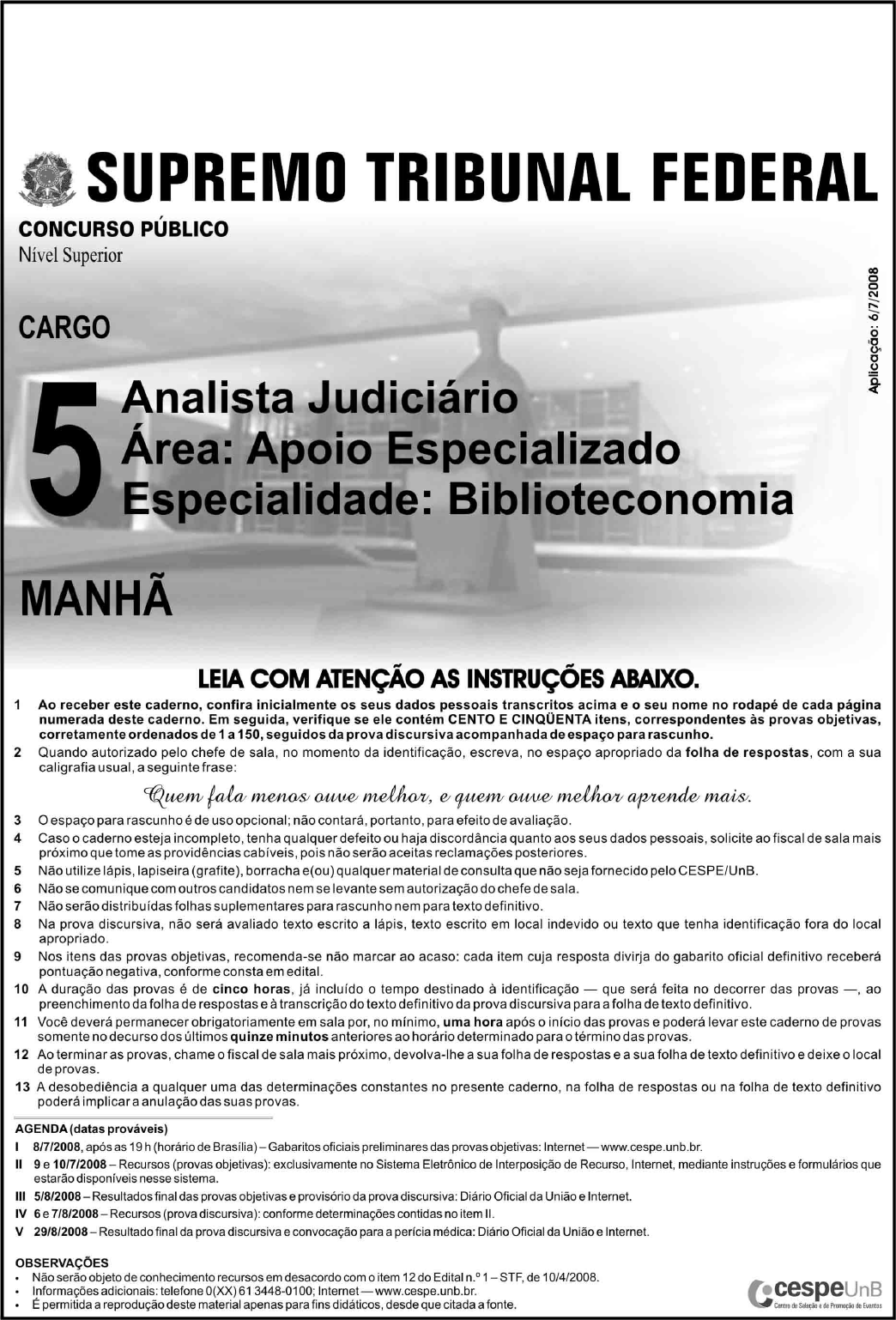 UnB/CESPE – STF Cargo 5: Analista Judiciário – Área: Apoio Especializado – Especialidade: Biblioteconomia – 1 – • De acordo com o comando a que cada um dos itens de 1 a 150 se refira, marque, na folha de respostas, para cada item: o campo designado com o código C, caso julgue o item CERTO; ou o campo designado com o código E, caso julgue o item ERRADO. A ausência de marcação ou a marcação de ambos os campos não serão apenadas, ou seja, não receberão pontuação negativa. Para as devidas marcações, use a folha de respostas, único documento válido para a correção das suas provas. • Nos itens que avaliam Noções de Informática, a menos que seja explicitamente informado o contrário, considere que todos os programas mencionados estão em configuração-padrão, em português, que o mouse está configurado para pessoas destras e que expressões como clicar, clique simples e clique duplo referem-se a cliques com o botão esquerdo do mouse. Considere também que não há restrições de proteção, de funcionamento e de uso em relação aos programas, arquivos, diretórios, recursos e equipamentos mencionados. • Sempre que utilizadas, as siglas subseqüentes devem ser interpretadas com a significação associada a cada uma delas, da seguinte forma: DF = Distrito Federal; STF = Supremo Tribunal Federal; STJ = Superior Tribunal de Justiça. CONHECIMENTOS BÁSICOS Hoje o sistema isola, atomiza o indivíduo. Por isso1 seria importante pensar as novas formas de comunicação. Mas o sistema também nega o indivíduo. Na economia, por exemplo, mudam-se os valores de uso concreto e qualitativo4 para os valores de troca geral e quantitativa. Na filosofia aparece o sujeito geral, não o indivíduo. Então, a diferença é uma forma de crítica. Afirmar o indivíduo, não no sentido7 neoliberal e egoísta, mas no sentido dessa idéia da diferença é um argumento crítico. Em virtude disso, dessa discussão sobre a filosofia e o social surgem dois momentos10 importantes: o primeiro é pensar uma comunidade auto- reflexiva e confrontar-se, assim, com as novas formas de ideologia. Mas, por outro lado, a filosofia precisa da13 sensibilidade para o diferente, senão repetirá apenas as formas do idêntico e, assim, fechará as possibilidades do novo, do espontâneo e do autêntico na história. Espero que16 seja possível um diálogo entre as duas posições em que ninguém tem a última palavra. Miroslav Milovic. Comunidade da diferença. Relume Dumará, p. 131-2 (com adaptações). Com referência às idéias e às estruturas lingüísticas do texto acima, julgue os itens a seguir. 1 Depreende-se do texto que “pensar as novas formas de comunicação” (R.2) significa isolar ou atomizar o indivíduo. 2 Preservando-se a correção gramatical do texto, bem como sua coerência argumentativa, a forma verbal “mudam-se” (R.4) poderia ser empregada também no singular. 3 O conectivo “Então” (R.6) estabelece uma relação de tempo entre as idéias expressas em duas orações. 4 A partir do desenvolvimento das idéias do texto, conclui-se que a palavra “crítico” (R.9) está sendo empregada como crucial, perigoso. 5 O emprego de “Em virtude disso” (R.9) mostra que, imediatamente antes do termo “o social” (R.10) está subtendida a preposição de, que, se fosse explicitada, teria de ser empregada sob a forma do. 6 A expressão “por outro lado” (R.13) explicita a caracterização do segundo dos “dois momentos importantes” (R.10-11). 7 Como o último período sintático do texto se inicia pela idéia de possibilidade, a substituição do verbo “tem” (R.18) por tenha, além de preservar a correção gramatical do texto, ressaltaria o caráter hipotético do argumento. O agente ético é pensado como sujeito ético, isto é,1 como um ser racional e consciente que sabe o que faz, como um ser livre que escolhe o que faz e como um ser responsável que responde pelo que faz. A ação ética é4 balizada pelas idéias de bem e de mal, justo e injusto, virtude e vício. Assim, uma ação só será ética se consciente, livre e responsável e será virtuosa se realizada em conformidade7 com o bom e o justo. A ação ética só é virtuosa se for livre e só o será se for autônoma, isto é, se resultar de uma decisão interior do próprio agente e não de uma pressão externa.10 Evidentemente, isso leva a perceber que há um conflito entre a autonomia da vontade do agente ético (a decisão emana apenas do interior do sujeito) e a heteronomia dos valores13 morais de sua sociedade (os valores são dados externos ao sujeito). Esse conflito só pode ser resolvido se o agente reconhecer os valores de sua sociedade como se tivessem16 sido instituídos por ele, como se ele pudesse ser o autor desses valores ou das normas morais, pois, nesse caso, ele será autônomo, agindo como se tivesse dado a si mesmo sua19 própria lei de ação. Marilena Chaui. Uma ideologia perversa. In: Folhaonline, 14/3/1999 (com adaptações). Julgue os seguintes itens, a respeito da organização das estruturas lingüísticas e das idéias do texto acima. 8 Depreende-se do texto que “agente” e “sujeito”, ambos na linha 1, não são sinônimos, embora possam remeter ao mesmo indivíduo. 9 De acordo com as relações argumentativas do texto, se uma ação não for “virtuosa” (R.7), ela não resulta de decisão interior; se não for “ética” (R.6), ela não será consciente, livre e responsável. 10 É pela acepção do verbo levar, em “leva a perceber” (R.11), que se justifica o emprego da preposição “a” nesse trecho, de tal modo que, se for empregado o substantivo correspondente a “perceber”, percepção, a preposição continuará presente e será correto o emprego da crase: à percepção. 11 Os sinais de parênteses nas linhas de 12 a 15 têm a função de organizar as idéias que destacam e de inseri-las na argumentação do texto; por isso, sua substi