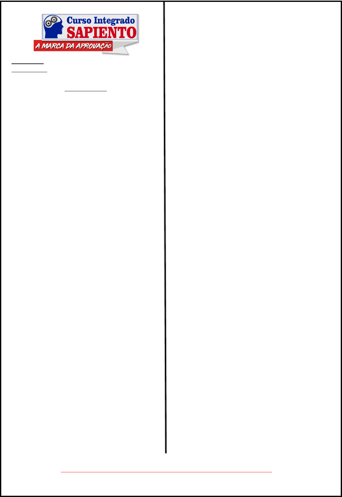 CURSO INTEGRADO SAPIENTO – ESPECIALISTA EM CONCURSOS PÚBLICOS AV. PANTALEÃO RODRIGUES DE CARVALHO, N-477, SALGUEIRO PE - FONE: 3871 2906 1 DISCIPLINA: MATEMÁTICA PROFESSOR: RICARDO AUGUSTO EXERCÍCIOS 01. Todos os habitantes de um determinado municí- pio devem receber uma carta da prefeitura, entregue em mãos, mediante assinatura de um protocolo. Para realizar o trabalho de distribuição dessas cartas, a prefeitura contratou pessoas que serão remuneradas por número de entregas realizadas. Cada contratado recebeu um lote de 255 cartas a serem entregues. Sua remuneração se dará da seguinte maneira: para as primeiras 128 cartas, receberá um real por carta en- tregue; para as 64 seguintes, receberá 2 reais por carta entregue; para as 32 seguintes, 4 reais por carta, e assim por diante, dobrando-se a remuneração, por carta entregue, para o cumprimento de metade da parte da tarefa que acabou de realizar, de modo que pela entrega da última carta receberá 128 reais. O nú- mero mínimo de cartas que um contratado deve en- tregar para receber pelo menos 500 reais é: a) 225. b) 213. c) 247. d) 239. e) 231. 02. Dez funcionários possuem salários diferentes. Seus salários, em ordem crescente, são de R$ 2.000,00; R$ 2.100,00; R$ 2.200,00 e assim sucessiva- mente, sempre aumentando em R$ 100,00 em rela- ção ao anterior. O número mínimo desses funcioná- rios que devem ser sorteados ao acaso para que se tenha certeza de que os que não foram sorteados te- nham soma dos salários inferior a R$ 14.000,00 é igual a: a) nove. b) seis. c) cinco. d) sete. e) quatro. 3. Um corredor, preparando-se para uma maratona, decide iniciar um treinamento da seguinte forma: no primeiro dia, corre 5 km. No segundo dia, aumenta a distância percorrida em 0,2 km, correndo 5,2 km; do terceiro dia em diante, ele sempre aumenta a distân- cia percorrida em 0,2 km, relativamente ao dia ante- rior. Após um a certa quantidade de dias, o corredor atinge, pela primeira vez, a marca dos 22 km, o que ocorre no: a) 73º dia. b) 85º dia c) 74º dia. d) 86º dia. e) 95º dia. 4. Murilo planeja percorrer 90 km em 4 dias de cami- nhada. Ele vai percorrer, em cada um dos últimos três dias, o dobro da distância que percorreu no dia ante- rior. A diferença entre o total da distância que Murilo percorrerá no primeiro e quarto dias com o total da distância que percorrerá no segundo e terceiro dias será igual a: a) 18 km. b) 21 km. c) 28 km. d) 14 km. e) 24 km. 5. ada uma das sequências a seguir é formada por 20 termos. T (30, 33, 36, 39, ... , x) Q (157, 153, 149, 145, ... , y) Considerando os últimos três termos de cada uma dessas sequências, a soma entre os números do único par de termos iguais é: a) 162. b) 168. c) 170. d) 174. e) 178. 6. Um trecho de uma rodovia, do quilômetro 75 ao quilômetro 141, terá o asfalto renovado. Por isso, de- verão ser fixadas placas de sinalização informando os motoristas sobre as obras. Será colocada uma placa no início e outra no final do trecho. As demais serão posicionadas de forma que a distância entre duas pla- cas consecutivas seja sempre de 3 quilômetros. Nes- sas condições, o número total de placas de sinalização que deverão ser encomendadas pelo órgão compe- tente é igual a: a) 21. b) 20. c) 22. d) 24. e) 23. 7. Em um experimento, uma planta recebe a cada dia 5 gotas a mais de água do que havia recebido no dia anterior. Se no 65° dia ela recebeu 374 gotas de água, no 1° dia do experimento ela recebeu: a) 64 gotas. b) 49 gotas. c) 59 gotas. d) 44 gotas. e) 54 gotas. 8. Taís recebe diariamente certa quantidade de fichas que são colocadas em um mesmo fichário vazio no início do expediente. Ao final do expediente, Solange retira todas as fichas colocadas por Taís no fichário. Sabe-se que o fichário tem capacidade máxima para 110 fichas, e que Taís recebe 2 fichas no primeiro dia, 5 fichas no segundo dia, 8 fichas no terceiro dia, e as- sim sucessivamente (sempre recebendo 3 fichas a mais do que no dia anterior). Sendo assim, a capaci- dade desse fichário será suficiente até, no máximo, o: a) 46º dia. b) 51º dia. c) 37º dia. d) 29º dia. e) 43º dia. CURSO INTEGRADO SAPIENTO – ESPECIALISTA EM CONCURSOS PÚBLICOS AV. PANTALEÃO RODRIGUES DE CARVALHO, N-477, SALGUEIRO PE - FONE: 3871 2906 2 9. As peças de um jogo estão todas dentro de um saco opaco. Elas vêm em 4 formatos diferentes e cada peça está numerada com um número dentre os se- guintes: 1, 2, 3, 4 ou 5. A menor quantidade de peças que devem ser retiradas aleatoriamente do saco para garantir que se tenha, após a retirada, pelo menos 4 peças de um mesmo formato e 3 peças com a mesma numeração é: a) 15. b) 10. c) 24. d) 18. e) 13. 10. Ana e Beatriz são as únicas mulheres que fazem parte de um grupo de 7 pessoas. O número de comis- sões de 3 pessoas que poderão ser formadas com es- sas 7 pessoas, de maneira que Ana e Beatriz não es- tejam juntas em qualquer comissão formada, é igual a: a) 20. b) 15. c) 30. d) 18. e) 25. 11. Os quatro funcionários de uma repartição traba- lham cada um em uma mesa, todos na mesma sala. O chefe da repartição determinou que os funcionários trocassem de mesa entre si. Os funcionários podem ser realocados na sala de modo que nenhum funcio- nário passe a ocupar a mesa que ocupava antes da realocação: a) de 4 maneiras diferentes. b) de 24 maneiras diferentes. c) de 9 maneiras diferentes. d) de 6 maneiras diferentes. e) de 12 maneiras diferentes. 12. Uma determinada secretaria municipal conta com dois assessores (A1 e A2) e cinco supervisores (S1, S2, S3, S4 e S5). Deseja-se formar uma comissão formada por quatro membros, pelo menos um dos quais deve ser um assessor e os demais, supervisores. Ainda, se A1 for membro da comissão, S1 não deve ser. Nessas condições, podem ser formadas: a) 15 comissões diferentes. b) 30 comissões diferentes. c) 20 comissões diferentes. d) 44 comissões diferentes. e) 60 com