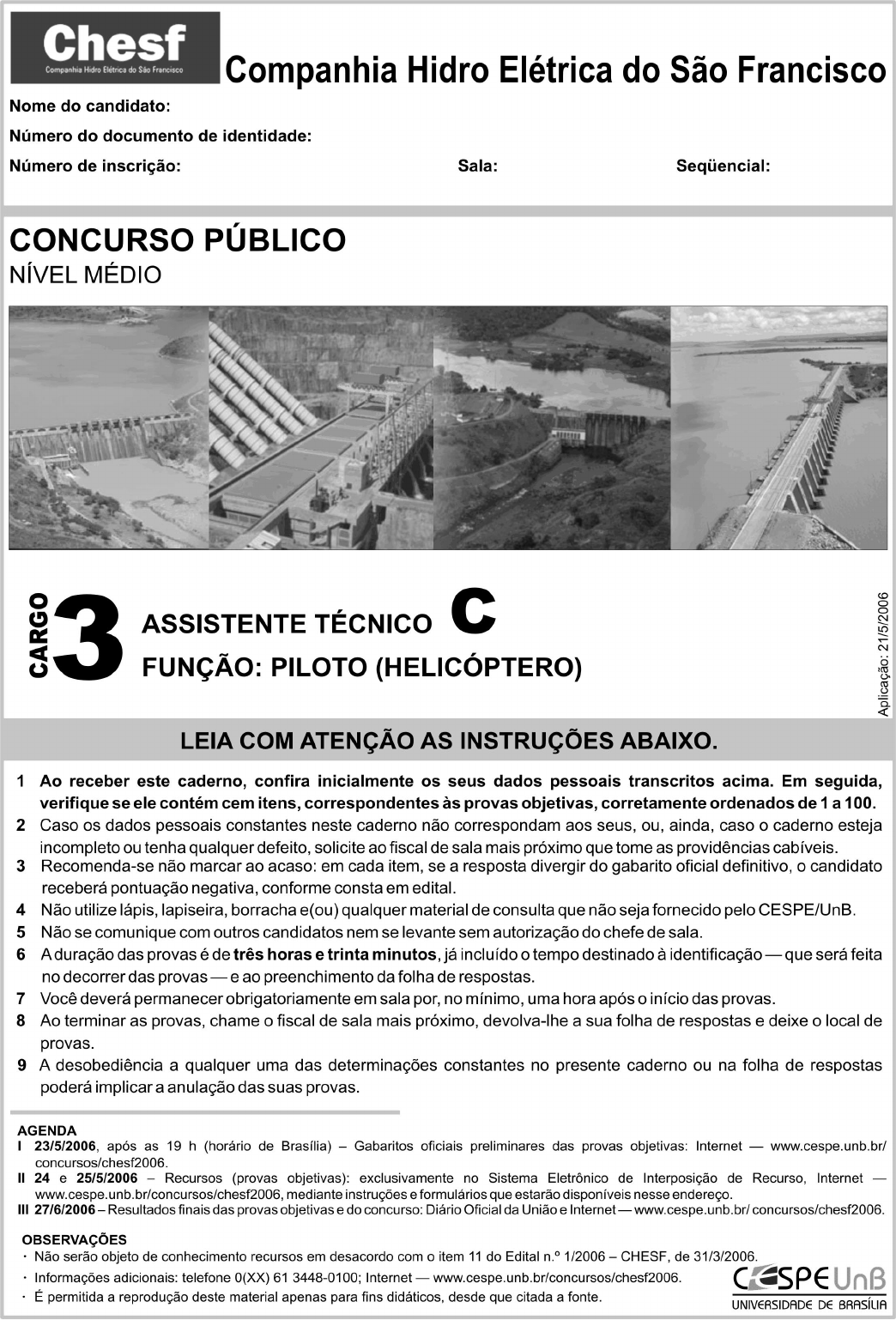 UnB/CESPE – CHESF / Nome do candidato: Cargo 3: Assistente Técnico C – Função: Piloto (Helicóptero) – 1 – • De acordo com o comando a que cada um dos itens de 1 a 100 se refira, marque, na folha de respostas, para cada item: o campo designado com o código C, caso julgue o item CERTO; ou o campo designado com o código E, caso julgue o item ERRADO. A ausência de marcação ou a marcação de ambos os campos não serão apenadas, ou seja, não receberão pontuação negativa. Para as devidas marcações, use, caso deseje, o rascunho acima e, posteriormente, a folha de respostas, único documento válido para a correção das suas provas. • Nos itens que avaliam Noções de Informática, a menos que seja explicitamente informado o contrário, considere que todos os programas mencionados estão em configuração-padrão, em português, que o mouse está configurado para pessoas destras e que expressões como clicar, clique simples e clique duplo referem-se a cliques com o botão esquerdo do mouse. Considere também que não há restrições de proteção, de funcionamento e de uso em relação aos programas, arquivos, diretórios e equipamentos mencionados. CONHECIMENTOS BÁSICOS Pesquisadores de Harvard propõem nova pirâmide alimentar Há mais de uma década, em 1992, o Departamento1 de Agricultura dos EUA (USDA) criou uma pirâmide alimentar que serviria como um guia de fácil consulta sobre alimentação saudável para a população. As idéias contidas4 nesse ícone, que já eram ensinadas nas escolas, inclusive no Brasil, disseminaram-se ainda mais. A Escola de Saúde Pública de Harvard, um dos maiores centros de estudos sobre7 saúde pública dos Estados Unidos, diz, no entanto, que as informações contidas nela estão ultrapassadas. Para atualizá-las, os especialistas de Harvard10 construíram uma nova pirâmide, que foi chamada de Pirâmide Alimentar Saudável. Na prática, a nova pirâmide sugerida por Harvard inverte a do USDA. O que estava, em13 1992, na base (massas, pães, arroz branco e batatas) passou ao topo, e algumas gorduras (óleos), que estavam na extremidade, desceram para a base.16 São dois os principais motivos da inversão, segundo os estudiosos: os óleos vegetais, inclusive o de oliva (azeite), nozes de diversos tipos, sementes e grãos integrais são ricos19 em gorduras boas (monoinsaturadas e poliinsaturadas), que exercem efeito protetor contra certas doenças. Devem, por isso, ser consumidos no lugar das gorduras saturadas22 (presentes em maior quantidade em alimentos de origem animal e relacionadas ao aumento do nível do colesterol ruim no sangue) e das chamadas gorduras trans ou25 hidrogenadas. O segundo motivo é o fato de que os carboidratos simples, encontrados em alimentos refinados, são rapidamente digeridos e absorvidos pelo organismo, o28 que aumenta os níveis de açúcar e de insulina no sangue e favorece também a elevação do nível de triglicérides e a queda da taxa do colesterol bom, o HDL, além de ter como31 resultado o reaparecimento da fome em menos tempo. A longo prazo, esse quadro favorece o desenvolvimento de diabetes e de doenças cardiovasculares,34 além de promover ganho de peso em quem tiver essa tendência. O ideal, segundo recomenda a pirâmide criada pelos médicos de Harvard, é manter os alimentos integrais37 ou feitos a partir de grãos integrais (arroz, pães, massas) na base, ou seja, consumi-los com maior freqüência, já que eles são digeridos mais lentamente, o que mantém o organismo40 saciado por mais tempo. Os refinados devem ser banidos para o topo (comer esparsamente), juntamente com os doces. Renata de Gáspari Valdejão. In: Folha de S. Paulo, 4/5/2006. Internet: <www1.folha.uol.com.br> (com adaptações). Julgue os itens subseqüentes quanto às idéias, às estruturas e à tipologia do texto acima. � Trata-se de texto narrativo com estrutura predomi- nantemente descritiva, por meio da qual a autora descreve a nova pirâmide alimentar, segundo os pesquisadores da Escola de Saúde Pública de Harvard, nos Estados Unidos. � As idéias e a correção gramatical do primeiro período do texto são mantidas na seguinte reescrita: Há mais de uma década, em 1992, o Departamento de Agricultura dos EUA (USDA) criou uma pirâmide alimentar, cuja missão dessa pirâmide serviria como um guia de fácil consulta sobre alimentação saudável para a população. � A pirâmide alimentar, criada em 1992, fornecia informações sobre alimentação saudável, as quais, mesmo estando ultrapassadas à época, eram ensinadas nas escolas e propagaram-se amplamente. UnB/CESPE – CHESF / Nome do candidato: Cargo 3: Assistente Técnico C – Função: Piloto (Helicóptero) – 2 – � As palavras “proteínas”, “laticínios”, “cálcio”, “diárias “ e “triglicérides” acentuam-se graficamente segundo a mesma regra de acentuação. � Preserva-se a correção gramatical do período “Na prática, a nova pirâmide sugerida por Harvard inverte a do USDA”, caso ele seja assim reescrito na voz passiva: Na prática, a pirâmide do USDA é invertida pela nova, sugerida por Harvard. � Em “Para atualizá-las” (R.10), a forma pronominal “las” retoma o trecho “as informações contidas nela” (R.9). � No período entre as linhas 21 e 26, o emprego dos parênteses justifica-se para indicar a intercalação de uma explicação acessória. � O termo “também” (R.30) acrescenta um novo argumento à idéia de que os carboidratos simples são rapidamente digeridos, o que causa o aumento dos níveis de açúcar e insulina no sangue. Em “já que eles são digeridos mais lentamente” (R.39-40), o trecho sublinhado tem o mesmo sentido de embora eles sejam. Com base nos princípios de redação de correspondências oficiais, julgue o item abaixo. � O ofício, comunicação externa dos órgãos do serviço público, tem como objetivo o tratamento de assuntos oficiais com a pró