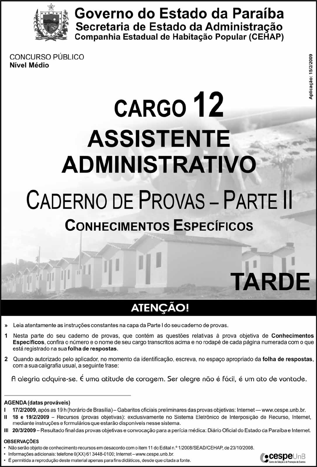 UnB/CESPE – SEAD/CEHAP/PB Cargo 12: Assistente Administrativo – 1 – Nas questões de 21 a 50, marque, para cada uma, a única opção correta, de acordo com o respectivo comando. Para as devidas marcações, use a folha de respostas, único documento válido para a correção das suas provas. CONHECIMENTOS ESPECÍFICOS QUESTÃO 21 Assinale a opção correta acerca dos números reais positivos x e y. A B C (x+y)2 !2xy # 0 D QUESTÃO 22 A entrada em um parque de diversões custa R$ 1,50 para uma criança e R$ 4,00 para um adulto. Se, em um dia, entraram 1.700 pessoas no parque e foram arrecadados R$ 3.800,00 com as entradas, então o número de crianças que entraram no parque nesse dia foi A inferior a 700. B superior a 700 e inferior a 900. C superior a 900 e inferior a 1.100. D superior a 1.100. QUESTÃO 23 O preço a ser pago por uma corrida de táxi inclui uma parcela fixa, chamada bandeirada, e uma parcela variável que depende da distância, em km, percorrida pelo táxi. Suponha que a bandeirada custe R$ 3,90 e o quilômetro rodado custe R$ 0,70. Se um passageiro pagou R$ 20,00 por uma corrida de táxi, então a distância em quilômetros percorrida pelo táxi foi A superior a 25. B inferior a 25 e superior a 20. C inferior a 20 e superior a 15. D inferior a 15. QUESTÃO 24 Para constituírem uma sociedade, José, Maria e Pedro investiram R$ 60.000,00, R$ 40.000,00 e R$ 100.000,00 respectivamente. O lucro obtido pela sociedade ao ser encerrada foi de R$ 74.000,00. Se a divisão desse lucro entre os três sócios foi diretamente proporcional à quantia que cada um investiu, então é correto afirmar que A Maria recebeu R$ 14.800,00. B José recebeu R$ 20.000,00. C Pedro recebeu R$ 36.000,00. D a soma das quantias recebidas por Maria e Pedro foi inferior ao dobro da quantia recebida por José. RASCUNHO UnB/CESPE – SEAD/CEHAP/PB Cargo 12: Assistente Administrativo – 2 – QUESTÃO 25 Assinale a opção correta com respeito ao sistema legal de medidas. A 46,532 km = 46.532 dm. B 10 L = 10 dm3. C 1 m2 = 0,01 cm2. D 1 ha = 10.000 m. QUESTÃO 26 Considere a sequência numérica 6, 13, 27, 55, 111, ... Nessa sequência, cada termo após o primeiro termo é determinado pela multiplicação do termo precedente por um número inteiro n e adição de um número inteiro m. Com relação à situação-problema apresentada, assinale a opção correta. A m + n = 4 B m × n = 3 C m = n D mn = 2 QUESTÃO 27 Um auditório tem 20 poltronas na primeira fila, 24 poltronas na segunda fila, 28 poltronas na terceira fila, 32 poltronas na quarta fila e assim por diante. O número de filas necessárias para que esse auditório tenha exatamente 800 poltronas é igual a A 16. B 15. C 14. D 13. QUESTÃO 28 Em uma região choveu durante 25 dias. O número de dias em que choveu pela manhã, à tarde ou à noite satisfaz às seguintes relações: • choveu nos três períodos em 2 dias; • choveu apenas pela manhã e à tarde em 3 dias; • choveu apenas à tarde e à noite em 4 dias; • choveu apenas pela manhã e à noite em 2 dias; • choveu apenas à tarde em 6 dias; • choveu apenas à noite em 3 dias. Nessas condições, o número de dias em que choveu pela manhã foi igual a A 10. B 11. C 12. D 13. QUESTÃO 29 10 5 0 10 15 20 25 30 35 40 45 50 v eí cu lo s (% ) velocidade (km/h) 20 30 40 50 60 70 80 90 100 O gráfico acima mostra a distribuição percentual de veículos de acordo com suas velocidades aproximadas, registradas por meio de um radar instalado em uma avenida. A velocidade média aproximada, em km/h, dos veículos que foram registrados pelo radar foi A inferior a 40. B superior a 40 e inferior a 43. C superior a 43 e inferior a 46. D superior a 46. RASCUNHO UnB/CESPE – SEAD/CEHAP/PB Cargo 12: Assistente Administrativo – 3 – QUESTÃO 30 Uma urna contêm 5 bolas amarelas e 4 bolas azuis, todas do mesmo tamanho e feitas do mesmo material. Caso se retirem 2 bolas sucessivamente da urna, sem repô-las, a probabilidade de que sejam retiradas 2 bolas amarelas será A inferior a 0,2. B superior a 0,2 e inferior a 0,25. C superior a 0,25 e inferior a 0,3. D superior a 0,3. QUESTÃO 31 As atividades dos arquivos correntes são divididas em cinco setores distintos. Um desses setores é a A destinação. B higienização. C reformatação. D difusão. QUESTÃO 32 As rotinas do protocolo são fundamentais para garantir o fluxo adequado do documento dentro de uma empresa ou órgão público. As rotinas do protocolo incluem a A preparação da listagem de eliminação de documentos. B elaboração do plano de destinação de documentos de arquivo. C elaboração do registro dos documentos de arquivo. D definição dos elementos de descrição dos documentos de arquivo. QUESTÃO 33 A atividade de classificação de documentos de arquivo exige, por parte do classificador, conhecimentos não só da empresa ou do órgão público, mas da natureza dos documentos a serem classificados. Acerca da classificação de documentos de arquivo, assinale a opção correta. A Os métodos de arquivamento do sistema direto são aqueles que exigem a consulta de um índice ou de um código. B O método numérico cronológico leva em consideração a ordem numérica e a procedência do documento. C Uma representação correta do método numérico simples é 22-93-17. D O método decimal é um método numérico ideográfico. QUESTÃO 34 A guarda de documentos é a colocação do documento na respectiva pasta, caixa ou móvel. Uma rotina de guarda de documentos é A verificar a classificação atribuída no ato do recebimento. B apor carimbo de protocolo. C elaborar o resumo do assunto. D separar a correspondência oficial de caráter ostensivo da de caráter sigiloso. RASCUNHO UnB/CESPE – SEAD/CEHAP/PB Cargo 12: Assistente Administrativo – 4 – QUESTÃO 35 O método de arquivamento alfabético exige a aplicação das regras de alfabetação. Em cada uma das opções a seguir é apresentado um nome e um supo