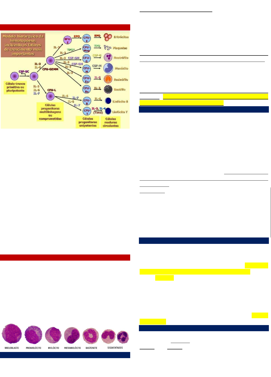 HEMATOFÉRIAS LEUCOPOIESE - Os leucócitos (glóbulos brancos) podem ser divididos em: fagócitos, que medeiam a resposta imune inata; e linfócitos, que medeiam a resposta imune adaptativa. - Os fagócitos, então, subdividem-se em granulócitos (neutrófilos, eosinófilos e basófilos) e monócitos, os quais são agranulócitos, juntamente com os linfócitos (T, B e NK); - A CTH (stemcell) inicialmente se diferencia em 2 tipos celulares progenitores multilinhagem ou “CFU” – Unidades Formadoras de Colônia: (1) um comprometido com a Linhagem Linfoide (linfócitos) (2) outro comprometido com a Linhagem Mieloide (granulócitos, eritrócitos, monócitos e megacariócitos). - Os progenitores multilinhagem se diferenciam em progenitores de linhagem única, os quais se destinam a produzir tipos celulares específicos. Qualquer uma dessas células pode sofrer uma transformação neoplásica, inviabilizando o processo fisiológico de maturação e resultando em proliferação e acúmulo de um “clone” (população de células indênticas). GRANULOPOIESE - Os granulócitos originam-se da célulatronco progenitora mieloide comum, que se diferencia em células progenitoras de granulócitos/ monócitos (GMPs) sob a influência de citocinas como GM-CSF, fator estimulador de colônias de granulócitos (G-CSF) e IL-3. - O GM-CSF é uma citocina secretada pelas células endoteliais, células T, macrófagos, mastócitos e fibroblastos. Ela estimula as células GMP a produzir granulócitos (neutrófilos, eosinófilos e basófilos) e monócitos. PRECURSORES DOS NEUTRÓFILOS - O mieloblasto é a célula precursora de neutrófilos mais inicialmente reconhecível microscopicamente na medula óssea. Tem um núcleo grande, esférico e cromático com 3 a 5 nucléolos, apresentando citoplasma basófilo e agranular; - Mieloblastos originam promielócitos, os quais têm um grande núcleo esférico com grânulos azurófilos (primários) no citoplasma. - Em seguida, originam-se os mielócitos, os quais já apresentam grânulos secundários/específicos. - Os mielócitos originam os metamielócitos, células que não mais se dividem, com núcleo em forma de ferradura e citoplasma rico em grânulos primários e secundários - Teoricamente, o estágio metamielocítico na granulopoese é seguido pelo estágio de bastão e, em seguida, pelo estágio segmentado. Embora esses estágios sejam evidentes na linhagem de neutrófilos, raramente ou nunca são observado na de eosinófilos e basófilos, nas quais os estágios são reconhecidos por eosinófilo madura e basófilo maduro, respectivamente. BASTONETES E SEGMENTADOS - Na linhagem de neutrófilos, a célula em bastão precede o desenvolvimento dos 1ºs lóbulos nucleares distintos; - O núcleo da célula em bastão é alongado e de largura quase uniforme, o que lhe confere um aspecto semelhante a ferradura. - As constrições nucleares então se desenvolvem nos neutrófilos em bastão e se tornam mais proeminentes até que 2 a 4 lóbulos nucleares sejam reconhecidos; a célula é então considerada um neutrófilo maduro, também denominada neutrófilo polimorfonuclear ou segmentado. Importante: Em geral, os precursores dos neutrófilos não aparecem no sangue periférico normal e estão presentes na medula óssea. As formas de neutrófilos entre metamielócitos e neutrófilo maduro são chamadas neutrófilos bastonados, “bastonetes” ou “bastões”. Eles estão presentes no sangue periférico e não apresentam separação filamentosa entre os lobos nucleares, observada nos neutrófilos maduros. PRECURSORES DOS MONÓCITOS - Os monócitos são produzidos na medula óssea a partir de uma célula-tronco GMP (mieloblasto). A progressão subsequente da linhagem de células progenitoras de monócitos (MoP) depende da presença dos fatores de transcrição PU.1 e Egr-1; além de IL-3 e GM-CSF. - O GM-CSF também controla a diferenciação subsequente em células maduras, que são, então, liberadas na circulação. - A transformação das MoP em monócitos leva cerca de 55h, e os monócitos permanecem na circulação por apenas cerca de 16h antes de emigrarem para os tecidos onde se diferenciam sob a influência do GMCSF e do M-CSF em macrófagos teciduais. MONOCITOPOIESE - Os monócitos partilham suas células bipotentes com os neutrófilos: a CFU-GM passa por mitoses e dá origem a CFU-G e CFU-M, responsável pela linhagem de monócitos. - A diferenciação da CFU-M é estimulada pela IL-3, e a sua proliferação em monócitos resulta do estímulo da M- CSF – fator estimulador de colônias de monócitos Arthur Rodrigues | @arthurnamedicina | Problema 02 OBS: Quando o GM-CSF, IL-3 e Fator de crescimento da célula-tronco (SCF), em conjunto com a família dos fatores de necrose tumoral (TNF) atua no CFU-GM, esse origina a unidade formadora de colônia de monócitos e células dendríticas (CFUM/DC), que pode originar a linhagem das células dendríticas e dos macrófagos pelo seguinte mecanismo: *Diferenciação de células dendríticas: por ação integrada de GM-CSF, TNF, SCF e IL-4, o CFU-M/DC origina toda a linhagem de células dendríticas por proliferação, maturação e sobrevivência de seus precursores na medula óssea vermelha. Essa é considerada do tipo mieloide direta. *Diferenciação de macrófagos: por ação integrada do GM-CSF, M-CSF e da IL-3, o CFU-M/DC origina uma célula monoblástica que continua as etapas de maturação sob o comando desse mesmo padrão de citocinas. Além disso, se o monócitos for influenciado pela ação integrada do GM-CSF, M-CSF e IL-3 irá originar as células dendríticas por via de maturação mieloide indireta. - Um grande número de bastonetes e neutrófilos segmentados é mantido na medula óssea (10 a 15x o número total no sangue) como uma “Reserva Granulocítica Medular”. Em geral, a medula óssea contém mais células mieloides que eritroides, onde predominam neutrófilos e metamielócitos. Após a lib