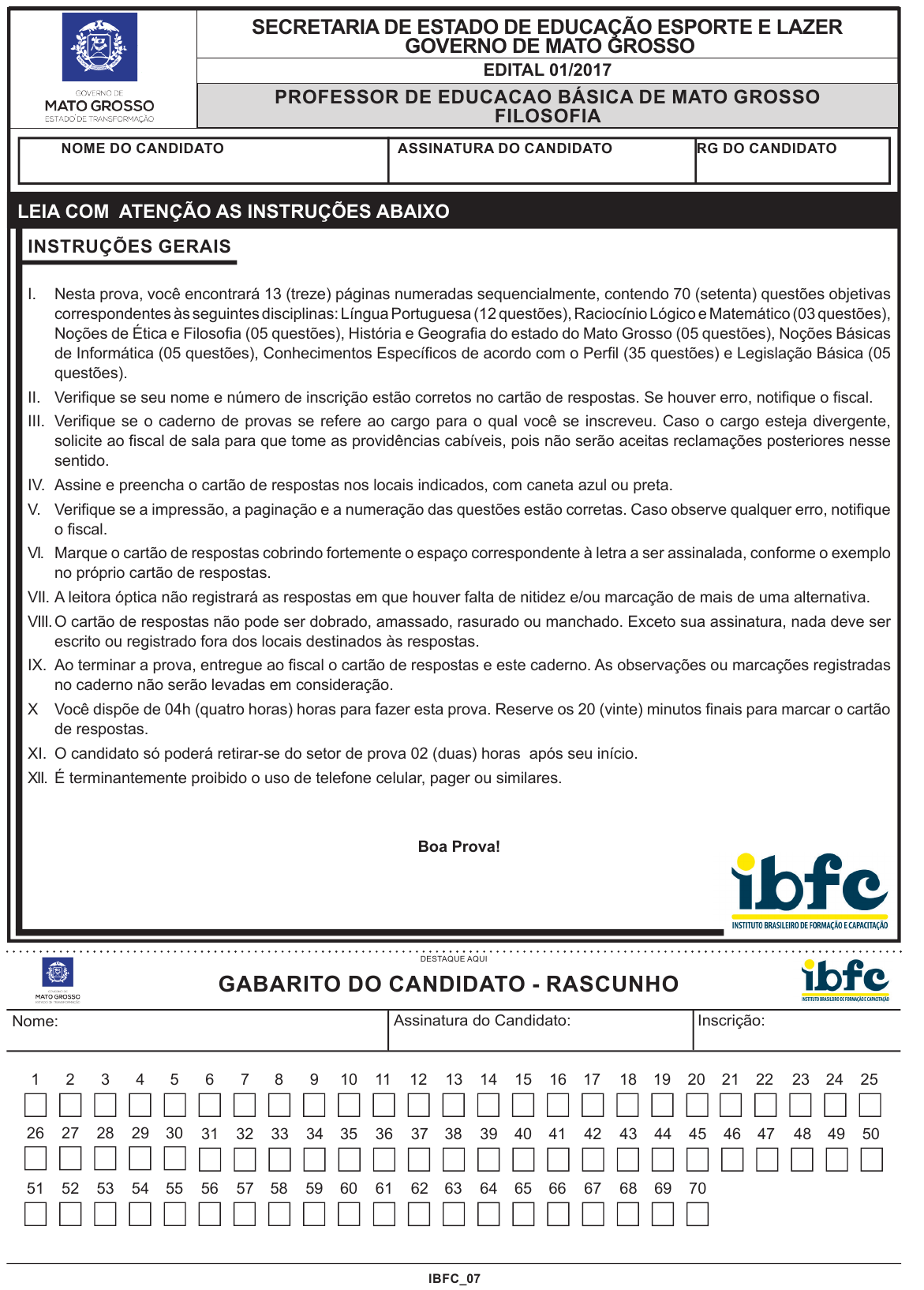 IBFC_07 DESTAQUE AQUI GABARITO DO CANDIDATO - RASCUNHO Nome: Assinatura do Candidato: Inscrição: SECRETARIA DE ESTADO DE EDUCAÇÃO ESPORTE E LAZER GOVERNO DE MATO GROSSO EDITAL 01/2017 PROFESSOR DE EDUCACAO BÁSICA DE MATO GROSSO FILOSOFIA NOME DO CANDIDATO ASSINATURA DO CANDIDATO RG DO CANDIDATO INSTRUÇÕES GERAIS I. Nesta prova, você encontrará 13 (treze) páginas numeradas sequencialmente, contendo 70 (setenta) questões objetivas correspondentes às seguintes disciplinas: Língua Portuguesa (12 questões), Raciocínio Lógico e Matemático (03 questões), Noções de Ética e Filosofia (05 questões), História e Geografia do estado do Mato Grosso (05 questões), Noções Básicas de Informática (05 questões), Conhecimentos Específicos de acordo com o Perfil (35 questões) e Legislação Básica (05 questões). II. Verifique se seu nome e número de inscrição estão corretos no cartão de respostas. Se houver erro, notifique o fiscal. III. Verifique se o caderno de provas se refere ao cargo para o qual você se inscreveu. Caso o cargo esteja divergente, solicite ao fiscal de sala para que tome as providências cabíveis, pois não serão aceitas reclamações posteriores nesse sentido. IV. Assine e preencha o cartão de respostas nos locais indicados, com caneta azul ou preta. V. Verifique se a impressão, a paginação e a numeração das questões estão corretas. Caso observe qualquer erro, notifique o fiscal. VI. Marque o cartão de respostas cobrindo fortemente o espaço correspondente à letra a ser assinalada, conforme o exemplo no próprio cartão de respostas. VII. A leitora óptica não registrará as respostas em que houver falta de nitidez e/ou marcação de mais de uma alternativa. VIII. O cartão de respostas não pode ser dobrado, amassado, rasurado ou manchado. Exceto sua assinatura, nada deve ser escrito ou registrado fora dos locais destinados às respostas. IX. Ao terminar a prova, entregue ao fiscal o cartão de respostas e este caderno. As observações ou marcações registradas no caderno não serão levadas em consideração. X Você dispõe de 04h (quatro horas) horas para fazer esta prova. Reserve os 20 (vinte) minutos finais para marcar o cartão de respostas. XI. O candidato só poderá retirar-se do setor de prova 02 (duas) horas após seu início. XII. É terminantemente proibido o uso de telefone celular, pager ou similares. Boa Prova! LEIA COM ATENÇÃO AS INSTRUÇÕES ABAIXO 31 26 32 27 33 28 34 29 35 30 36 37 38 39 40 41 42 43 44 45 46 47 48 49 50 1 2 3 4 5 6 7 8 9 10 11 12 13 14 15 16 2117 2218 2319 2420 25 51 52 53 54 55 56 57 58 59 60 61 62 63 64 65 66 67 68 69 70 RASCUNHO 1IBFC_07 LÍNGUA PORTUGUESA Texto I Conceitos da vida cotidiana A metáfora é, para a maioria das pessoas, um recurso da imaginação poética e um ornamento retórico – é mais uma questão de linguagem extraordinária do que de linguagem ordinária. Mais do que isso, a metáfora é usualmente vista como uma característica restrita à linguagem, uma questão mais de palavras do que de pensamento ou ação. Por essa razão, a maioria das pessoas acha que pode viver perfeitamente bem sem a metáfora. Nós descobrimos, ao contrário, que a metáfora está infiltrada na vida cotidiana, não somente na linguagem, mas também no pensamento e na ação. Nosso sistema conceptual ordinário, em termos do qual não só pensamos, mas também agimos, é fundamentalmente metafórico por natureza. Os conceitos que governam nosso pensamento não são meras questões do intelecto. Eles governam também a nossa atividade cotidiana até nos detalhes mais triviais. Eles estruturam o que percebemos, a maneira como nos comportamos no mundo e o modo como nos relacionamos com outras pessoas. Tal sistema conceptual desempenha, portanto, um papel central na definição de nossa realidade cotidiana. Para dar uma ideia de como um conceito pode ser metafórico e estruturar uma atividade cotidiana, comecemos pelo conceito de DISCUSSÃO e pela metáfora conceitual DISCUSSÃO É GUERRA. Essa metáfora está presente em nossa linguagem cotidiana numa grande variedade de expressões: Seus argumentos são indefensáveis. Ele atacou todos os pontos da minha argumentação. É importante perceber que não somente falamos sobre discussão em termos de guerra. Podemos realmente ganhar ou perder uma discussão. Vemos as pessoas com quem discutimos como um adversário. Atacamos suas posições e defendemos as nossas. Planejamos e usamos estratégias. Se achamos uma posição indefensável, podemos abandoná-la e colocar-nos numa linha de ataque. Muitas das coisas que fazemos numa discussão são parcialmente estruturadas pelo conceito de guerra. Esse é um exemplo do que queremos dizer quando afirmamos que um conceito metafórico estrutura (pelo menos parcialmente) o que fazemos quando discutimos, assim como a maneira pela qual compreendemos o que fazemos. (LAKOFF, G. & JOHNSON, M. Texto adaptado de Metáforas da vida cotidiana. Campinas: Mercado de Letras; São Paulo: Educ, 2002, p. 45-47.) 1) Ao longo do texto, percebe-se um posicionamento dos autores acerca do conceito de metáfora. Para eles, trata-se de algo que: a) está associado apenas a um recurso da imaginação poética ou de retórica. b) deve ser visto como um traço restrito à organização do pensamento humano. c) revela o imaginário da natureza humana, como também o de outras espécies. d) não está centrado só na linguagem, mas também interfere em ações do cotidiano. e) não deve ser associado a elementos linguísticos, mas a ações extraordinárias. 2) Em “Vemos as pessoas com quem discutimos como um adversário” (6º§), nota-se uma adequação de regência verbal em relação à norma. Desse modo, assinale a alternativa em que, na reescritura, NÃO se registra tal adequação. a) Não vemos as pessoas de quem gostamos como um adversário. b) Vemos as pessoas de quem não nos lembramos como um adversário. c) Vemos as pe