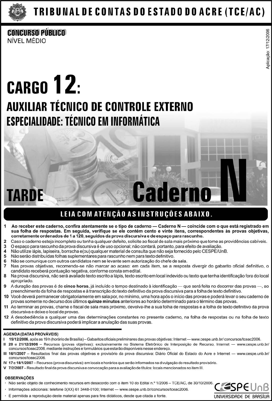 UnB/CESPE – TCE/AC Caderno N Cargo 12: Auxiliar Técnico de Controle Externo – Especialidade: Técnico em Informática – 1 – • De acordo com o comando a que cada um dos itens de 1 a 120 se refira, marque, na folha de respostas, para cada item: o campo designado com o código C, caso julgue o item CERTO; ou o campo designado com o código E, caso julgue o item ERRADO. A ausência de marcação ou a marcação de ambos os campos não serão apenadas, ou seja, não receberão pontuação negativa. Para as devidas marcações, use a folha de respostas, único documento válido para a correção das suas provas. • Nos itens que avaliam Noções de Informática, a menos que seja explicitamente informado o contrário, considere que todos os programas mencionados estão em configuração-padrão, em português, que o mouse está configurado para pessoas destras e que expressões como clicar, clique simples e clique duplo referem-se a cliques com o botão esquerdo do mouse. Considere também que não há restrições de proteção, de funcionamento e de uso em relação aos programas, arquivos, diretórios e equipamentos mencionados. CONHECIMENTOS BÁSICOS Texto para os itens de 1 a 15 O que significa controle externo? A delegação ao1 chefe maior do cumprimento do nosso dever interno. Ele fará o controle melhor do que nós: tem câmeras, códigos, redes, informação, arquivos. Em breve, quem não tiver uma4 identidade digital acessível ao chefe não existirá. Mas um princípio não pode ser tomado isoladamente, justamente por ser um princípio.7 Controle externo é um conteúdo de idéias de nosso tempo. Nem bom, nem mau, tomado em si. Ele ganha significado, bom ou mau, quando indagamos: a quem serve?10 Tomemos, por exemplo, a globalização das relações econômicas, que fez nascerem as chamadas economias- mundo. Seus agentes — os grandes executivos das13 companhias internacionais, situados em todo lugar e em lugar nenhum — estão interessados unicamente nos fluxos de capitais e, conseqüentemente, nas desregulamentações que16 permitam os fluxos; daí exigirem um controle externo sobre as economias-nação. Quando os cientistas políticos ensinam que, nas19 democracias modernas, poder trava poder, aludem a uma forma de pacto social ou controle tácito que permite a governabilidade. Que tipo de controle é esse, externo ou22 interno? Trata-se de controle interno ao Estado, uma vez que este se constitui precisamente de três poderes que se equilibram. Por isso, se diz que a autonomia dos poderes é a25 garantia, talvez principal, da democracia. É um paradoxo: um poder controla o outro porque não se deixa controlar pelo outro. Para que aquela trava funcione, cada poder deve ser28 soberano em seu exercício: deve controlar a si. Temos, assim, dois controles a considerar: o externo, dever do Estado consigo mesmo, e o interno, dever de cada poder, em31 particular, consigo mesmo. Internet: <www.premioinnovare.com.br> (com adaptações). A partir das idéias do texto acima, julgue os itens a seguir. 1 O texto inicia-se com uma pergunta que será respondida no primeiro período do segundo parágrafo. 2 Ao citar recursos como “câmeras, códigos, redes, informação, arquivos” (R.3-4), o autor defende que o controle externo depende da “identidade digital” (R.5). 3 A resposta à questão “a quem serve?” (R.10) é que dará caráter benéfico ou maléfico ao controle externo. 4 No segundo parágrafo do texto, predomina uma estrutura do tipo descritivo. 5 O segmento “os grandes executivos das companhias internacionais, situados em todo lugar e em lugar nenhum” (R.13-15), embora contenha um paradoxo, caracteriza os agentes de controle externo, expressos pelo termo “Seus agentes” (R.13). Julgue os itens seguintes com base no trecho “Quando os cientistas políticos ensinam que, nas democracias modernas, poder trava poder, aludem a uma forma de pacto social ou controle tácito que permite a governabilidade” (R.19-22). 6 A passagem em destaque contém a seguinte idéia: há cientistas políticos ensinando que poder freia poder. 7 A forma verbal “aludem” concorda com o sujeito da oração: “democracias modernas”. 8 A primeira oração do trecho expressa circunstância de tempo. 9 No trecho considerado, os adjetivos “políticos”, “modernas”, “social” e “tácito” referem-se e concordam com “cientistas”, “democracias”, “pacto” e “controle”, respectivamente. 10 A palavra “que”, nas duas vezes em que aparece no trecho, exerce a função sintática de sujeito. 11 Na expressão “a governabilidade”, que complementa o sentido da forma verbal “permite”, a ausência do sinal indicativo de crase justifica-se por o substantivo “governabilidade” estar empregado em sentido genérico. Quanto à sintaxe de concordância e de regência, julgue as formas alternativas de passagens do texto, propostas nos itens subseqüentes. 12 É possível que, daqui a alguns anos, não haja, no mundo das relações comerciais, cidadãos sem identidade digital. 13 Das relações econômicas, fez-se nascer a chamada economias-mundo. 14 Existem desregulamentações internacionais em que se permitem fluxos comerciais; daí exigir-se um controle externo. 15 O Estado se constitui de três poderes que se equilibram; diz- se que a autonomia dos poderes garante a democracia. UnB/CESPE – TCE/AC Caderno N Cargo 12: Auxiliar Técnico de Controle Externo – Especialidade: Técnico em Informática – 2 – Julgue os itens que se seguem quanto a aspectos gramaticais. 16 Há um paradoxo no Brasil: um Poder controla o outro para que não se deixa vigiar pelo outro. 17 Para àquela trava entre os Poderes funcionar, cada um deve ser influênte em suas funções. 18 Embora um indivíduo não possa ser tomado isoladamente, haja vista que é somente um ser, cada governado deve, em primeiro lugar, controlar a si mesmo. 19 Existem dois controles a considerar no t