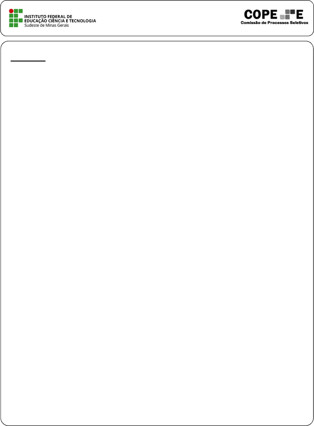 Instituto Federal de Educação, Ciência e Tecnologia do Sudeste de Minas Gerais - COPESE Pag. 1 de 10 Concurso Público Provimento de Cargo de Professor Efetivo EBTT Edital 05/2016 – PEDAGOGIA Campus Santos Dumont Questão 01: No livro Dimensões de gestão escolar e suas competências, Lück (2009) destaca a existência de áreas e dimensões da gestão escolar que, juntas, tornam possível, como fim último, a formação e o aprendizado de seus alunos. Na obra em questão, a autora apresenta dez dimensões distribuídas em duas grandes áreas: as dimensões de organização e as dimensões de implementação. LÜCK, Heloísa. Dimensões de gestão escolar e suas competências. 2. ed. Curitiba: Positivo, 2009. Relacione as duas áreas com as dez dimensões apresentadas no livro de Lück e depois assinale a alternativa CORRETA. A. Dimensões de organização ( ) Fundamentos e princípios da educação e da gestão escolar B. Dimensões de implemenação ( ) Gestão da cultura escolar ( ) Gestão pedagógica ( ) Monitoramento de processos e avaliação institucional ( ) Gestão do cotidiano escolar ( ) Gestão administrativa ( ) Gestão de pessoas ( ) Gestão democrática e participativa ( ) Planejamento e organização do trabalho escolar ( ) Gestão de resultados educacionais Marque a alternativa que apresenta a sequência CORRETA. a) A, A, A, B, B, A, B, B, A, B b) A, A, B, B, B, A, B, A, B, A c) A, B, B, A, A, B, B, A, B, B d) A, B, B, A, B, A, A, B, A, A e) A, B, B, A, B, B, B, B, A, A Instituto Federal de Educação, Ciência e Tecnologia do Sudeste de Minas Gerais - COPESE Pag. 2 de 10 Concurso Público Provimento de Cargo de Professor Efetivo EBTT Edital 05/2016 – PEDAGOGIA Campus Santos Dumont Questão 02: São inúmeras as pesquisas que demonstram o impacto positivo da formação de professores nos processos educacionais. Assim, o Artigo 59 da LDB – Lei nº 9.394/96 – ressalta a importância de se promover especialização adequada aos professores de classes especiais que atenderão aos educandos com deficiência, transtornos globais do desenvolvimento e altas habilidades ou superdotação. Quanto a essa formação específica, de acordo com o mencionado artigo, o professor deve: a) possuir especialização adequada em nível médio ou superior, para atendimento especializado, bem como professores do ensino regular serem capacitados para a integração desses educandos nas classes comuns. b) possuir especialização técnica em nível médio para atuar em instituições de ensino de atendimento especializado. c) possuir graduação em Pedagogia, Serviço Social ou Psicologia e Pós-graduação em Educação, para atuar em instituições de ensino de atendimento especializado. d) possuir, exclusivamente, o ensino médio específico e se capacitar em serviço, de forma continuada, para a integração desses educandos em classes comuns. e) possuir qualquer graduação e atuar em instituições de ensino de atendimento especializado, atendendo os educandos com deficiência, transtornos globais do desenvolvimento e altas habilidades ou superdotação. Questão 03: Considerando o planejamento de ensino como construção de ações previstas a partir do cotidiano escolar, analise as proposições abaixo, assinalando V nas que forem verdadeiras e F nas que forem falsas. ( ) O planejamento deve ser flexível, a fim de não engessar a prática docente. ( ) O planejamento deve trabalhar com um aluno ideal, visando à qualidade que se quer alcançar. ( ) O planejamento escolar deve partir da situação atual dos alunos e permanecer nela. ( ) O planejamento prevê o diagnóstico, a execução, a avaliação e a readequação de tudo que foi planejado. ( ) O planejamento visa realizar um trabalho intencional de ensino-aprendizagem. A sequência CORRETA é: a) V,V, F, V, V. b) V, F, F, V, V. c) V, F, V, V, F. d) V, F, F, V, F. e) V, V, F, V, F. Instituto Federal de Educação, Ciência e Tecnologia do Sudeste de Minas Gerais - COPESE Pag. 3 de 10 Concurso Público Provimento de Cargo de Professor Efetivo EBTT Edital 05/2016 – PEDAGOGIA Campus Santos Dumont Questão 04: Leia a passagem a seguir: O primeiro passo para a gestão de resultados é definir os indicadores de desempenho, tomados como referência de qualidade de ensino. Esses indicadores são utilizados tanto como referência de desempenho de alunos, individualmente e agregados em grupos diversos, como sexo, nível socioeconômico, grupo étnico, etc., como referência ao desempenho de turmas de alunos, professores, escolas, redes ou sistemas de ensino. O indicador vem a constituir-se no elemento mensurável que permite concluir que ocorreu um determinado resultado. LÜCK, Heloísa. Dimensões da gestão escolar e suas competências. 2. ed. Curitiba: Positivo, 2009. p. 58. É possível, na área educacional, classificarmos alguns indicadores como forma de medir a efetividade da escola. Posto isso, analise as sentenças abaixo e, posteriormente, marque a alternativa CORRETA. I. Os indicadores de insumo representam os meios pelos quais um projeto escolar é implementado, como o número de pessoas envolvidas nesse projeto. II. Os indicadores de processo mostram como os insumos foram utilizados para obter os resultados esperados, como a descrição passo a passo das ações que foram operadas. III. Os indicadores de resultado mostram os resultados obtidos, como as medidas de realização dos objetivos e das metas definidas no projeto escolar. IV. Os indicadores de impacto mostram os efeitos do projeto escolar, como a utilização de instrumentos, equipamentos e materiais de apoio pedagógico. Assinale a alternativa CORRETA. a) Apenas a afirmativa I está correta. b) Apenas as afirmativas I e II estão corretas. c) Apenas as afirmativas I e III estão corretas. d) Apenas as afirmativas I, II e III estão corretas. e) As afirmativas I, II, III e IV estão corretas. Instituto Federal de Educação, Ciência e Tecnologia do Sudeste