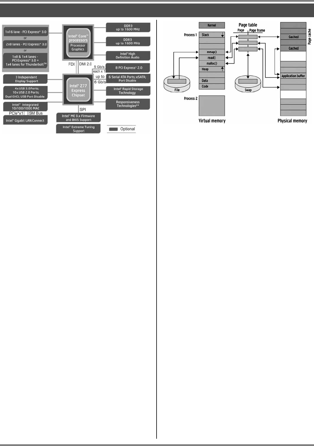 ||137FUB15_012_21N727291|| CESPE | CEBRASPE – FUB – Aplicação: 2015 CONHECIMENTOS ESPECÍFICOS Internet: <www.intel.ie>. A figura acima apresenta um diagrama da arquitetura de uma placa mãe de computadores que usam o chipset Z77 e o barramento Ivy Bridge, da Intel. Considerando as informações apresentadas na figura, julgue os próximos itens, a respeito de noções de arquitetura de computadores. 51 Para que dados vindos da rede de computadores Ethernet Gigabit sejam processados por um aplicativo em execução em um computador que adota a arquitetura representada na figura, é obrigatório o trânsito desses dados pelo componente Intel Z77 Express Chipset. 52 A conexão de dispositivos de E/S de dados com alta latência (por exemplo, um disco rígido) a esse computador seria mais adequadamente realizada por uma porta SATA ou eSATA que por um barramento PCI Express 3.0. 53 Vários barramentos de comunicação estão presentes em computadores que adotam a arquitetura mostrada na figura. 54 Na figura, observa-se que existem pelo menos duas vias independentes de comunicação entre o processador central e a memória. 55 Considerando-se que, em uma unidade de processamento de dados, existam registradores, unidade aritmética e lógica, unidade de controle e barramento interno, é correto afirmar que os computadores com a arquitetura apresentada contêm apenas uma unidade de processamento de dados, composta por um ou mais cores (núcleos). Internet: <www.admin-magazine.com>. A figura acima apresenta um esquema conceitual de gerenciamento de memória em um computador com sistema operacional Linux. Considerando as informações apresentadas na figura, julgue os itens seguintes, acerca de sistemas operacionais. 56 Em um sistema de arquivos do Linux, a manipulação de arquivos (por exemplo, com funções de criação, remoção, leitura e gravação) efetuada por um processo de usuário (um aplicativo em execução, por exemplo) desenvolvido na plataforma Linux é intermediada com o uso da área de armazenamento de memória virtual do sistema (Swap). 57 A quantidade de memória virtual ocupada pelos processos de usuário e do núcleo do sistema operacional (Kernel) é sempre maior que a memória física disponível, devido à presença da memória virtual (Swap). 58 Embora não seja acessível diretamente ao usuário, a área de swap de um sistema Linux utiliza os mesmos tipos de sistema de arquivos de uso pelos usuários, como o ext3, para que haja suporte à característica de journaling. 59 Funções de tratamento de memória, como mmap(), read() e malloc(), acessam de forma direta ou indireta as tabelas de paginação da memória virtual em sistemas Linux e são tipicamente codificadas ou programadas pelos próprios programadores de processos de usuário para esses sistemas Linux. 60 Durante a execução de um processo computacional na plataforma Linux ou Windows, é possível identificar a presença de várias áreas de memória distintas, entre elas: área de pilha (Stack), área de alocação dinâmica de memória (Heap), área de dados estáticos (Data) e área de código (Code). ||137FUB15_012_21N727291|| CESPE | CEBRASPE – FUB – Aplicação: 2015 Internet: <www.csee.umbc.edu> (com adaptações). A figura acima apresenta um modelo conceitual de ambiente de aplicação computacional que adota arquitetura cliente-servidor multicamadas, contendo clientes magros (Thin Client), servidores de aplicação (Application Server) e servidor de bancos de dados (Database Server). A plataforma de clientes e servidores pode ser Windows e(ou) Linux, e os servidores de bancos de dados são SGBDs relacionais. A partir das informações apresentadas e dos conceitos de arquitetura cliente-servidor multicamadas, julgue os itens a seguir. 61 No modelo apresentado, uma vez que o acesso dos clientes magros (Thin Client) ocorre apenas pelo servidor de aplicação 1, é dispensável o uso de firewalls para isolar os servidores de bancos de dados dos servidores de aplicação. 62 As comunicações estabelecidas entre os servidores de aplicação e os servidores de bancos de dados envolvem o envio de comandos SQL e o recebimento de resultados da execução desses comandos. Em aplicações convencionais, o servidor de banco de dados não faz vinculação direta do usuário que se autentica junto ao servidor de aplicação com o usuário de banco de dados que estabelece a conexão consigo por meio do servidor de aplicação. 63 Em um sistema com típica arquitetura cliente-servidor multicamadas, cada servidor de aplicação deve estabelecer conexões e comunicações com dois servidores de bancos de dados, e cada par de servidor de bancos de dados deve receber pedidos de conexões e comunicações de um único servidor de aplicação. 64 Considerando as necessidades de implementar uma arquitetura de redes de computadores com três sub-redes, para apoiar o funcionamento de aplicações na arquitetura cliente-servidor indicada na figura, o mais correto, do ponto de vista de economicidade, de backup de dados e de segurança da informação, é separar os clientes magros dos servidores de aplicação e dos servidores de bancos de dados, mantendo-os nas três distintas sub-redes, conforme o tipo. 65 O modelo sugere que o servidor de aplicação 1 (Application Server 1) hospeda um serviço http, e que o mesmo recebe respostas http (http responses) e envia pedidos http (http requests) aos seus clientes. O tratamento de vários aspectos em um ambiente de trabalho de tecnologia de informação e comunicação pode ser segmentado em três equipes distintas, conforme descrito a seguir. C Equipe de infraestrutura, que atua no levantamento de necessidades de computação e de comunicação de clientes e usuários, visando o desenvolvimento e manutenção de componentes de hardware, redes de computadores, gerenciadores de bancos de dados, interfaces com usuário, arquiteturas e códigos. C Equipe de aplicações, que 