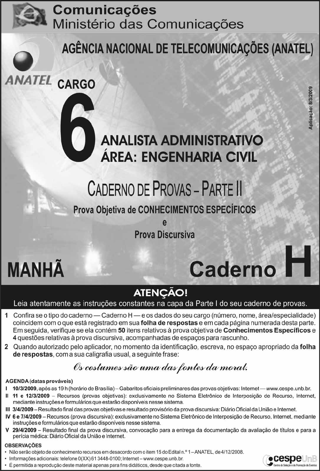 UnB/CESPE – ANATEL Caderno H Cargo 6: Analista Administrativo — Área: Engenharia Civil – 1 – De acordo com o comando a que cada um dos itens de 51 a 100 se refira, marque, na folha de respostas, para cada item: o campo designado com o código C, caso julgue o item CERTO; ou o campo designado com o código E, caso julgue o item ERRADO. A ausência de marcação ou a marcação de ambos os campos não serão apenadas, ou seja, não receberão pontuação negativa. Para as devidas marcações, use a folha de respostas, único documento válido para a correção das suas provas. CONHECIMENTOS ESPECÍFICOS Com relação à Política Nacional de Telecomunicações e serviços relacionados, à luz da Lei n.º 9.472/1997 e suas alterações, que dispõe sobre a organização dos serviços de telecomunicações, a criação e funcionamento de um órgão regulador e outros aspectos institucionais, julgue os itens a seguir. 51 É dever do poder público garantir, a toda população, o acesso às telecomunicações, a tarifas e preços razoáveis, em condições adequadas. 52 O órgão máximo da Agência Nacional de Telecomunicações (ANATEL) é o seu Conselho Consultivo. 53 Qualquer pessoa tem direito de peticionar ou de recorrer contra ato da ANATEL no prazo máximo de trinta dias, devendo a decisão da agência ser conhecida em até noventa dias. 54 A emissão de símbolo por meio ótico pode ser considerado telecomunicação. 55 Não comportam prestação no regime público os serviços de telecomunicações de interesse coletivo. 56 Depende de outorga o uso, pelas Forças Armadas, de radiofrequências nas faixas destinadas a fins exclusivamente militares. 57 Pode ser declarada a utilidade pública, para fins de desapropriação ou instituição de servidão, de bens imóveis ou móveis, necessários à execução do serviço de telecomunicações, cabendo à concessionária a implementação da medida e apenas ao poder público o pagamento da indenização e das demais despesas envolvidas. 58 Autorização de serviço de telecomunicações é o ato administrativo vinculado que faculta a exploração, no regime público, de modalidade de serviço de telecomunicações, quando preenchidas as condições objetivas e subjetivas necessárias. 59 O usuário do serviço de telecomunicações tem direito ao prévio conhecimento das condições de suspensão do serviço que lhe é prestado. 60 A ANATEL tem natureza de autarquia especial e é caracterizada pela autonomia administrativa e pela ausência de autonomia financeira. 61 Compete ao Conselho Consultivo da ANATEL aprovar normas próprias de licitação e contratação a serem realizadas pela agência. 62 Serviço de valor adicionado constitui serviço de telecomunicações, pois acrescenta novas utilidades relacionadas ao acesso, movimentação ou recuperação de informações. 63 Concessão de serviço de telecomunicações é a delegação da prestação de tal serviço, mediante contrato, por prazo determinado, no regime público, não se sujeitando a concessionária aos riscos empresariais. 64 A concessão de serviço de telecomunicações somente pode ser outorgada a empresa constituída segundo as leis brasileiras, com sede e administração no país, criada para explorar exclusivamente os serviços de telecomunicações que são objeto da concessão. 65 As concessões de serviço de telecomunicações são outorgadas mediante licitação. 66 A concessão de serviço de telecomunicações pode extinguir-se por encampação. Acerca da regulação e das agências reguladoras, julgue os itens que se seguem. 67 Os conselheiros e os diretores das agências reguladoras somente perdem o mandato em caso de renúncia, de condenação judicial transitada em julgado ou de processo administrativo disciplinar, não podendo a lei de criação da agência prever outras condições para a perda do mandato. 68 Durante o período de impedimento para o exercício de atividades no setor regulado, o ex-dirigente de agência reguladora ficará vinculado à agência, fazendo jus a remuneração compensatória equivalente à do cargo de direção que exerceu e aos benefícios a ele inerentes. 69 O ex-dirigente de agência reguladora fica impedido para o exercício de atividades ou de prestar qualquer serviço no setor regulado pela respectiva agência, por um período de quatro meses, contados da exoneração ou do término do seu mandato. 70 O presidente, o diretor-geral ou o diretor-presidente das agências reguladoras devem ser escolhidos pelo presidente da República e por ele nomeados, após aprovação pelo Senado Federal. As fundações são os elementos estruturais que têm por função transmitir as cargas da estrutura ao terreno sobre o qual ela se apoia, sendo que, para se escolher o tipo de fundação mais adequada, devem-se conhecer os esforços atuantes sobre a edificação e as características do solo e dos elementos estruturais que formam as fundações. A respeito desse assunto, julgue os seguintes itens. 71 Nas sapatas associadas, a viga de rigidez tem a função de permitir que a sapata trabalhe com tensão constante. 72 Os radiers são executados em concreto e dispensam armadura, já que devem resistir unicamente aos esforços de compressão. 73 Os tubulões executados com ar comprimido são recomendados quando há água no terreno, são necessárias grandes profundidades para as fundações e há o perigo de desmoronamento das paredes. UnB/CESPE – ANATEL Caderno H Cargo 6: Analista Administrativo — Área: Engenharia Civil – 2 – As estruturas metálicas em aço apresentam vantagens e desvantagens se comparadas às estruturas tradicionais de concreto armado. Especificamente em relação às vantagens das estruturas metálicas, julgue os itens subsequentes. 74 São menos agressivas ao meio ambiente. 75 Apresentam maior precisão construtiva. 76 Dispensam o uso de fundações de concreto. Acompanhando a evolução dos controlad