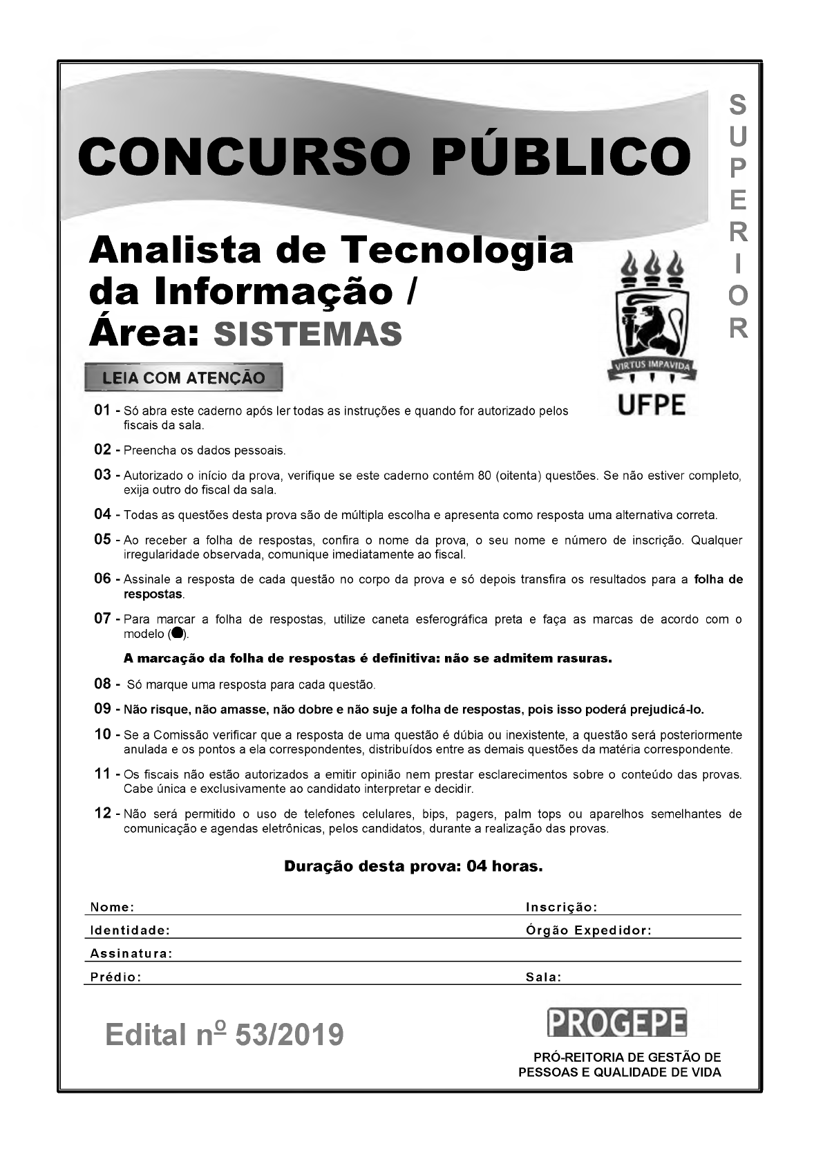 CONCURSO PÚBLICO Analista de Tecnologia da Inform ação / Área: SISTEMAS LEIA COM ATENÇÃO 01 - Só abra este caderno após ler todas as instruções e quando for autorizado pelos fiscais da sala. S U P E R I O R 02 - Preencha os dados pessoais. 03 - Autorizado o início da prova, verifique se este caderno contém 80 (oitenta) questões. Se não estiver completo, exija outro do fiscal da sala. 04 - Todas as questões desta prova são de múltipla escolha e apresenta como resposta uma alternativa correta. 05 - Ao receber a folha de respostas, confira o nome da prova, o seu nome e número de inscrição. Qualquer irregularidade observada, comunique imediatamente ao fiscal. 06 - Assinale a resposta de cada questão no corpo da prova e só depois transfira os resultados para a folha de respostas. 07 - Para marcar a folha de respostas, utilize caneta esferográfica preta e faça as marcas de acordo com o modelo (O). A m arcação da folha de respostas é defin itiva: não se adm item rasuras. 08 - Só marque uma resposta para cada questão. 09 - Não risque, não amasse, não dobre e não suje a folha de respostas, pois isso poderá prejudicá-lo. 10 - Se a Comissão verificar que a resposta de uma questão é dúbia ou inexistente, a questão será posteriormente anulada e os pontos a ela correspondentes, distribuídos entre as demais questões da matéria correspondente. 11 - Os fiscais não estão autorizados a emitir opinião nem prestar esclarecimentos sobre o conteúdo das provas. Cabe única e exclusivamente ao candidato interpretar e decidir. 12 - Não será permitido o uso de telefones celulares, bips, pagers, palm tops ou aparelhos semelhantes de comunicação e agendas eletrônicas, pelos candidatos, durante a realização das provas. Duração desta prova: 04 horas. Nome: In s c r iç ã o : Id e n tid a d e : Ó rgão E xp e d id o r: A s s in a tu ra : P réd io : Sala: Edital no 53/2019 PRÓ-REITORIA DE GESTÃO DE PESSOAS E QUALIDADE DE VIDA Português TEXTO 1 O sistema linguístico (1) Entendida como a soma de seus usos, a língua constitui a mais poderosa “engenharia simbólica” à disposição do ser humano. Valemo-nos dessa engenharia tanto para dizer um previsível e elementar “Parece que vai chover” quanto para escrever uma reportagem, um ensaio filosófico ou um poema lírico. A frase banal e a reportagem buscam uma correspondência entre o discurso e o fato, fazendo crer que a realidade a que se referem existe por si, independentemente da linguagem. O ensaio filosófico e o poema lírico têm outra natureza; a “realidade” de ambos é produto da linguagem com que são elaborados. O ensaio consiste em uma proposta de compreender as situações da vida como obra do pensamento racional movido pela associação livre de ideias. Já o poema revela, em sua essência, a captação do mundo dos sentimentos e sua representação por meio de recursos de linguagem em que sobressai a materialidade sonora e rítmica das palavras. (2) Nossa tarefa, como linguistas e estudiosos da linguagem, é promover a compreensão do papel comum da palavra na construção de todas as espécies de textos. A palavra é, em qualquer caso, uma forma de construir significado, quer quando está a serviço da comunicação de uma experiência do cotidiano moldado pela bitola do senso comum - a exemplo do comentário sobre o tempo -, quer quando sua função é abrir caminhos que produzam fissuras na superfície da realidade imediata, abalando certezas e projetando-nos em outros universos de significação - como se passa na escrita/leitura do ensaio ou do poema lírico. (3) Para apreender a palavra como forma de construir significado, é preciso ir além de sua utilidade como simples instrumento de comunicação e passar a tratá-la como objeto de observação, de reflexão e de análise. Cabe à escola levar o aluno à percepção e à compreensão de que a palavra desempenha múltiplos papéis em nossa vida, de que os horizontes de nossas experiências simbólicas se ampliam na mesma medida em que se ampliam nossos recursos de expressão. A educação linguística e literária - que propicia a compreensão do funcionamento da linguagem - é o passaporte que permite ao indivíduo transitar conscientemente pelo mundo da interação verbal. AZEREDO, José Carlos de. A Linguística, o texto e o ensino da língua. São Paulo: Parábola, 2018. p. 63-64. Adaptado. 01. Todo texto se desenvolve em torno de uma unidade semântica, que configura o que, comumente, se conhece como “seu tema central”. No caso do Texto 1, o tema que lhe confere essa 'unidade semântica” é/são: A) propriedades linguísticas e textuais que diferenciam um poema lírico de um ensaio filosófico. B) o papel da escola no sentido de levar o aluno à compreensão de que a linguagem exerce múltiplas funções em nossa vida. C) a compreensão do papel da palavra, ou seja, da linguagem, como criação e expressão de significados e sentidos. D) a realidade a que a linguagem se refere, por exemplo, nas reportagens, e que existe por si, independentemente da linguagem. E) a função da linguagem na abertura de universos de significação que possam abalar certezas, como na escrita/leitura de poema líricos. 02. Uma afirmação que ganha grande relevância, em função da ideia central do Texto 1, é: A) “A frase banal e a reportagem buscam uma correspondência entre o discurso e o fato”. B) “O ensaio filosófico e o poema lírico têm outra natureza; a 'realidade' de ambos é produto da linguagem com que são elaborados”. C) “Nossa tarefa, como linguistas e estudiosos da linguagem, é promover a compreensão do papel comum da palavra na construção de todas as espécies de texto.” D) “a língua constitui a mais poderosa 'engenharia simbólica' à disposição do ser humano”. E) “Cabe à escola levar o aluno à percepção e à compreensão de que a palavra desempenha múltiplos papéis em nossa vida”. 0