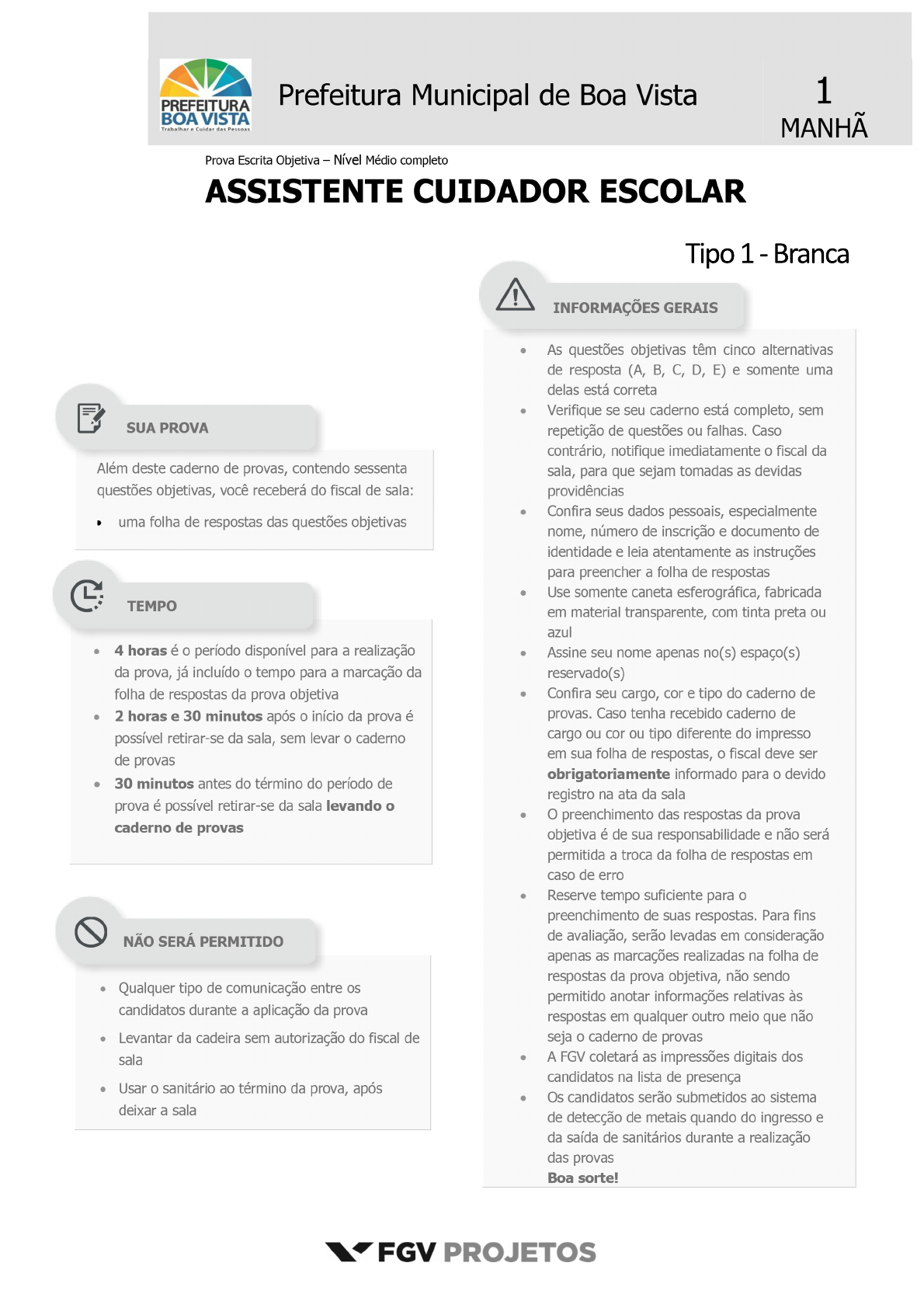 吀椀瀀漀 ⴀ 䈀爀愀渀挀愀 PREFEITURA MUNICIPAL DE BOA VISTA FGV – Projetos Assistente Cuidador Escolar Tipo 1 – Cor BRANCA – Página 3 Língua Portuguesa 1 “É fácil fazer regime, eu mesmo começo um novo todas as segundas-feiras”. Essa frase de um humorista destaca o seguinte assunto: (A) a dificuldade de fazer um regime de emagrecimento; (B) a facilidade de engordar que algumas pessoas têm; (C) a possibilidade de perder peso em uma semana; (D) a enorme variedade de regimes para emagrecer; (E) a grande quantidade de pessoas obesas no país. 2 Durante algum tempo, a Caixa Econômica Federal utilizava uma frase em sua propaganda; “Vem pra Caixa você também!”. O que a empresa pretendia com essa frase era: (A) divulgar as qualidades da Caixa; (B) ampliar o número de clientes; (C) demonstrar as vantagens de ser cliente da Caixa; (D) indicar os meios para alguém tornar-se cliente da Caixa; (E) convidar as pessoas a visitarem a Caixa. 3 Uma propaganda de um famoso sabão em pó dizia: “OMO lava mais branco!”. A frase pretende convencer o leitor de que esse sabão: (A) deve ser utilizado somente para roupas brancas; (B) demora menos tempo na lavagem da roupa; (C) lava maior quantidade de roupa; (D) custa mais barato; (E) mostra mais eficiência que os concorrentes. 4 Um grande empresário internacional proferiu a seguinte frase: “Achei que estava errado uma vez, mas eu estava enganado”. A frase demonstra um defeito pessoal do empresário, que é: (A) o orgulho; (B) a inveja; (C) a cobiça; (D) a gula; (E) a modéstia. 5 “As grandes épocas dizem: a arte. As épocas medíocres dizem: as artes”. A alternativa abaixo em que a passagem do singular ao plural NÃO acarreta mudança de sentido é: (A) o bem / os bens; (B) a humanidade / as humanidades; (C) a capital / as capitais; (D) a féria / as férias; (E) o vencimento / os vencimentos. 6 O humorista José Simão disse certa vez que “Terceira idade é aquela em que a gente bota os óculos para ouvir o rádio”. Com essa frase, o humorista denuncia um problema da velhice, que é: (A) a surdez; (B) a distração; (C) o esquecimento; (D) a deficiência visual; (E) a depressão. 7 A frase em que a grafia da palavra sublinhada está correta é: (A) “O que tiveres de fazer, faze-o depressa”; (B) “Os previlégios devem ser sempre combatidos”; (C) “Derrepente do riso fez-se o pranto”; (D) “Não há no mundo se não um modo de prosperar: roubando”; (E) “Acerca de dez anos atrás, as empresas decidiram mudar de filosofia”. 8 “[A exposição] incentivava a pedofilia e desrespeitava símbolos sacros” (O Globo, 26/08/2018). O termo pedofilia é definido no dicionário Houaiss (p. 1457) como “perversão de indivíduo adulto que se sente atraído por crianças”, em que se destaca o significado do radical grego filia: “atração”. O vocábulo abaixo, formado com o radical filia, que mostra seu significado corretamente é: (A) necrofilia – atração pelos mortos; (B) hemofilia – atração por hospitais; (C) francofilia – atração pela franqueza; (D) zoofilia – atração por doenças; (E) cinefilia – atração pelo movimento. 9 “Faça aos outros aquilo que eles não querem que você lhes faça, antes que eles te façam aquilo que você não quer que eles te façam”. (Millôr Fernandes) Entre os pronomes sublinhados nessa frase, aquele que NÃO se refere ou repete nenhum termo anterior é: (A) aquilo; (B) eles; (C) lhes; (D) te; (E) você. PREFEITURA MUNICIPAL DE BOA VISTA FGV – Projetos Assistente Cuidador Escolar Tipo 1 – Cor BRANCA – Página 4 10 “Muitas pessoas trabalham na indústria do petróleo e muitas outras trabalham graças a ela”. (Texto de propaganda do IBP) O termo “graças a” significa: (A) em agradecimento a ela; (B) como retribuição a ela; (C) por causa dela; (D) apesar dela; (E) com ela. 11 “O sistema de eleição em dois turnos foi criado em 1871 na Alemanha. Em eleições presidenciais, se expandiu para países tão diferentes quanto França, Portugal e Finlândia. Foi instalado em muitos países de redemocratização recente como o Brasil, Argentina, Chile, Peru e Equador. Quase toda a América Latina o adotou, assim como parte da Europa, da África e da Ásia”. (Época, 17/09/2018, p. 8) A revista fala da eleição de dois turnos do ponto de vista: (A) geográfico; (B) político; (C) econômico; (D) histórico; (E) social. 12 “O salário de um deputado federal é, em valor bruto, de R$33.763, o que representa o teto do serviço público. Os parlamentares têm ainda direito a inúmeros benefícios, como reembolso de despesas médicas, auxílio-moradia, verba de gabinete etc.”. Esse texto informativo do jornal Metro, de 17/09/2018, responde à seguinte pergunta: (A) É justo o salário dos deputados federais? (B) Quanto ganham os deputados federais? (C) Quais os benefícios recebidos pelos deputados federais? (D) Qual o salário líquido de cada deputado federal? (E) Os ganhos dos deputados federais são imorais? 13 “Pesquisas vêm comprovando importância expressiva do aleitamento nas últimas décadas...”; nesse segmento, ainda que mal colocado, o termo “nas últimas décadas” se refere a: (A) pesquisas; (B) vêm comprovando; (C) importância; (D) expressiva; (E) aleitamento. 14 Segundo um informe recente, uma firma estrangeira insistiu em abrir uma filial no estado de São Paulo porque “os paulistas são muito trabalhadores”. Esse argumento (entre aspas) se apoia num(a): (A) simplificação exagerada; (B) falsa analogia; (C) estatística tendenciosa; (D) troca entre causa/efeito; (E) estereótipo. 15 Uma rede de drogarias elaborou o seguinte anúncio: “Drogarias X – Ofertas imperdíveis e o melhor preço, você encontra aqui. Encontre a loja mais próxima em nosso site”. Para aumentar as vendas, a rede de drogarias apela para as seguintes vantagens: (A) preços baixos e facilidade de acesso; (B) facilidade de a