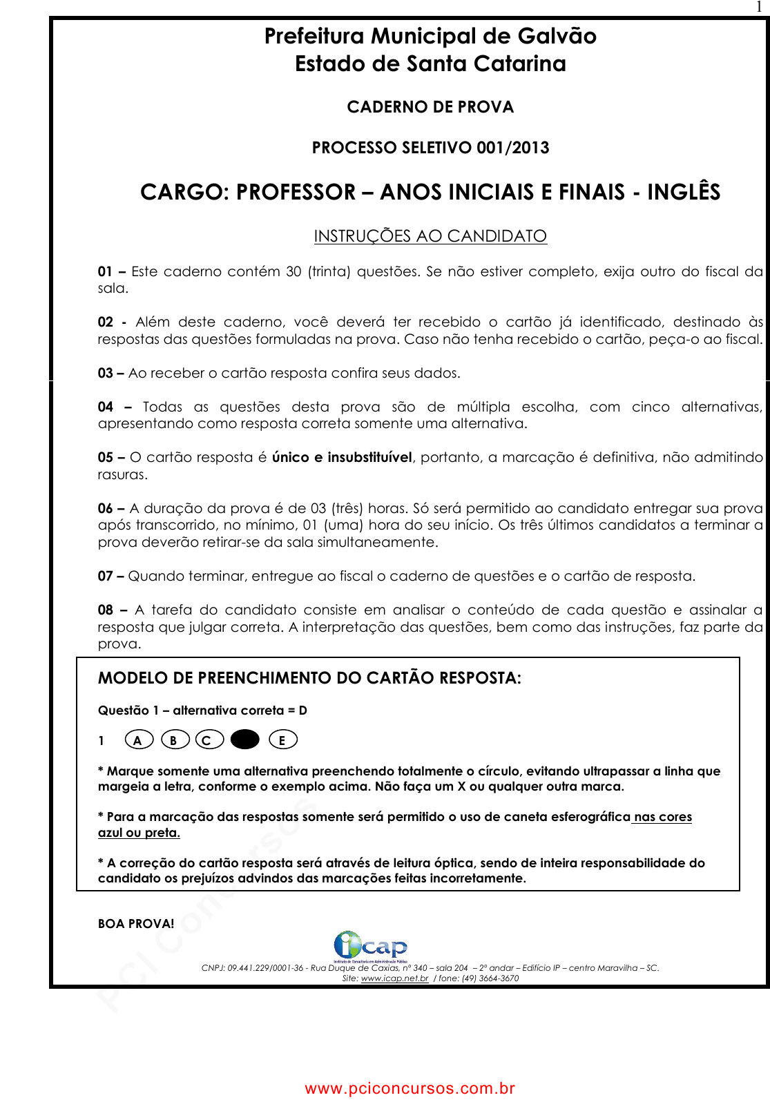 pcimarkpci MDAwMDowMDAwOjAwMDA6MDAwMDowMDAwOmZmZmY6MzZlOTpjMjU5:U3VuLCAxMiBTZXAgMjAyMSAxMDozNjowMCAtMDMwMA== 1 Prefeitura Municipal de Galvão Estado de Santa Catarina CADERNO DE PROVA PROCESSO SELETIVO 001/2013 CARGO: PROFESSOR – ANOS INICIAIS E FINAIS - INGLÊS INSTRUÇÕES AO CANDIDATO 01 – Este caderno contém 30 (trinta) questões. Se não estiver completo, exija outro do fiscal da sala. 02 - Além deste caderno, você deverá ter recebido o cartão já identificado, destinado às respostas das questões formuladas na prova. Caso não tenha recebido o cartão, peça-o ao fiscal. 03 – Ao receber o cartão resposta confira seus dados. 04 – Todas as questões desta prova são de múltipla escolha, com cinco alternativas, apresentando como resposta correta somente uma alternativa. 05 – O cartão resposta é único e insubstituível, portanto, a marcação é definitiva, não admitindo rasuras. 06 – A duração da prova é de 03 (três) horas. Só será permitido ao candidato entregar sua prova após transcorrido, no mínimo, 01 (uma) hora do seu início. Os três últimos candidatos a terminar a prova deverão retirar-se da sala simultaneamente. 07 – Quando terminar, entregue ao fiscal o caderno de questões e o cartão de resposta. 08 – A tarefa do candidato consiste em analisar o conteúdo de cada questão e assinalar a resposta que julgar correta. A interpretação das questões, bem como das instruções, faz parte da prova. MODELO DE PREENCHIMENTO DO CARTÃO RESPOSTA: Questão 1 – alternativa correta = D 1 A B C D E * Marque somente uma alternativa preenchendo totalmente o círculo, evitando ultrapassar a linha que margeia a letra, conforme o exemplo acima. Não faça um X ou qualquer outra marca. * Para a marcação das respostas somente será permitido o uso de caneta esferográfica nas cores azul ou preta. * A correção do cartão resposta será através de leitura óptica, sendo de inteira responsabilidade do candidato os prejuízos advindos das marcações feitas incorretamente. BOA PROVA! CNPJ: 09.441.229/0001-36 - Rua Duque de Caxias, nº 340 – sala 204 – 2º andar – Edifício IP – centro Maravilha – SC. Site: www.icap.net.br / fone: (49) 3664-3670 www.pciconcursos.com.br pcimarkpci MDAwMDowMDAwOjAwMDA6MDAwMDowMDAwOmZmZmY6MzZlOTpjMjU5:U3VuLCAxMiBTZXAgMjAyMSAxMDozNjowMCAtMDMwMA== 2 CONHECIMENTOS GERAIS PORTUGUÊS 01) Assinale a alternativa que apresenta erro no emprego do sinal indicativo de crase: a) Informamos a V.Sa. que aspiramos à paz do partido e estamos dispostos a qualquer esforço à preservação da democracia. b) De 14 à 20 do corrente, diariamente, de segunda a sexta-feira, das oito às dezenove horas, estaremos à disposição dos candidatos as vagas. c) 80% dos acidentes de trânsito são devidos às falhas humanas, 15% às deficiências das estradas e apenas 5% às imperfeições dos veículos. d) O esforço empreendido é muito inferior às vantagens no que diz respeito à evolução do sistema financeiro nacional e às oportunidades de integração com o mercado global. e) O prefeito foi à sala de reuniões, às oito horas, dar as informações sobre o problema a todos que estiverem à espera. 02) Há erro de concordância verbal na alternativa: a) Nós é que somos brasileiros de verdade. b) Quando forem dez horas, sairemos. c) O sol abrasador ou a seca implacável prejudicarão as lavouras. d) Às pessoas pouco ambiciosas basta o essencial. e) Os Estados Unidos exemplificam a política presidencialista como Minas Gerais demonstram a política provincial. 03) Em qual das alternativas cometeu-se erro de concordância nominal? a) É necessário certidão autenticada. b) O asfalto e o concreto rígido cobrem o asfalto. c) Mostrou-lhe que estava quite com impostos e taxas relativos ao veículo, mas não conseguiu evitar que lhe fosse imputado multa pela infração e desacato proferidos. d) Seguirão inclusas as planilhas que foram elaboradas. e) As grandes florestas e rios proporcionam belas paisagens aos visitantes. 04) Há erro no emprego da regência verbal na alternativa: a) Não aspirava a nenhum cargo, portanto não estava obrigado a obedecer àquelas ordens absurdas, nem o impediriam de responder a todas as provocações. b) Devem obedecer, a qualquer custo, ao regulamento. c) Avisei aos alunos que as provas chegaram. d) Que filme você assistirá hoje à noite? e) Não o convidei para a reunião que se realizaria. www.pciconcursos.com.br pcimarkpci MDAwMDowMDAwOjAwMDA6MDAwMDowMDAwOmZmZmY6MzZlOTpjMjU5:U3VuLCAxMiBTZXAgMjAyMSAxMDozNjowMCAtMDMwMA== 3 05) O sujeito da oração “Pedaço de dor e de saudade povoavam sua pobre alma” deve ser classificado como: a) Composto. b) Simples. c) Indeterminado. d) Oculto. e) Oração sem sujeito. 06) Assinale a alternativa em que todas as palavras estão acentuadas corretamente e pela mesma regra: a) Juíza, saída, ruína, possuía. b) Mistério, pônei, tínheis, lençóis. c) Caráter, câncer, míster, fêmur. d) Papéis, troféus, necrópsia, récorde. e) Lêvedo, bíquini, friíssimo, ridículo. 07) Assinale a alternativa que apresenta palavra ou palavras com divisão silábica incorreta: a) Cin-zei-ro, quais-quer, Ja-cu-í. b) Pro-i-bi-do, sa-ú-de, cons-ci-ên-cia. c) Subs-cre-ver, di-á-ri-o, lon-gín-qu-o. d) Cáp-su-la, cons-ti-tui-ção, ar-cai-co. e) Ta-i-nha, co-o-pe-rar, or-quí-dea. MATEMÁTICA 08) No revestimento de uma piscina de 6m de comprimento por 4m de largura e 1,5 m de profundidade um grupo de 6 operários trabalhando 6 horas diárias levaram 5 dias para terminar. Se na mesma piscina tivessem trabalhado apenas 4 desses operários e eles quisessem terminar no mesmo prazo, quantas horas diárias eles deveriam trabalhar? a) 8 b) 9 c) 10 d) 11 e) 7 09) Quando informado um trinômio no caso: e que ele represente o quadrado da soma de dois termos. para que isso possa ser verdade, k deve assumir o valor de: a) 7 b) 21 c) 35 d) 49 e)121 www.pciconcursos.com.br pcimarkp