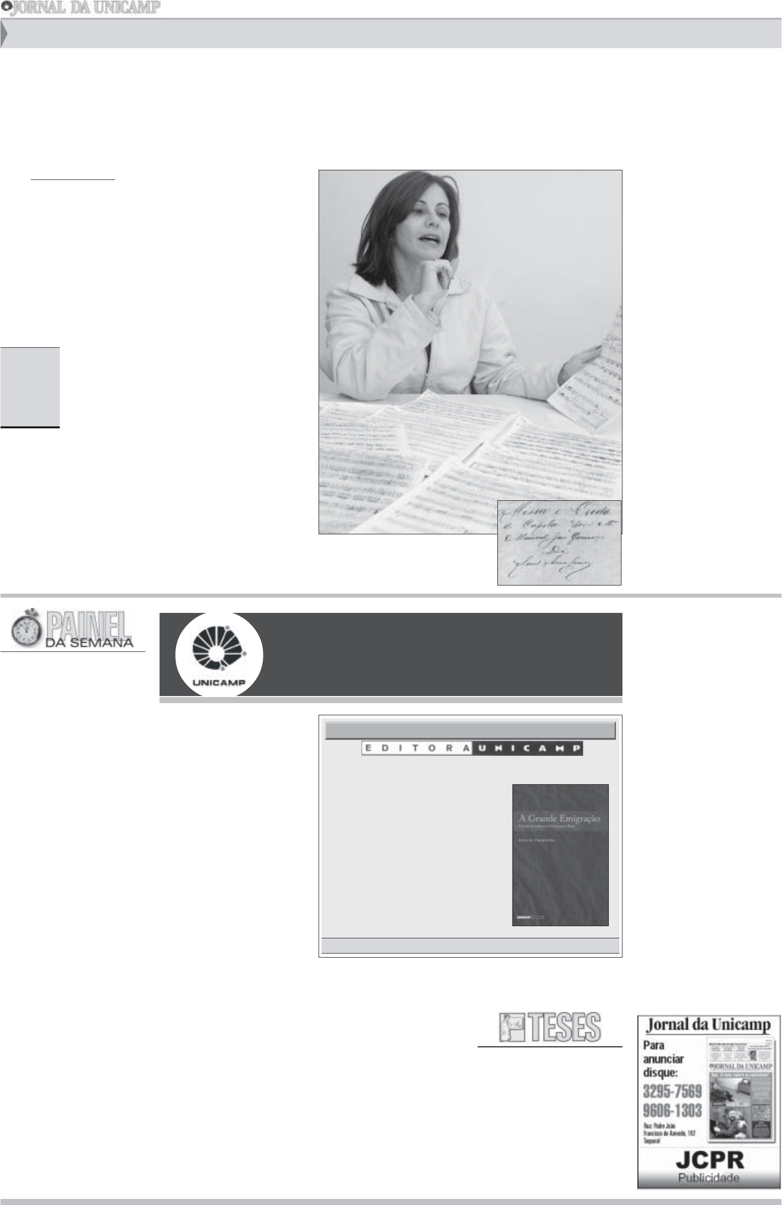 10 Universidade Estadual de Campinas – 11 a 17 de setembro de 2006 ACADÊMICAVIDA Visite as livrarias da Editora da Unicamp no prédio da Biblioteca Central “César Lattes” - Fone 3521-7030 e no prédio do IEL - Fone 3521-4140 Adquira os lançamentos e reedições com 50% de desconto nas nossas livrarias. Válido somente durante o primeiro mês de lançamento. LIVRO DA SEMANALIVRO DA SEMANA !!!!!Exposição instigante – Foi aberta no dia 4 e segue até 22 de setembro, no Espa- ço Cultural Casa do Lago, a exposição “de- marcAÇÕES”. A mostra tem curadoria da artista e professora Regina Johas, do Insti- tuto de Artes (IA) da Unicamp, e reúne jo- vens artistas em torno de proposições ins- tigantes no campo contemporâneo da arte. São trabalhos variados, como instalações, intervenção urbana, desenho, ação e per- formance. Participam da exposição Aira Bon- fim, Anabela Santos, Flávio Uno, Geórgia Vilela, Ilma Guideroli, Ilana Szapiro, Yasmim Flores, João Alberto, Luiz Samuel, Luiz Quei- roz, Paula Dalgalarrondo e Rodolpho Parigi. A visitação acontece das 13h às 20h. No dia 14 de setembro, às 13 horas, haverá um bate-papo com os artistas, aberto ao públi- co, no auditório da Casa do Lago. Informa- ções: 3788-7017 ou casadolago@reitori- a.unicamp.br !!!!!Salão das Decisões - A Comissão Per- manente para os Vestibulares da Unicamp (Comvest) participa do Salão das Decisões, feira de orientação vocacional do interior de São Paulo, que acontece entre os dias 12 e 13, no Galleria Shopping, em Campinas. A feira, voltada a estudantes do ensino médio e de cursinhos que ainda não optaram pela profissão, foi criada em 2005. Atraiu em seu primeiro ano cerca de 4 mil estudantes que tiveram contato com faculdades, cursos, tes- tes vocacionais, palestras sobre as diferen- tes áreas de ensino, entre outras atrações. Vinte e seis instituições de ensino superior já confirmaram a presença este ano e vão mostrar seus cursos e diferenciais para os alunos de Campinas e região. Informações: www.salaodasdecisoes.com.br !!!!!Jornada AUGM - A Jornada de Jovens Pesquisadores da AUGM “Empreendedo- rismo, Inovação tecnológica e Desenvolvi- mento regional” acontece de 13 a 15, no Centro de Convenções da Unicamp. Infor- mações: www.cori.unicamp.br/jornadas !!!!!Wittgenstein - O IV Colóquio Nacional e o I Colóquio Internacional Wittgenstein a- contecem nos dias 14 e 15, a partir das 9 horas, no auditório II do Instituto de Filosofia e Ciências Humanas (IFCH). Informações: seceven@unicamp.br !!!!!Doador Universitário - A unidade mó- vel do Centro de Hematologia e Hemoterapia (Hemocentro) da Unicamp faz coleta de san- gue no dia 14, das 8h às 12h, nas seguintes unidades: FE, FEC, IE, IC, Centros e Núcle- os. A coleta, que acontece no estacionamen- to da FE, faz parte do Projeto Doador Uni- versitário. As próximas acontecem no dia 19 de outubro, no ciclo Básico II, abrangendo IB, BC, FEF e Ciclo Básico II. No dia 9 de dezembro a coleta será no estacionamento do IEL, atingindo IMECC, IFCH e IA. !!!!!Saúde Mental e Trabalho - O Laborató- rio de Saúde Mental e Trabalho (DPMP) e demais departamentos da Faculdade de Ci- ências Médicas (FCM), em parceria com a Agência para Formação Profissional da Uni- camp (AFPU), promovem no dia 16, das 8h às 18h, no auditório I do Centro de Desenvol- vimento Cultural (CDC), a “I Jornada Sul-Su- deste de Saúde Mental e Trabalho”. O públi- co-alvo são psiquiatras, médicos do trabalho e profissionais interessados na área. O even- to visa contribuir com fundamentos teórico- práticos para atender a alta complexidade diagnóstica, a falta de uniformização de con- dutas e as dificuldades no estabelecimento do nexo causal desses transtornos. Informações e inscrições: www.extecamp.unicamp.br !!!!!Medicina Ambulatorial – A endocrino- logista Laura Sterian Ward é uma das or- ganizadoras do livro “Medicina Ambulatorial” (Editora Atheneu), lançado no dia 17 de agos- to, no Espaço das Artes da FCM. A obra, que tem como co-organizadores Antonio Carlos Lopes e Maria Elena Guariento, nasce como referência na área, dado que praticamente inexiste literatura brasileira sobre o assunto. “A idéia de escrever o livro veio do fato de nossos colegas e alunos usarem normas, manuais ou livros traduzidos do inglês como parâmetros de conduta. Ocorre, porém, que muitas vezes estes não são adequados à nos- sa realidade”, afirma a especialista. O livro, de mais de mil páginas e com preço sugerido de R$ 247, contou com a colaboração de 69 professores e médicos da FCM. !!!!!Práticas esportivas - A Faculdade de Educação Física está com inscrições aber- tas para diversas práticas esportivas: condi- cionamento físico, ginástica localizada, dan- ça de salão, natação, entre outras ativida- des. Inscrições até 15 de setembro em ww- w.fef.unicamp.br/re-ic/default.asp !!!!!Clínico geral - O Centro de Saúde da Comunidade (Cecom) recebe, de 4 a 16, currículos para preenchimento de uma vaga temporária de médico clínico geral. Podem ser entregues das 9h às 11h30 e das 14h às 16h, no Setor de Recursos Humanos do Cecom. Junto ao currículo devem ser ane- xadas cópias do RG, de documento que com- prove a escolaridade e de residência médi- ca em Ginecologia e Obstetrícia. Informa- ções: (19) 3521-9007. !!!!!Livre-Docência - A Faculdade de Edu- cação (FE) recebe, até dia 11, inscrições ao concurso de Livre-Docência, na área de Psi- cologia do Desenvolvimento para a Facul- dade de Educação (FE). Podem ser feitas das 9h às 12h e das 14h às 17h, na Secreta- ria da FE, mediante requerimento contendo nome, domicílio e profissão, dirigido ao dire- tor da unidade, acompanhado dos documen- tos constantes no Diário Oficial de 8 de agos- to. Ou no endereço www.sg.unicamp.br/ procsel. Informações: (19) 3521-7965 ou veralu@unicamp.br !!!!!Biologia “Recurso floral para a