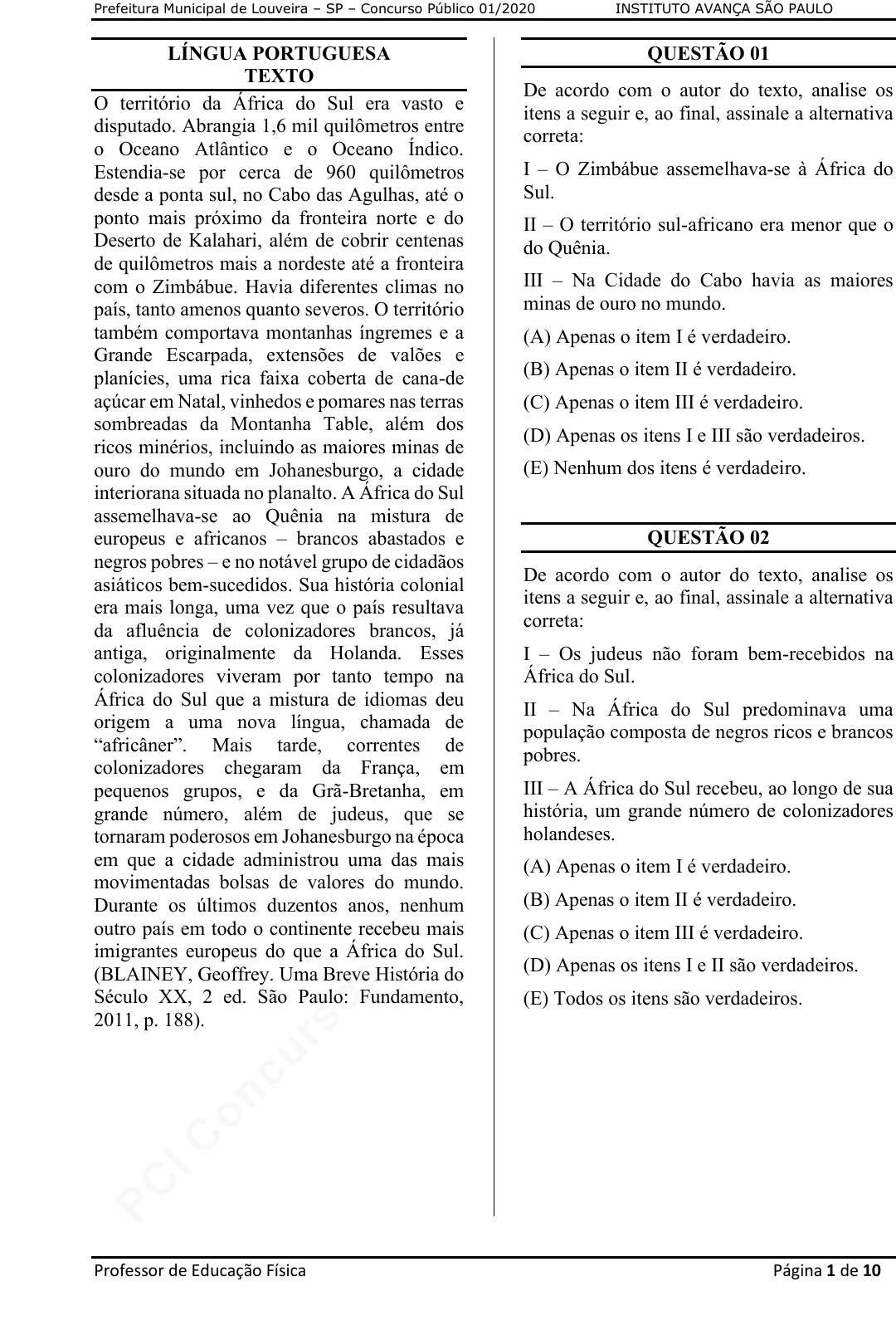 pcimarkpci MDAwMDowMDAwOjAwMDA6MDAwMDowMDAwOmZmZmY6MzZlOTpjMjU5:U3VuLCAxMiBTZXAgMjAyMSAxMzozOTowMiAtMDMwMA== Prefeitura Municipal de Louveira – SP – Concurso Público 01/2020 INSTITUTO AVANÇA SÃO PAULO Professor de Educação Física Página 1 de 10 LÍNGUA PORTUGUESA TEXTO O território da África do Sul era vasto e disputado. Abrangia 1,6 mil quilômetros entre o Oceano Atlântico e o Oceano Índico. Estendia-se por cerca de 960 quilômetros desde a ponta sul, no Cabo das Agulhas, até o ponto mais próximo da fronteira norte e do Deserto de Kalahari, além de cobrir centenas de quilômetros mais a nordeste até a fronteira com o Zimbábue. Havia diferentes climas no país, tanto amenos quanto severos. O território também comportava montanhas íngremes e a Grande Escarpada, extensões de valões e planícies, uma rica faixa coberta de cana-de açúcar em Natal, vinhedos e pomares nas terras sombreadas da Montanha Table, além dos ricos minérios, incluindo as maiores minas de ouro do mundo em Johanesburgo, a cidade interiorana situada no planalto. A África do Sul assemelhava-se ao Quênia na mistura de europeus e africanos – brancos abastados e negros pobres – e no notável grupo de cidadãos asiáticos bem-sucedidos. Sua história colonial era mais longa, uma vez que o país resultava da afluência de colonizadores brancos, já antiga, originalmente da Holanda. Esses colonizadores viveram por tanto tempo na África do Sul que a mistura de idiomas deu origem a uma nova língua, chamada de “africâner”. Mais tarde, correntes de colonizadores chegaram da França, em pequenos grupos, e da Grã-Bretanha, em grande número, além de judeus, que se tornaram poderosos em Johanesburgo na época em que a cidade administrou uma das mais movimentadas bolsas de valores do mundo. Durante os últimos duzentos anos, nenhum outro país em todo o continente recebeu mais imigrantes europeus do que a África do Sul. (BLAINEY, Geoffrey. Uma Breve História do Século XX, 2 ed. São Paulo: Fundamento, 2011, p. 188). QUESTÃO 01 De acordo com o autor do texto, analise os itens a seguir e, ao final, assinale a alternativa correta: I – O Zimbábue assemelhava-se à África do Sul. II – O território sul-africano era menor que o do Quênia. III – Na Cidade do Cabo havia as maiores minas de ouro no mundo. (A) Apenas o item I é verdadeiro. (B) Apenas o item II é verdadeiro. (C) Apenas o item III é verdadeiro. (D) Apenas os itens I e III são verdadeiros. (E) Nenhum dos itens é verdadeiro. QUESTÃO 02 De acordo com o autor do texto, analise os itens a seguir e, ao final, assinale a alternativa correta: I – Os judeus não foram bem-recebidos na África do Sul. II – Na África do Sul predominava uma população composta de negros ricos e brancos pobres. III – A África do Sul recebeu, ao longo de sua história, um grande número de colonizadores holandeses. (A) Apenas o item I é verdadeiro. (B) Apenas o item II é verdadeiro. (C) Apenas o item III é verdadeiro. (D) Apenas os itens I e II são verdadeiros. (E) Todos os itens são verdadeiros. pcimarkpci MDAwMDowMDAwOjAwMDA6MDAwMDowMDAwOmZmZmY6MzZlOTpjMjU5:U3VuLCAxMiBTZXAgMjAyMSAxMzozOTowMiAtMDMwMA== Prefeitura Municipal de Louveira – SP – Concurso Público 01/2020 INSTITUTO AVANÇA SÃO PAULO Professor de Educação Física Página 2 de 10 QUESTÃO 03 Na primeira parte do texto, o autor utiliza a palavra “íngreme”. Assinale a alternativa que apresenta um antônimo para tal palavra: (A) declivoso. (B) escarpado. (C) árduo. (D) empinado. (E) reto. QUESTÃO 04 Na oração “O território também comportava montanhas íngremes”, o verbo “comportar” está conjugado no: (A) pretérito imperfeito. (B) pretérito perfeito. (C) pretérito mais-que-perfeito. (D) pretérito quase perfeito. (E) pretérito super perfeito. QUESTÃO 05 São considerados tipos de advérbio, EXCETO: (A) negação. (B) intensidade. (C) dúvida. (D) tempo. (E) certeza. MATEMÁTICA E RACIOCÍNIO LÓGICO QUESTÃO 06 Uma exposição de automóveis importados recebeu no último ano 2.200 visitantes. Para o próximo ano, a empresa responsável pelo evento pretende aumentar o número de visitantes em 25%. Se isso vier a ocorrer, pode- se afirmar que o número de visitantes será de: (A) 2.600. (B) 2.620. (C) 2.700. (D) 2.750. (E) 2.860. QUESTÃO 07 Assinale a alternativa que apresenta corretamente os números pares antecessor e sucessor de 4.054. (A) 4.055 e 4.056. (B) 4.052 e 4.056. (C) 4.052 e 4.053. (D) 4.054 e 4.055. (E) 4.062 e 4.066. QUESTÃO 08 No final do ano, uma chácara custava R$ 5.600,00 de aluguel. No entanto, cobrava- se uma multa de 10% em caso de danificação de algum móvel. Se houvesse um dano, o valor a ser pago seria de R$: (A) 6.000,00. (B) 6.100,00. (C) 6.150,00. (D) 6.160,00. (E) 6.200,00. QUESTÃO 09 Uma equipe de futebol disputa 59 partidas por ano. Se manter essa média, quantas partidas terá disputado em 13 anos? (A) 757. (B) 767. (C) 772. (D) 775. (E) 786. QUESTÃO 10 Assinale a alternativa que apresenta corretamente o resultado para a seguinte operação matemática: 10,5 + 10% (A) 11,55. (B) 10,55. (C) 10,50. (D) 11,50. (E) 12,00. pcimarkpci MDAwMDowMDAwOjAwMDA6MDAwMDowMDAwOmZmZmY6MzZlOTpjMjU5:U3VuLCAxMiBTZXAgMjAyMSAxMzozOTowMiAtMDMwMA== Prefeitura Municipal de Louveira – SP – Concurso Público 01/2020 INSTITUTO AVANÇA SÃO PAULO Professor de Educação Física Página 3 de 10 ATUALIDADES QUESTÃO 11 O renomado empresário brasileiro, Carlos Ghosn, que estava em prisão domiciliar no Japão, empreendeu fuga no final do ano de 2019. Assinale o país para o qual referido empresário fugiu: (A) Luxemburgo. (B) Líbia. (C) Líbano. (D) México. (E) Marrocos. QUESTÃO 12 No início do mês de janeiro de 2020, os Estados Unidos atacaram, por meio de drones, a comitiva em que se encontrava, dentre outras pessoas, um importante general iraniano, Qasem Soleimani. Assinale o nome do país onde referido ataque foi efetuado: (A) I