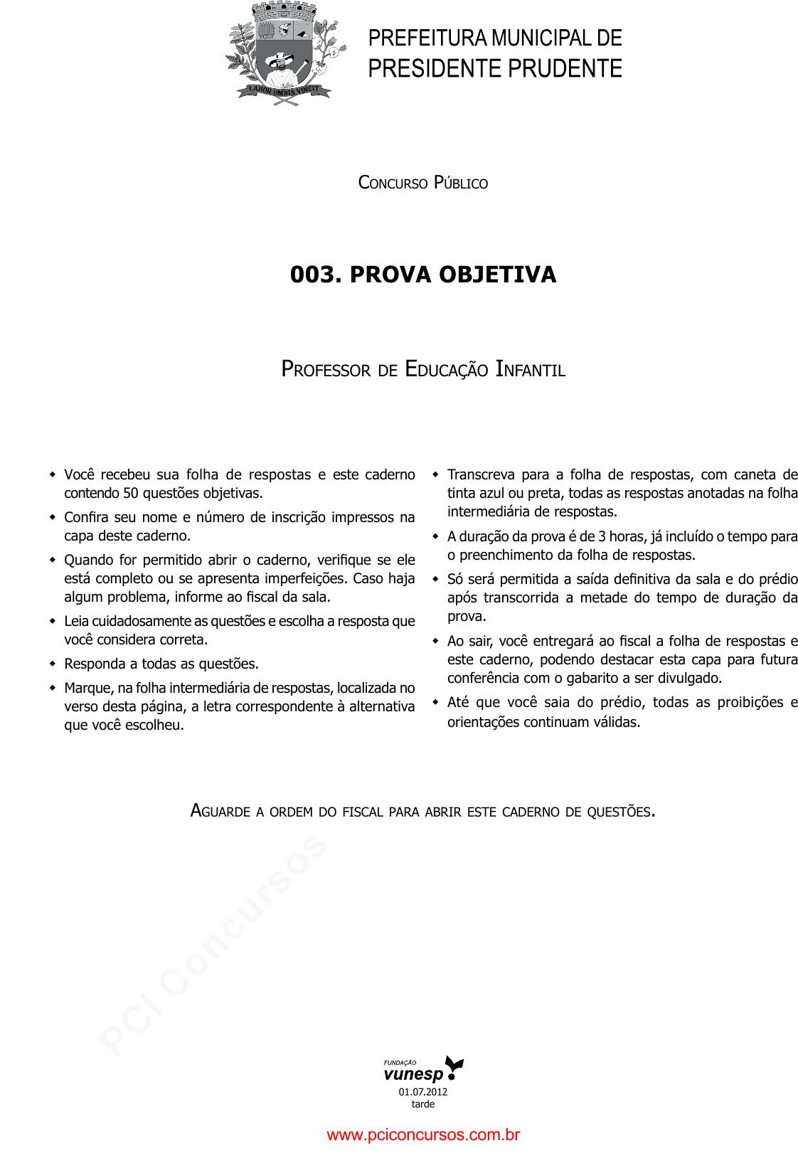 pcimarkpci MDAwMDowMDAwOjAwMDA6MDAwMDowMDAwOmZmZmY6MzZlOTpjMjU5:U3VuLCAxMiBTZXAgMjAyMSAxOTo0NTo0MyAtMDMwMA== ConCurso PúbliCo 003. Prova objetiva Professor de eduCação infantil Você recebeu sua folha de respostas e este caderno contendo 50 questões objetivas. Confira seu nome e número de inscrição impressos na capa deste caderno. Quando for permitido abrir o caderno, verifique se ele está completo ou se apresenta imperfeições. Caso haja algum problema, informe ao fiscal da sala. Leia cuidadosamente as questões e escolha a resposta que você considera correta. Responda a todas as questões. Marque, na folha intermediária de respostas, localizada no verso desta página, a letra correspondente à alternativa que você escolheu. Transcreva para a folha de respostas, com caneta de tinta azul ou preta, todas as respostas anotadas na folha intermediária de respostas. A duração da prova é de 3 horas, já incluído o tempo para o preenchimento da folha de respostas. Só será permitida a saída definitiva da sala e do prédio após transcorrida a metade do tempo de duração da prova. Ao sair, você entregará ao fiscal a folha de respostas e este caderno, podendo destacar esta capa para futura conferência com o gabarito a ser divulgado. Até que você saia do prédio, todas as proibições e orientações continuam válidas. aguarde a ordem do fisCal Para abrir este Caderno de questões. 01.07.2012 tarde www.pciconcursos.com.br pcimarkpci MDAwMDowMDAwOjAwMDA6MDAwMDowMDAwOmZmZmY6MzZlOTpjMjU5:U3VuLCAxMiBTZXAgMjAyMSAxOTo0NTo0MyAtMDMwMA== Folha IntermedIárIa de respostas www.pciconcursos.com.br pcimarkpci MDAwMDowMDAwOjAwMDA6MDAwMDowMDAwOmZmZmY6MzZlOTpjMjU5:U3VuLCAxMiBTZXAgMjAyMSAxOTo0NTo0MyAtMDMwMA== 3 PMPP1101/003-ProfEducInfantil-tarde CONHECIMENTOS GERAIS LíNGuA PORTuGuESA Leia o texto para responder às questões de números 01 a 04. “Roda, roda, roda, pé, pé, pé, roda, roda, roda, caranguejo peixe é.” Será que as crianças de hoje ainda cantam assim? Do que elas brincam? “Há uma cultura da infância muito viva no Brasil e devemos prestar atenção nela”, constata Renata Meirelles, coordenadora do projeto Território do Brincar. Apesar dessa diversidade, Renata admite que os empecilhos para que as práticas infantis se desenvolvam são grandes. Afinal, a interação entre os mais novos tem diminuído. Em muitas ci- dades, as brincadeiras de rua mudaram de endereço: agora estão nas áreas comuns dos prédios e nos parques. Também têm lugar em organizações não governamentais (ONGs) e no pátio das escolas, que as crianças frequentam após as aulas para atividades do contraturno; sua vida está cada vez mais institucionalizada e, nesses locais, há quase sempre um adulto indicando o que devem fazer. Normalmente são divididas por idade, o que gera grupos homogêneos e dificulta a troca de repertórios. “Criança sem tempo livre perde o espaço mais intrínseco do brincar, que é a liberdade de decidir e de construir”, avalia. (Ana Ligia Scachetti, Quem quer brincar, põe o dedo aqui. Nova Escola, n.º 252, maio 2012. Adaptado.) 01. É correto afirmar que o texto (A) responsabiliza a escola por impedir as brincadeiras infantis. (B) critica o governo por delegar às ONGs a tarefa de ensinar a brincar. (C) orienta as famílias a permitirem que as crianças brinquem na rua. (D) sugere que as escolas abram mais espaços para as brin- cadeiras cotidianas. (E) insinua a limitação do espaço físico da brincadeira e alerta quanto a esse problema. 02. Nos momentos de brincar, a presença quase constante dos adultos na vida das crianças é apresentada como um problema, pois (A) organizam grupos de faixas etárias muito diferentes nas brincadeiras. (B) impedem que as crianças brinquem quanto tempo de- sejarem. (C) interferem e determinam o modo como elas devem brincar. (D) sugerem opções de brincadeiras em excesso. (E) limitam o espaço em que as crianças devem brincar. 03. Segundo o texto, em relação à faixa etária, a formação de grupos homogêneos de crianças (A) é adequada, pois garante menor quantidade de conflitos. (B) gera a institucionalização da vida infantil, exigindo sempre a presença de um adulto. (C) é bem sucedida quando todas as crianças escolhem o mesmo tipo de brincadeira. (D) é problemática, pois não promove conhecimentos variados de brincar. (E) obriga a presença de um adulto para que haja a mediação de conflitos. 04. “Criança sem tempo livre perde o espaço mais intrínseco do brincar, que é a liberdade de decidir e de construir”. Dentre as palavras a seguir, a que apresenta sentido oposto à destacada nesse trecho é (A) interno. (B) inerente. (C) exterior. (D) íntimo. (E) próprio. Leia o texto a seguir, para responder às questões de números 05 e 06. Em todo homem existe um ímpeto criador. O ímpeto de criar nasce da inconclusão do homem. A educação é mais autêntica quanto mais desenvolve este ímpeto ontológico de criar. A edu- cação deve ser desinibidora e não restritiva. É necessário darmos oportunidade para que os educandos sejam eles mesmos. Caso contrário domesticamos, o que significa a negação da educação. A educação deve estimular a opção e afirmar o homem como homem. O homem não é, pois, um homem para a adaptação. A edu- cação não é um processo de adaptação do indivíduo à sociedade. O homem deve transformar a realidade para ser mais. (Paulo Freire. Educação e mudança. Paz e Terra,1979, 24.ª ed. Adaptado) 05. De acordo com o texto, a educação deve (A) investir na exercitação para garantir habilidades criativas aos educandos. (B) diferenciar-se do ato de domesticação, estimulando a criatividade. (C) garantir adaptação dos indivíduos na sociedade. (D) abolir a disciplina imposta aos educandos, a fim de que sejam eles mesmos. (E) restringir certas manifestações espontâneas dos educandos. www.pciconcursos.com.br pcimarkpci MDAwMDowMDAwOjAwMDA6MDAwMDowMDAw