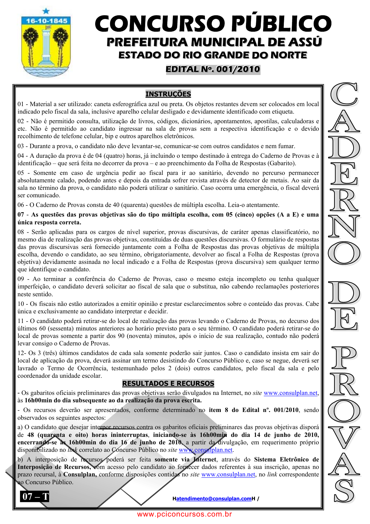pcimarkpci MDAwMDowMDAwOjAwMDA6MDAwMDowMDAwOmZmZmY6MzZlOTpjMjU5:U3VuLCAxMiBTZXAgMjAyMSAyMDowODo1NiAtMDMwMA== INSTRUÇÕES 01 - Material a ser utilizado: caneta esferográfica azul ou preta. Os objetos restantes devem ser colocados em local indicado pelo fiscal da sala, inclusive aparelho celular desligado e devidamente identificado com etiqueta. 02 - Não é permitido consulta, utilização de livros, códigos, dicionários, apontamentos, apostilas, calculadoras e etc. Não é permitido ao candidato ingressar na sala de provas sem a respectiva identificação e o devido recolhimento de telefone celular, bip e outros aparelhos eletrônicos. 03 - Durante a prova, o candidato não deve levantar-se, comunicar-se com outros candidatos e nem fumar. 04 - A duração da prova é de 04 (quatro) horas, já incluindo o tempo destinado à entrega do Caderno de Provas e à identificação – que será feita no decorrer da prova – e ao preenchimento da Folha de Respostas (Gabarito). 05 - Somente em caso de urgência pedir ao fiscal para ir ao sanitário, devendo no percurso permanecer absolutamente calado, podendo antes e depois da entrada sofrer revista através de detector de metais. Ao sair da sala no término da prova, o candidato não poderá utilizar o sanitário. Caso ocorra uma emergência, o fiscal deverá ser comunicado. 06 - O Caderno de Provas consta de 40 (quarenta) questões de múltipla escolha. Leia-o atentamente. 07 - As questões das provas objetivas são do tipo múltipla escolha, com 05 (cinco) opções (A a E) e uma única resposta correta. 08 - Serão aplicadas para os cargos de nível superior, provas discursivas, de caráter apenas classificatório, no mesmo dia de realização das provas objetivas, constituídas de duas questões discursivas. O formulário de respostas das provas discursivas será fornecido juntamente com a Folha de Respostas das provas objetivas de múltipla escolha, devendo o candidato, ao seu término, obrigatoriamente, devolver ao fiscal a Folha de Respostas (prova objetiva) devidamente assinada no local indicado e a Folha de Respostas (prova discursiva) sem qualquer termo que identifique o candidato. 09 - Ao terminar a conferência do Caderno de Provas, caso o mesmo esteja incompleto ou tenha qualquer imperfeição, o candidato deverá solicitar ao fiscal de sala que o substitua, não cabendo reclamações posteriores neste sentido. 10 - Os fiscais não estão autorizados a emitir opinião e prestar esclarecimentos sobre o conteúdo das provas. Cabe única e exclusivamente ao candidato interpretar e decidir. 11 - O candidato poderá retirar-se do local de realização das provas levando o Caderno de Provas, no decurso dos últimos 60 (sessenta) minutos anteriores ao horário previsto para o seu término. O candidato poderá retirar-se do local de provas somente a partir dos 90 (noventa) minutos, após o início de sua realização, contudo não poderá levar consigo o Caderno de Provas. 12- Os 3 (três) últimos candidatos de cada sala somente poderão sair juntos. Caso o candidato insista em sair do local de aplicação da prova, deverá assinar um termo desistindo do Concurso Público e, caso se negue, deverá ser lavrado o Termo de Ocorrência, testemunhado pelos 2 (dois) outros candidatos, pelo fiscal da sala e pelo coordenador da unidade escolar. RESULTADOS E RECURSOS - Os gabaritos oficiais preliminares das provas objetivas serão divulgados na Internet, no site www.consulplan.net, às 16h00min do dia subsequente ao da realização da prova escrita. - Os recursos deverão ser apresentados, conforme determinado no item 8 do Edital nº. 001/2010, sendo observados os seguintes aspectos: a) O candidato que desejar interpor recursos contra os gabaritos oficiais preliminares das provas objetivas disporá de 48 (quarenta e oito) horas ininterruptas, iniciando-se às 16h00min do dia 14 de junho de 2010, encerrando-se às 16h00min do dia 16 de junho de 2010, a partir da divulgação, em requerimento próprio disponibilizado no link correlato ao Concurso Público no site www.consulplan.net. b) A interposição de recursos poderá ser feita somente via Internet, através do Sistema Eletrônico de Interposição de Recursos, com acesso pelo candidato ao fornecer dados referentes à sua inscrição, apenas no prazo recursal, à Consulplan, conforme disposições contidas no site www.consulplan.net, no link correspondente ao Concurso Público. 07 – T Hatendimento@consulplan.comH / PPPRRREEEFFFEEEIIITTTUUURRRAAA MMMUUUNNNIIICCCIIIPPPAAALLL DDDEEE AAASSSSSSÚÚÚ EEESSSTTTAAADDDOOO DDDOOO RRRIIIOOO GGGRRRAAANNNDDDEEE DDDOOO NNNOOORRRTTTEEE EEEDDDIIITTTAAALLL NNNººº... 000000111///222000111000 www.pciconcursos.com.br pcimarkpci MDAwMDowMDAwOjAwMDA6MDAwMDowMDAwOmZmZmY6MzZlOTpjMjU5:U3VuLCAxMiBTZXAgMjAyMSAyMDowODo1NiAtMDMwMA== CCCOOONNNCCCUUURRRSSSOOO PPPÚÚÚBBBLLLIIICCCOOO ––– PPPRRREEEFFFEEEIIITTTUUURRRAAA MMMUUUNNNIIICCCIIIPPPAAALLL DDDEEE AAASSSSSSÚÚÚ///RRRNNN PROFESSOR DE EDUCAÇÃO INFANTIL AO ENSINO FUNDAMENTAL www.consulplan.net atendimento@consulplan.com - 2 - CCCAAARRRGGGOOO::: PPPRRROOOFFFEEESSSSSSOOORRR DDDEEE EEEDDDUUUCCCAAAÇÇÇÃÃÃOOO IIINNNFFFAAANNNTTTIIILLL AAAOOO EEENNNSSSIIINNNOOO FFFUUUNNNDDDAAAMMMEEENNNTTTAAALLL TEXTO: Palavras e ideias Há alguns anos, o Dr. Johnson O’Connor, do Laboratório de Engenharia Humana, de Boston, e do Instituto de Tecnologia, de Hoboken, Nova Jersey, submeteu a um teste de vocabulário cem alunos de um curso de formação de dirigentes de empresas industriais (industrial executives), os executivos. Cinco anos mais tarde, verificou que os dez por cento que haviam revelado maior conhecimento ocupavam cargos de direção, ao passo que dos vinte e cinco por cento mais “fracos” nenhum alcançara igual posição. Isso não prova, entretanto, que, para vencer na vida, basta ter um bom vocabulário; outras qualidades se fazem, evidentemente, necessárias. Mas parece não restar dúvida de que, dispon