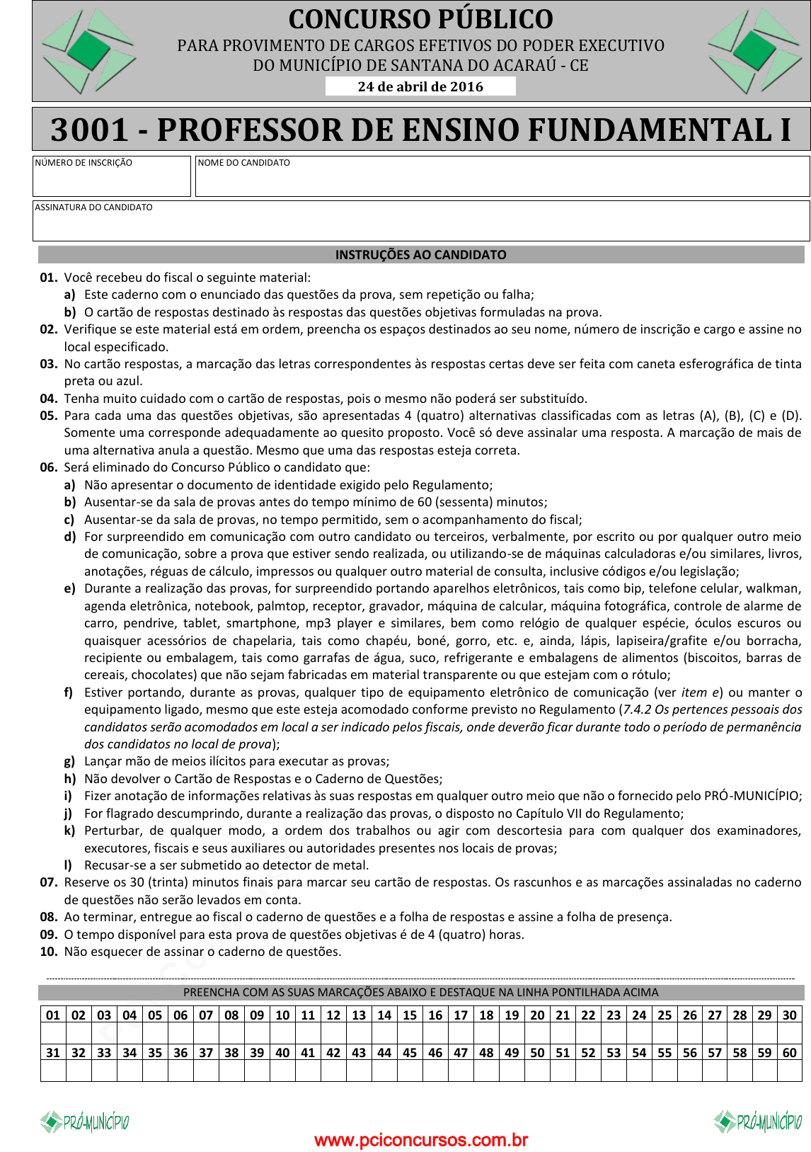 pcimarkpci MDAwMDowMDAwOjAwMDA6MDAwMDowMDAwOmZmZmY6MzZlOTpjMjU5:U3VuLCAxMiBTZXAgMjAyMSAyMTowNjo0MSAtMDMwMA== CONCURSO PÚBLICO PARA PROVIMENTO DE CARGOS EFETIVOS DO PODER EXECUTIVO DO MUNICÍPIO DE SANTANA DO ACARAÚ - CE 3001 - PROFESSOR DE ENSINO FUNDAMENTAL I NÚMERO DE INSCRIÇÃO NOME DO CANDIDATO ASSINATURA DO CANDIDATO INSTRUÇÕES AO CANDIDATO 01. Você recebeu do fiscal o seguinte material: a) Este caderno com o enunciado das questões da prova, sem repetição ou falha; b) O cartão de respostas destinado às respostas das questões objetivas formuladas na prova. 02. Verifique se este material está em ordem, preencha os espaços destinados ao seu nome, número de inscrição e cargo e assine no local especificado. 03. No cartão respostas, a marcação das letras correspondentes às respostas certas deve ser feita com caneta esferográfica de tinta preta ou azul. 04. Tenha muito cuidado com o cartão de respostas, pois o mesmo não poderá ser substituído. 05. Para cada uma das questões objetivas, são apresentadas 4 (quatro) alternativas classificadas com as letras (A), (B), (C) e (D). Somente uma corresponde adequadamente ao quesito proposto. Você só deve assinalar uma resposta. A marcação de mais de uma alternativa anula a questão. Mesmo que uma das respostas esteja correta. 06. Será eliminado do Concurso Público o candidato que: a) Não apresentar o documento de identidade exigido pelo Regulamento; b) Ausentar-se da sala de provas antes do tempo mínimo de 60 (sessenta) minutos; c) Ausentar-se da sala de provas, no tempo permitido, sem o acompanhamento do fiscal; d) For surpreendido em comunicação com outro candidato ou terceiros, verbalmente, por escrito ou por qualquer outro meio de comunicação, sobre a prova que estiver sendo realizada, ou utilizando-se de máquinas calculadoras e/ou similares, livros, anotações, réguas de cálculo, impressos ou qualquer outro material de consulta, inclusive códigos e/ou legislação; e) Durante a realização das provas, for surpreendido portando aparelhos eletrônicos, tais como bip, telefone celular, walkman, agenda eletrônica, notebook, palmtop, receptor, gravador, máquina de calcular, máquina fotográfica, controle de alarme de carro, pendrive, tablet, smartphone, mp3 player e similares, bem como relógio de qualquer espécie, óculos escuros ou quaisquer acessórios de chapelaria, tais como chapéu, boné, gorro, etc. e, ainda, lápis, lapiseira/grafite e/ou borracha, recipiente ou embalagem, tais como garrafas de água, suco, refrigerante e embalagens de alimentos (biscoitos, barras de cereais, chocolates) que não sejam fabricadas em material transparente ou que estejam com o rótulo; f) Estiver portando, durante as provas, qualquer tipo de equipamento eletrônico de comunicação (ver item e) ou manter o equipamento ligado, mesmo que este esteja acomodado conforme previsto no Regulamento (7.4.2 Os pertences pessoais dos candidatos serão acomodados em local a ser indicado pelos fiscais, onde deverão ficar durante todo o período de permanência dos candidatos no local de prova); g) Lançar mão de meios ilícitos para executar as provas; h) Não devolver o Cartão de Respostas e o Caderno de Questões; i) Fizer anotação de informações relativas às suas respostas em qualquer outro meio que não o fornecido pelo PRÓ-MUNICÍPIO; j) For flagrado descumprindo, durante a realização das provas, o disposto no Capítulo VII do Regulamento; k) Perturbar, de qualquer modo, a ordem dos trabalhos ou agir com descortesia para com qualquer dos examinadores, executores, fiscais e seus auxiliares ou autoridades presentes nos locais de provas; l) Recusar-se a ser submetido ao detector de metal. 07. Reserve os 30 (trinta) minutos finais para marcar seu cartão de respostas. Os rascunhos e as marcações assinaladas no caderno de questões não serão levados em conta. 08. Ao terminar, entregue ao fiscal o caderno de questões e a folha de respostas e assine a folha de presença. 09. O tempo disponível para esta prova de questões objetivas é de 4 (quatro) horas. 10. Não esquecer de assinar o caderno de questões. PREENCHA COM AS SUAS MARCAÇÕES ABAIXO E DESTAQUE NA LINHA PONTILHADA ACIMA 01 02 03 04 05 06 07 08 09 10 11 12 13 14 15 16 17 18 19 20 21 22 23 24 25 26 27 28 29 30 31 32 33 34 35 36 37 38 39 40 41 42 43 44 45 46 47 48 49 50 51 52 53 54 55 56 57 58 59 60 24 de abril de 2016 www.pciconcursos.com.br pcimarkpci MDAwMDowMDAwOjAwMDA6MDAwMDowMDAwOmZmZmY6MzZlOTpjMjU5:U3VuLCAxMiBTZXAgMjAyMSAyMTowNjo0MSAtMDMwMA== www.pciconcursos.com.br pcimarkpci MDAwMDowMDAwOjAwMDA6MDAwMDowMDAwOmZmZmY6MzZlOTpjMjU5:U3VuLCAxMiBTZXAgMjAyMSAyMTowNjo0MSAtMDMwMA== 3001 - PROFESSOR DE ENSINO FUNDAMENTAL I CONCURSO PÚBLICO DA PREFEITURA MUNICIPAL DE SANTANA DO ACARAÚ-CE 1 de 10 PORTUGUÊS Leia o texto de Rosely Sayão para responder as questões de 01 a 07: Trocamos educação por tecnologia? Rosely Sayão Estamos trocando a educação para a liberdade responsável e para a autonomia pelos recursos tecnológicos mais avançados, é isso? O caminho é sedutor porque bem mais simples e com custos bem menores. Os pais, preocupados com a segurança dos filhos – ah, o que não temos feito em nome desse item! –, acabam consumindo, sem grandes reflexões, as ideias mais absurdas. Como essa, por exemplo, do controle da localização dos filhos pelo celular. Ora, ora! Quem diria que a geração pós-Segunda Guerra, que lutou pela democracia e pela liberdade, que bradou contra a tutela da família, chegasse a esse ponto com os próprios filhos? “Ainda somos os mesmos e vivemos como nossos pais...” O controle é eficiente para acalmar as aflições dos pais. É eficiente, ainda, para provocar efeitos colaterais dos mais indesejáveis, e outros riscos. Vejamos. Em primeiro lugar, se tem quem controle o jovem, por que haveria ele de se responsabilizar pelo autocontrole? Mais fácil deixar para os pais essa tarefa difícil já que eles ass