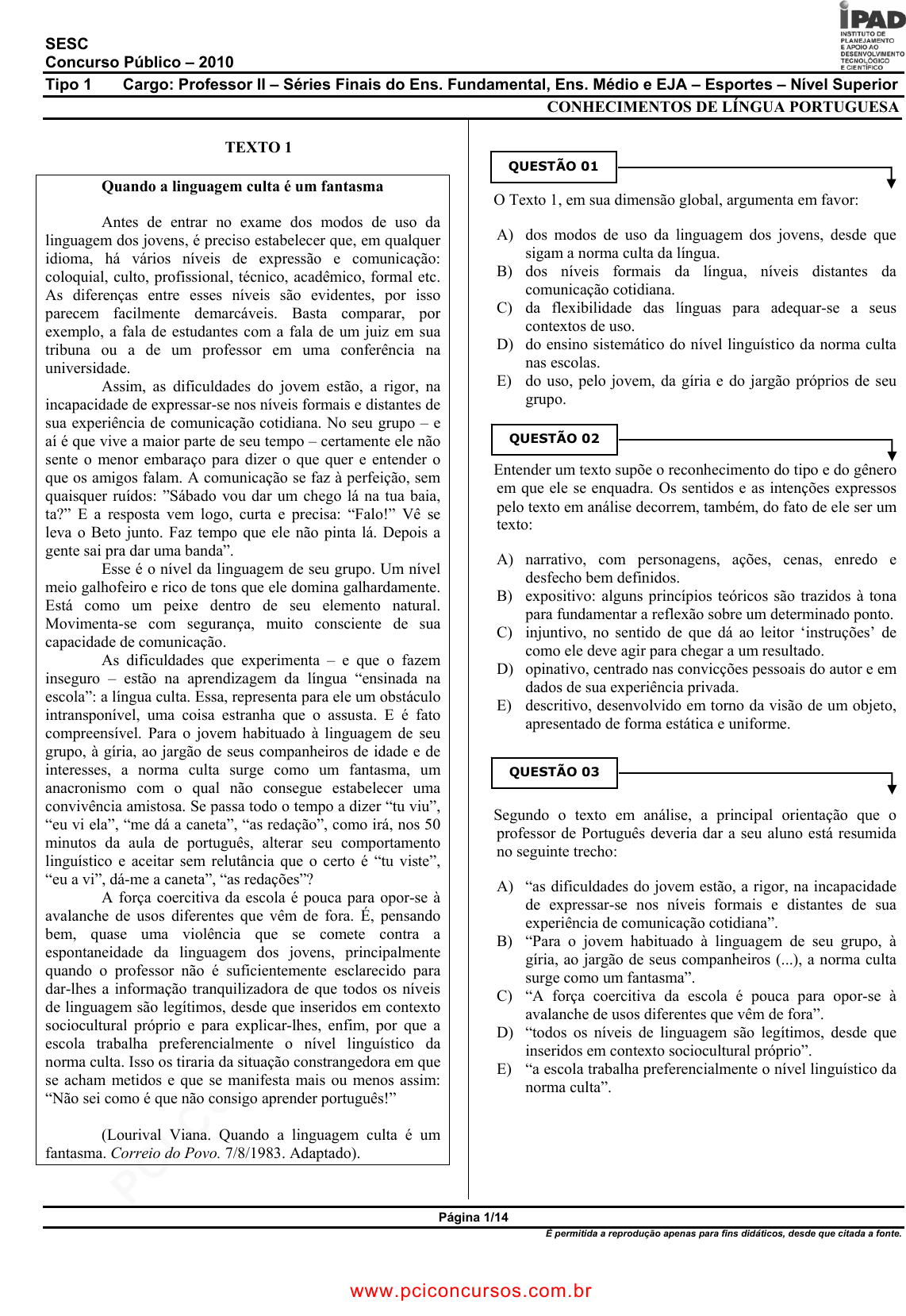 pcimarkpci MDAwMDowMDAwOjAwMDA6MDAwMDowMDAwOmZmZmY6MzZlOTpjMjU5:TW9uLCAxMyBTZXAgMjAyMSAwODoxOTo1NyAtMDMwMA== SESC Concurso Público – 2010 Tipo 1 Cargo: Professor II – Séries Finais do Ens. Fundamental, Ens. Médio e EJA – Esportes – Nível Superior Página 1/14 É permitida a reprodução apenas para fins didáticos, desde que citada a fonte. CONHECIMENTOS DE LÍNGUA PORTUGUESA TEXTO 1 Quando a linguagem culta é um fantasma Antes de entrar no exame dos modos de uso da linguagem dos jovens, é preciso estabelecer que, em qualquer idioma, há vários níveis de expressão e comunicação: coloquial, culto, profissional, técnico, acadêmico, formal etc. As diferenças entre esses níveis são evidentes, por isso parecem facilmente demarcáveis. Basta comparar, por exemplo, a fala de estudantes com a fala de um juiz em sua tribuna ou a de um professor em uma conferência na universidade. Assim, as dificuldades do jovem estão, a rigor, na incapacidade de expressar-se nos níveis formais e distantes de sua experiência de comunicação cotidiana. No seu grupo – e aí é que vive a maior parte de seu tempo – certamente ele não sente o menor embaraço para dizer o que quer e entender o que os amigos falam. A comunicação se faz à perfeição, sem quaisquer ruídos: ”Sábado vou dar um chego lá na tua baia, ta?” E a resposta vem logo, curta e precisa: “Falo!” Vê se leva o Beto junto. Faz tempo que ele não pinta lá. Depois a gente sai pra dar uma banda”. Esse é o nível da linguagem de seu grupo. Um nível meio galhofeiro e rico de tons que ele domina galhardamente. Está como um peixe dentro de seu elemento natural. Movimenta-se com segurança, muito consciente de sua capacidade de comunicação. As dificuldades que experimenta – e que o fazem inseguro – estão na aprendizagem da língua “ensinada na escola”: a língua culta. Essa, representa para ele um obstáculo intransponível, uma coisa estranha que o assusta. E é fato compreensível. Para o jovem habituado à linguagem de seu grupo, à gíria, ao jargão de seus companheiros de idade e de interesses, a norma culta surge como um fantasma, um anacronismo com o qual não consegue estabelecer uma convivência amistosa. Se passa todo o tempo a dizer “tu viu”, “eu vi ela”, “me dá a caneta”, “as redação”, como irá, nos 50 minutos da aula de português, alterar seu comportamento linguístico e aceitar sem relutância que o certo é “tu viste”, “eu a vi”, dá-me a caneta”, “as redações”? A força coercitiva da escola é pouca para opor-se à avalanche de usos diferentes que vêm de fora. É, pensando bem, quase uma violência que se comete contra a espontaneidade da linguagem dos jovens, principalmente quando o professor não é suficientemente esclarecido para dar-lhes a informação tranquilizadora de que todos os níveis de linguagem são legítimos, desde que inseridos em contexto sociocultural próprio e para explicar-lhes, enfim, por que a escola trabalha preferencialmente o nível linguístico da norma culta. Isso os tiraria da situação constrangedora em que se acham metidos e que se manifesta mais ou menos assim: “Não sei como é que não consigo aprender português!” (Lourival Viana. Quando a linguagem culta é um fantasma. Correio do Povo. 7/8/1983. Adaptado). O Texto 1, em sua dimensão global, argumenta em favor: A) dos modos de uso da linguagem dos jovens, desde que sigam a norma culta da língua. B) dos níveis formais da língua, níveis distantes da comunicação cotidiana. C) da flexibilidade das línguas para adequar-se a seus contextos de uso. D) do ensino sistemático do nível linguístico da norma culta nas escolas. E) do uso, pelo jovem, da gíria e do jargão próprios de seu grupo. Entender um texto supõe o reconhecimento do tipo e do gênero em que ele se enquadra. Os sentidos e as intenções expressos pelo texto em análise decorrem, também, do fato de ele ser um texto: A) narrativo, com personagens, ações, cenas, enredo e desfecho bem definidos. B) expositivo: alguns princípios teóricos são trazidos à tona para fundamentar a reflexão sobre um determinado ponto. C) injuntivo, no sentido de que dá ao leitor ‘instruções’ de como ele deve agir para chegar a um resultado. D) opinativo, centrado nas convicções pessoais do autor e em dados de sua experiência privada. E) descritivo, desenvolvido em torno da visão de um objeto, apresentado de forma estática e uniforme. Segundo o texto em análise, a principal orientação que o professor de Português deveria dar a seu aluno está resumida no seguinte trecho: A) “as dificuldades do jovem estão, a rigor, na incapacidade de expressar-se nos níveis formais e distantes de sua experiência de comunicação cotidiana”. B) “Para o jovem habituado à linguagem de seu grupo, à gíria, ao jargão de seus companheiros (...), a norma culta surge como um fantasma”. C) “A força coercitiva da escola é pouca para opor-se à avalanche de usos diferentes que vêm de fora”. D) “todos os níveis de linguagem são legítimos, desde que inseridos em contexto sociocultural próprio”. E) “a escola trabalha preferencialmente o nível linguístico da norma culta”. QUESTÃO 02 QUESTÃO 03 QUESTÃO 01 www.pciconcursos.com.br pcimarkpci MDAwMDowMDAwOjAwMDA6MDAwMDowMDAwOmZmZmY6MzZlOTpjMjU5:TW9uLCAxMyBTZXAgMjAyMSAwODoxOTo1NyAtMDMwMA== SESC Concurso Público – 2010 Tipo 1 Cargo: Professor II – Séries Finais do Ens. Fundamental, Ens. Médio e EJA – Esportes – Nível Superior Página 2/14 É permitida a reprodução apenas para fins didáticos, desde que citada a fonte. RA SC U N H O Releia o trecho: “A força coercitiva da escola é pouca para opor-se à avalanche de usos diferentes que vêm de fora”. Por esse trecho, se poderia concluir que: A) a linguagem do meio social exerce sobre a linguagem da escola um poder quase incontrolável. B) a escola não se capacita par