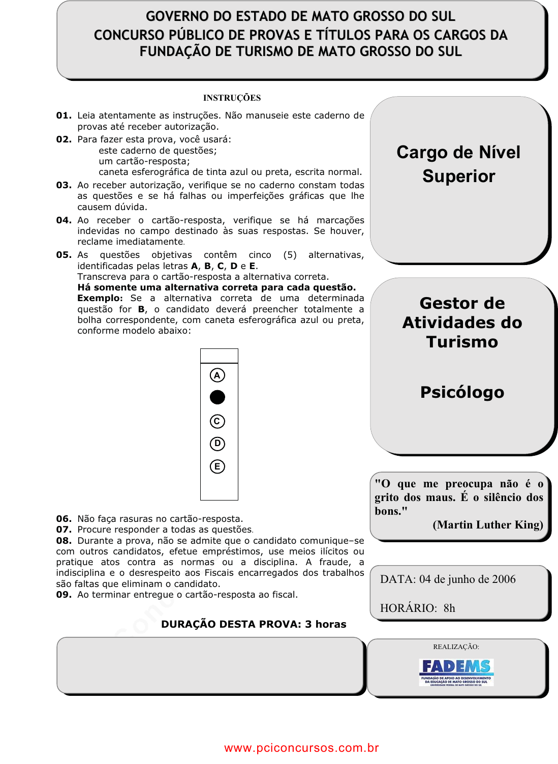 pcimarkpci MDAwMDowMDAwOjAwMDA6MDAwMDowMDAwOmZmZmY6MzZlOTpjMjU5:TW9uLCAxMyBTZXAgMjAyMSAxNDoyMjoyMSAtMDMwMA== INSTRUÇÕES 01. Leia atentamente as instruções. Não manuseie este caderno de provas até receber autorização. 02. Para fazer esta prova, você usará: este caderno de questões; um cartão-resposta; caneta esferográfica de tinta azul ou preta, escrita normal. 03. Ao receber autorização, verifique se no caderno constam todas as questões e se há falhas ou imperfeições gráficas que lhe causem dúvida. 04. Ao receber o cartão-resposta, verifique se há marcações indevidas no campo destinado às suas respostas. Se houver, reclame imediatamente. 05. As questões objetivas contêm cinco (5) alternativas, identificadas pelas letras A, B, C, D e E. Transcreva para o cartão-resposta a alternativa correta. Há somente uma alternativa correta para cada questão. Exemplo: Se a alternativa correta de uma determinada questão for B, o candidato deverá preencher totalmente a bolha correspondente, com caneta esferográfica azul ou preta, conforme modelo abaixo: 06. Não faça rasuras no cartão-resposta. 07. Procure responder a todas as questões. 08. Durante a prova, não se admite que o candidato comunique–se com outros candidatos, efetue empréstimos, use meios ilícitos ou pratique atos contra as normas ou a disciplina. A fraude, a indisciplina e o desrespeito aos Fiscais encarregados dos trabalhos são faltas que eliminam o candidato. 09. Ao terminar entregue o cartão-resposta ao fiscal. DURAÇÃO DESTA PROVA: 3 horas Cargo de Nível Superior "O que me preocupa não é o grito dos maus. É o silêncio dos bons." (Martin Luther King) DATA: 04 de junho de 2006 HORÁRIO: 8h Gestor de Atividades do Turismo Psicólogo REALIZAÇÃO: GGOOVVEERRNNOO DDOO EESSTTAADDOO DDEE MMAATTOO GGRROOSSSSOO DDOO SSUULL CCOONNCCUURRSSOO PPÚÚBBLLIICCOO DDEE PPRROOVVAASS EE TTÍÍTTUULLOOSS PPAARRAA OOSS CCAARRGGOOSS DDAA FFUUNNDDAAÇÇÃÃOO DDEE TTUURRIISSMMOO DDEE MMAATTOO GGRROOSSSSOO DDOO SSUULL A C D E www.pciconcursos.com.br pcimarkpci MDAwMDowMDAwOjAwMDA6MDAwMDowMDAwOmZmZmY6MzZlOTpjMjU5:TW9uLCAxMyBTZXAgMjAyMSAxNDoyMjoyMSAtMDMwMA== Língua Portuguesa 01 - Assinale a alternativa em que todas as palavras contêm fonema /z/: A) exemplar; juiz; azedo; subsídio. B) azul; exímio; casal; êxito. C) exilar; hesitar; zebra; preposição. D) visão; próximo; transitivo; previsível. E) preposição; visar; inglês; cortês. 02 - Considerando as palavras “negócio” (o negócio) e “negocio”(eu negocio), assinale a alternativa que contém o comentário INCORRETO: A) a única diferença existente entre elas está na acentuação. B) a primeira é um substantivo e a segunda é um verbo. C) ambas são paroxítonas, porém apenas a primeira, por terminar em ditongo, recebe acento gráfico. D) a separação silábica da primeira é “ne-gó-cio” e a da segunda é ne-go-ci-o, produzindo-se, respectivamente, um ditongo e um hiato. E) há uma diferença de timbre na vogal da segunda sílaba: aberto e fechado, respectivamente. 03 - A divisão silábica está correta na alternativa: A) pers-cru-tar; ne-cta-ri-na; gra-tu-i-to. B) im-pa-cto; so-ci-o-ló-gi-co; psi-co-lo-gia. C) su-bs-tan-ci-al; es-sên-ci-a; fi-sio-te-ra-pia. D) ego-ís-mo; se-le-ci-o-nar; pi-au-ien-se. E) per-cep-ção; en-xá-güe; i-de-al. 04 - Quanto à grafia das palavras está correta a alternativa: A) Consequência; recisão; deferência. B) Rescisão; possui; acessível. C) Inascessível; distribue; continui. D) Influe; hesitar; prodijioso. E) Pertinênsia; requesitar; espontaniedade. 05 - O único par classificado como parônimo está na alternativa: A) extrato/estrato. B) saia (substantivo)/saia (verbo). C) paço/passo. D) onde/aonde. E) deferir/diferir. 06 - Assinale a alternativa em que as palavras estão corretamente acentuadas: A) Contribúi; (eu) apóio; Bataguaçú. B) Essêncial; econômia; lingüístico. C) Projétil; encontrá-lo; conseguí-lo. D) Eloqüência; perspicácia; persegui-lo. E) Carácteres; ítens; aspécto. www.pciconcursos.com.br pcimarkpci MDAwMDowMDAwOjAwMDA6MDAwMDowMDAwOmZmZmY6MzZlOTpjMjU5:TW9uLCAxMyBTZXAgMjAyMSAxNDoyMjoyMSAtMDMwMA== 07 - Assinale a alternativa em que a(s) palavra(s) em destaque está(estão) corretamente empregada(s): A) As pessoas que inflingirem a lei serão punidas. B) Impuseram uma quantia vultuosa como condição para devolver a criança aos pais C) O daltônico é incapaz de descriminar determinadas cores. D) Pelas respostas que apresentou à banca, não havia outro adjetivo que lhe coubesse senão “insipiente”. Ignorava até os princípios teóricos mais elementares... E) Procure descobrir porque não quiseram convidá-lo. 08 - Assinale a alternativa em que as palavras contêm dígrafo, ditongo, tritongo e hiato, respectivamente: A) Qualquer; série; enxagüei; apreender. B) Chimarrão; desafio; apoio; voar. C) Assessor; paisagem; comboio; estância. D) Guitarra; ruim; Piauí; história. E) Léguas; imediato; igual; saúde. 09 - Assinale a alternativa em que a correlação letra/fonema está corretamente indicada: A) Desconhecimento = 15 letras/14 fonemas. B) Perplexo = 8 letras/8 fonemas. C) Experimentariam = 15 letras/14 fonemas. D) Enquadramento = 13 letras/10 fonemas. E) Enroscar = 8 letras/8 fonemas. 10 - Ainda com respeito à regência, assinale a alternativa INCORRETA: A) Respondeu todas as questões e estava certo que acertaria todas, pois a prova estava fácil demais. B) No dia determinado, procederam à leitura das provas. C) O filho sucedeu ao pai na presidência da empresa. D) Assistimos a uma bela partida de vôlei. E) Aonde você irá domingo? 11 - Quanto à regência, assinale a alternativa que preenche corretamente as lacunas da frase que segue: Não ___ queira mal, mas saiba _____ ele é pessoa ______ palavra duvido. A) o; de que; cuja. B) o; que; à cuja. C) lhe; que; de cuja. D) lhe; que; à cuja. E) lhe; de que; de cuja. 12 - No período “Agiu 