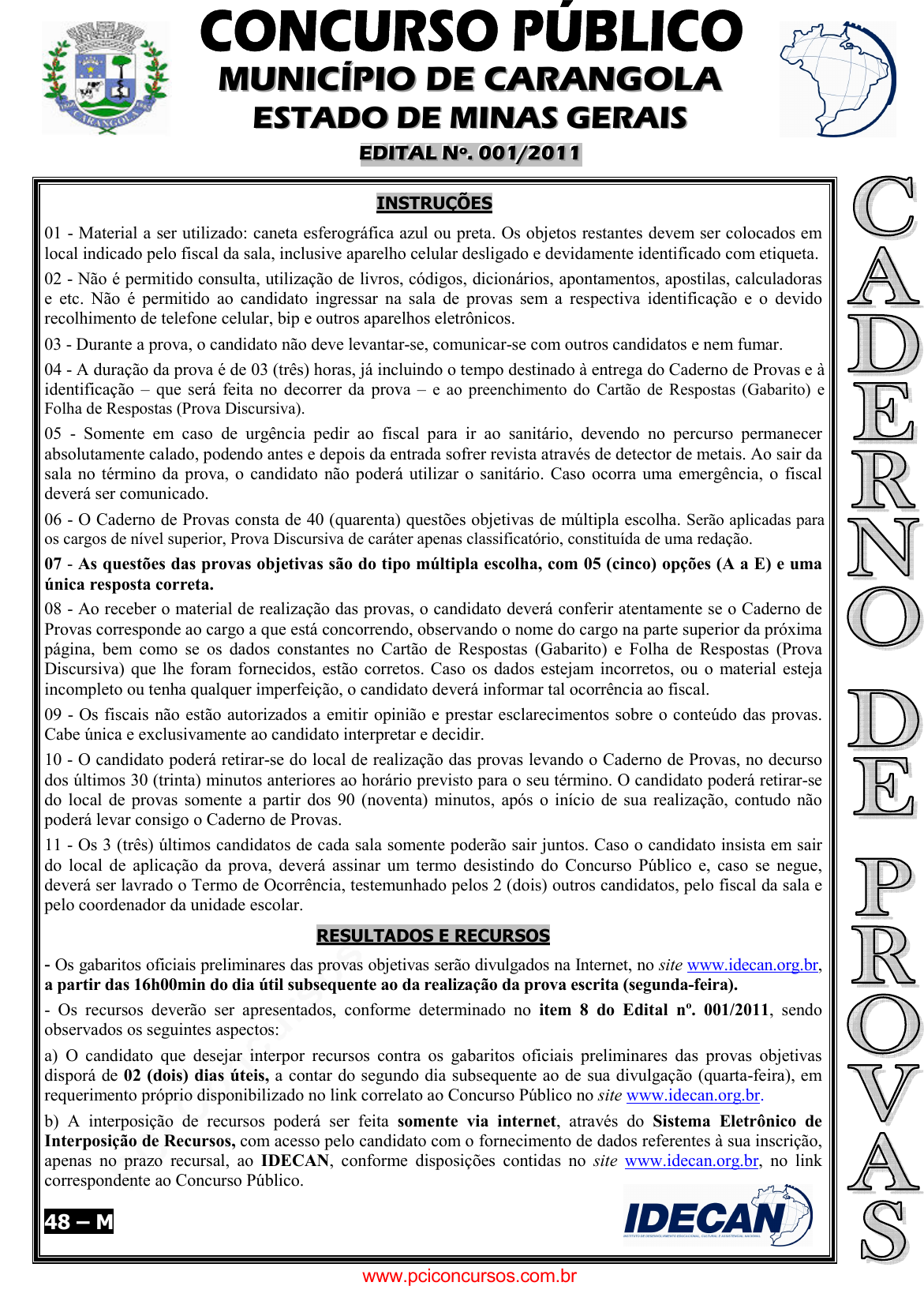 pcimarkpci MDAwMDowMDAwOjAwMDA6MDAwMDowMDAwOmZmZmY6MzZlOTpjMjU5:TW9uLCAxMyBTZXAgMjAyMSAxNDozNDo1NCAtMDMwMA== MMMUUUNNNIIICCCÍÍÍPPPIIIOOO DDDEEE CCCAAARRRAAANNNGGGOOOLLLAAA EEESSSTTTAAADDDOOO DDDEEE MMMIIINNNAAASSS GGGEEERRRAAAIIISSS EEEDDDIIITTTAAALLL NNNººº... 000000111///222000111111 INSTRUÇÕES 01 - Material a ser utilizado: caneta esferográfica azul ou preta. Os objetos restantes devem ser colocados em local indicado pelo fiscal da sala, inclusive aparelho celular desligado e devidamente identificado com etiqueta. 02 - Não é permitido consulta, utilização de livros, códigos, dicionários, apontamentos, apostilas, calculadoras e etc. Não é permitido ao candidato ingressar na sala de provas sem a respectiva identificação e o devido recolhimento de telefone celular, bip e outros aparelhos eletrônicos. 03 - Durante a prova, o candidato não deve levantar-se, comunicar-se com outros candidatos e nem fumar. 04 - A duração da prova é de 03 (três) horas, já incluindo o tempo destinado à entrega do Caderno de Provas e à identificação – que será feita no decorrer da prova – e ao preenchimento do Cartão de Respostas (Gabarito) e Folha de Respostas (Prova Discursiva). 05 - Somente em caso de urgência pedir ao fiscal para ir ao sanitário, devendo no percurso permanecer absolutamente calado, podendo antes e depois da entrada sofrer revista através de detector de metais. Ao sair da sala no término da prova, o candidato não poderá utilizar o sanitário. Caso ocorra uma emergência, o fiscal deverá ser comunicado. 06 - O Caderno de Provas consta de 40 (quarenta) questões objetivas de múltipla escolha. Serão aplicadas para os cargos de nível superior, Prova Discursiva de caráter apenas classificatório, constituída de uma redação. 07 - As questões das provas objetivas são do tipo múltipla escolha, com 05 (cinco) opções (A a E) e uma única resposta correta. 08 - Ao receber o material de realização das provas, o candidato deverá conferir atentamente se o Caderno de Provas corresponde ao cargo a que está concorrendo, observando o nome do cargo na parte superior da próxima página, bem como se os dados constantes no Cartão de Respostas (Gabarito) e Folha de Respostas (Prova Discursiva) que lhe foram fornecidos, estão corretos. Caso os dados estejam incorretos, ou o material esteja incompleto ou tenha qualquer imperfeição, o candidato deverá informar tal ocorrência ao fiscal. 09 - Os fiscais não estão autorizados a emitir opinião e prestar esclarecimentos sobre o conteúdo das provas. Cabe única e exclusivamente ao candidato interpretar e decidir. 10 - O candidato poderá retirar-se do local de realização das provas levando o Caderno de Provas, no decurso dos últimos 30 (trinta) minutos anteriores ao horário previsto para o seu término. O candidato poderá retirar-se do local de provas somente a partir dos 90 (noventa) minutos, após o início de sua realização, contudo não poderá levar consigo o Caderno de Provas. 11 - Os 3 (três) últimos candidatos de cada sala somente poderão sair juntos. Caso o candidato insista em sair do local de aplicação da prova, deverá assinar um termo desistindo do Concurso Público e, caso se negue, deverá ser lavrado o Termo de Ocorrência, testemunhado pelos 2 (dois) outros candidatos, pelo fiscal da sala e pelo coordenador da unidade escolar. RESULTADOS E RECURSOS - Os gabaritos oficiais preliminares das provas objetivas serão divulgados na Internet, no site www.idecan.org.br, a partir das 16h00min do dia útil subsequente ao da realização da prova escrita (segunda-feira). - Os recursos deverão ser apresentados, conforme determinado no item 8 do Edital nº. 001/2011, sendo observados os seguintes aspectos: a) O candidato que desejar interpor recursos contra os gabaritos oficiais preliminares das provas objetivas disporá de 02 (dois) dias úteis, a contar do segundo dia subsequente ao de sua divulgação (quarta-feira), em requerimento próprio disponibilizado no link correlato ao Concurso Público no site www.idecan.org.br. b) A interposição de recursos poderá ser feita somente via internet, através do Sistema Eletrônico de Interposição de Recursos, com acesso pelo candidato com o fornecimento de dados referentes à sua inscrição, apenas no prazo recursal, ao IDECAN, conforme disposições contidas no site www.idecan.org.br, no link correspondente ao Concurso Público. 48 – M www.pciconcursos.com.br pcimarkpci MDAwMDowMDAwOjAwMDA6MDAwMDowMDAwOmZmZmY6MzZlOTpjMjU5:TW9uLCAxMyBTZXAgMjAyMSAxNDozNDo1NCAtMDMwMA== CCCOOONNNCCCUUURRRSSSOOO PPPÚÚÚBBBLLLIIICCCOOO ––– MMMUUUNNNIIICCCÍÍÍPPPIIIOOO DDDEEE CCCAAARRRAAANNNGGGOOOLLLAAA///MMMGGG PSICÓLOGO – CRAS www.idecan.org.br / atendimento@idecan.org.br - 2 - CCAARRGGOO:: PPSSIICCÓÓLLOOGGOO –– CCRRAASS TEXTO I: Quando o prêmio Nobel de Física Richard Feynman (1918 – 1988) esteve no Brasil, nos anos 50, ficou assombrado com o que viu. Ao tomar contato com estudantes às vésperas do vestibular, espantaram-no tanto pendor local pela decoreba de fórmulas como a completa ignorância sobre seu significado. Anos mais tarde, registraria em seus escritos aquilo que entendeu como um paradoxo brasileiro: entre os estudantes do mundo inteiro, os jovens que conheceu nos trópicos eram os que mais se debruçavam sobre a física e os que menos sabiam sobre a matéria. À medida que o ensino médio foi se expandindo no país – em seis décadas, o porcentual de jovens matriculados passou de 3% para os atuais 51% –, a desvantagem escolar observada por Feynman só se agravou. As aulas são rasas, desinteressantes, incapazes de preparar os estudantes do século XXI para disputar espaço em um mercado de trabalho global, no qual a capacidade de inovar é cada vez mais valiosa. Alerta o sociólogo Simon Schwanzman: “Se não começar a desatar os nós do ensino médio, o Brasil vai ficar para trás”. O recém-divulgado Exame Nac
