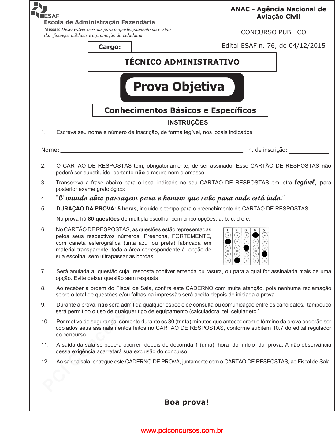 pcimarkpci MDAwMDowMDAwOjAwMDA6MDAwMDowMDAwOmZmZmY6MzZlOTpjMjU5:U2F0LCAxMSBTZXAgMjAyMSAwMDo1ODoyOSAtMDMwMA== INSTRUÇÕES 1. Escreva seu nome e número de inscrição, de forma legível, nos locais indicados. Nome: n. de inscrição: 2. O CARTÃO DE RESPOSTAS tem, obrigatoriamente, de ser assinado. Esse CARTÃO DE RESPOSTAS não poderá ser substituído, portanto não o rasure nem o amasse. 3. Transcreva a frase abaixo para o local indicado no seu CARTÃO DE RESPOSTAS em letra legível, para posterior exame grafológico: 4. “O mundo abre passagem para o homem que sabe para onde está indo.” 5. DURAÇÃO DA PROVA: 5 horas, incluído o tempo para o preenchimento do CARTÃO DE RESPOSTAS. Na prova há 80 questões de múltipla escolha, com cinco opções: a, b, c, d e e. 6. No CARTÃO DE RESPOSTAS, as questões estão representadas pelos seus respectivos números. Preencha, FORTEMENTE, com caneta esferográfica (tinta azul ou preta) fabricada em material transparente, toda a área correspondente à opção de sua escolha, sem ultrapassar as bordas. 7. Será anulada a questão cuja resposta contiver emenda ou rasura, ou para a qual for assinalada mais de uma opção. Evite deixar questão sem resposta. 8. Ao receber a ordem do Fiscal de Sala, confira este CADERNO com muita atenção, pois nenhuma reclamação sobre o total de questões e/ou falhas na impressão será aceita depois de iniciada a prova. 9. Durante a prova, não será admitida qualquer espécie de consulta ou comunicação entre os candidatos, tampouco será permitido o uso de qualquer tipo de equipamento (calculadora, tel. celular etc.). 10. Por motivo de segurança, somente durante os 30 (trinta) minutos que antecederem o término da prova poderão ser copiados seus assinalamentos feitos no CARTÃO DE RESPOSTAS, conforme subitem 10.7 do edital regulador do concurso. 11. A saída da sala só poderá ocorrer depois de decorrida 1 (uma) hora do início da prova. A não observância dessa exigência acarretará sua exclusão do concurso. 12. Ao sair da sala, entregue este CADERNO DE PROVA, juntamente com o CARTÃO DE RESPOSTAS, ao Fiscal de Sala. Escola de Administração Fazendária Boa prova! Prova Objetiva Missão: Desenvolver pessoas para o aperfeiçoamento da gestão das finanças públicas e a promoção da cidadania. ESAF Conhecimentos Básicos e Específicos TÉCNICO ADMINISTRATIVO Edital ESAF n. 76, de 04/12/2015 CONCURSO PÚBLICO ANAC - Agência Nacional de Aviação Civil Cargo: www.pciconcursos.com.br pcimarkpci MDAwMDowMDAwOjAwMDA6MDAwMDowMDAwOmZmZmY6MzZlOTpjMjU5:U2F0LCAxMSBTZXAgMjAyMSAwMDo1ODoyOSAtMDMwMA== Concurso Público: Agência Nacional de Aviação Civil - ANAC/2016 2 Técnico Administrativo - Prova Objetiva LÍNGUA PORTUGUESA Leia o texto a seguir para responder às questões 1 e 2. 5 10 15 20 A pequena cidade de Angicos, que tem um pouco mais de 10 mil habitantes e dista 170 quilômetros de Natal, no Rio Grande do Norte, passou por momentos de desespero durante a noite de ontem: os moradores confundiram um drone com um disco voador. Como a maioria dos leitores já sabe, um drone é um quadricóptero utilizado tanto para diversão como para filmagens ou fotografias panorâmicas. Muitos deles, como o citado no caso, possuem luzes coloridas nas extremidades — e isso pode acabar assustando pessoas que não estão acostumadas com esse tipo de tecnologia. Vários moradores compartilharam mensagens de áudio no WhatsApp para avisar amigos sobre o "OVNI": "Ninguém sai de casa não (...) Eu estou vendo um objeto no céu, bem grande, enorme, cheio de luz e se aproximando daqui. Eu acho que é um disco voador. Corre que ele está vindo aqui!" Após um tempo, a rádio local alertou que, na verdade, o objeto não identificado era um drone que estava capturando imagens da região. <http://www.tecmundo.com.br/polemica/88107-panico-cidade- brasil-confunde-drone-disco-voador.htm> Acesso em: 03/01/2016 (com adaptações). 1- Essa notícia, no plano mais profundo de compreensão, trata a) da demora na compreensão de novas tecnologias em certas comunidades. b) da atração que têm as pessoas em geral por discos voadores. c) do papel das redes sociais na comunicação imediata entre as pessoas. d) da função esclarecedora das rádios nas pequenas localidades. e) do malefício que podem causar os drones com luzes coloridas. 2- Assinale a opção que, ao substituir o trecho transcrito, altera seu sentido original. a) “A pequena cidade de Angicos, que tem um pouco mais de 10 mil habitantes” (l. 1/2) por A cidadezinha de Angicos, habitada por cerca de 10 mil pessoas b) “passou por momentos de desespero durante a noite de ontem” (l. 3/4) por teve, na noite de ontem, instantes de aflição c) “e isso pode acabar assustando pessoas que não estão acostumadas com esse tipo de tecnologia.” (l. 10/11) por o que pode vir a amedrontar quem desconhece artefatos tecnológicos desse tipo. d) “Vários moradores compartilharam mensagens de áudio no WhatsApp para avisar amigos sobre o "OVNI" (l. 13/14) por Muitas pessoas chamavam seus amigos para compartilhar imagens do “OVNI” no WhatsApp e) “Após um tempo, a rádio local alertou que, na verdade, o objeto não identificado era um drone” (l. 19/20) por Mais tarde, a rádio da cidade esclareceu ser o objeto não identificado, na verdade, um drone. 3- Os dois trechos que seguem foram extraídos de uma reportagem sobre drones, publicada em 2013. Leia-os e assinale a comparação correta. Texto 1 Um trabalho realizado por drones é o levantamento aéreo de terrenos, para cartografia, geografia e topografia, bem como serviços de filmagem para engenharia, mineração e indústria cinematográfica. Governos fazem uso da novidade principalmente na área de prevenção de desastres. Texto 2 Os Estados Unidos perceberam o potencial militar e passaram a usar drones para atacar alvos suspeitos de terrorismo no Afeganistão, Paquistão, Iêmen, Somália, além de monitorar o