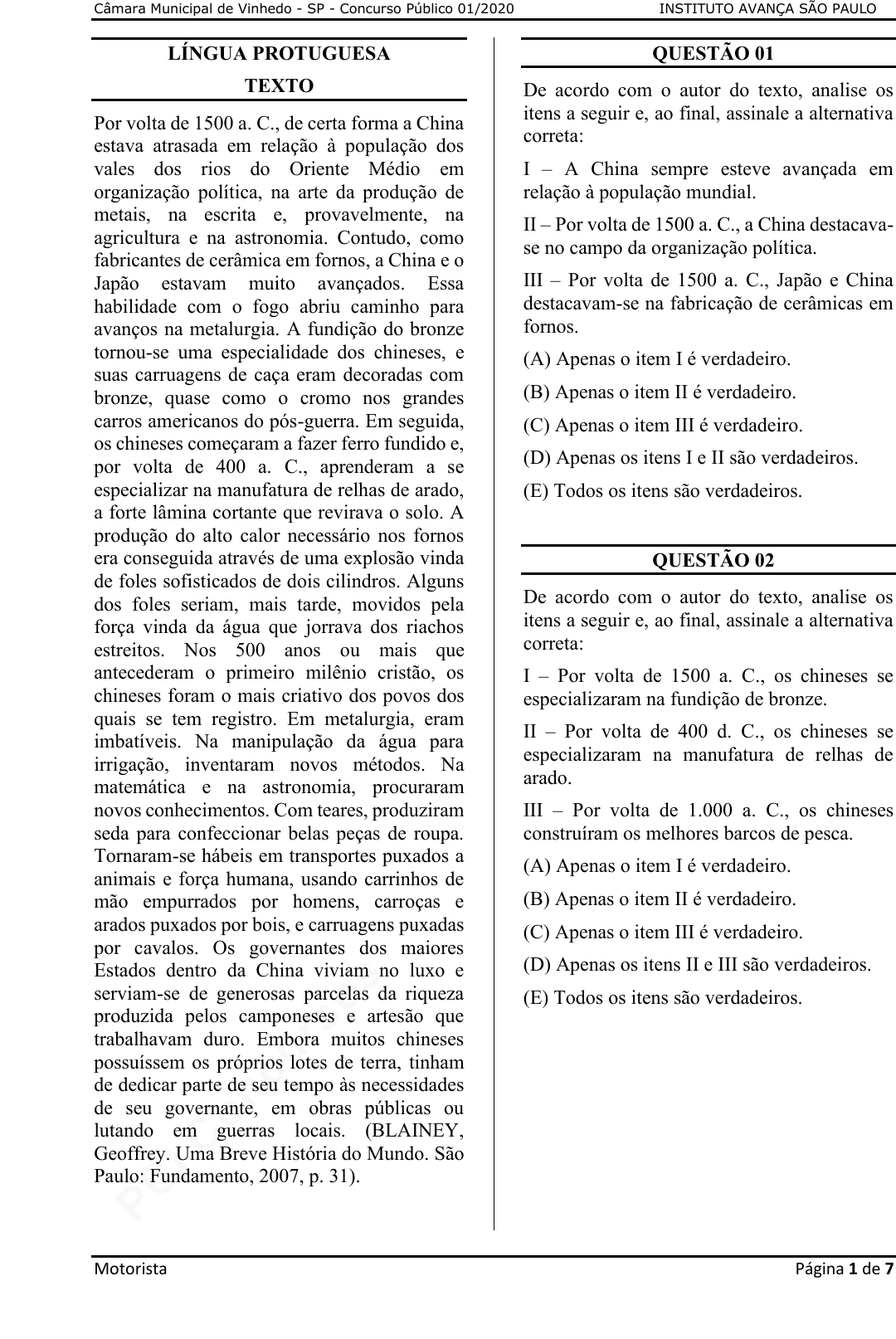 pcimarkpci MDAwMDowMDAwOjAwMDA6MDAwMDowMDAwOmZmZmY6MzZlOTpjMjU5:VHVlLCAxNCBTZXAgMjAyMSAyMjozNjowNiAtMDMwMA== Câmara Municipal de Vinhedo - SP - Concurso Público 01/2020 INSTITUTO AVANÇA SÃO PAULO Motorista Página 1 de 7 LÍNGUA PROTUGUESA TEXTO Por volta de 1500 a. C., de certa forma a China estava atrasada em relação à população dos vales dos rios do Oriente Médio em organização política, na arte da produção de metais, na escrita e, provavelmente, na agricultura e na astronomia. Contudo, como fabricantes de cerâmica em fornos, a China e o Japão estavam muito avançados. Essa habilidade com o fogo abriu caminho para avanços na metalurgia. A fundição do bronze tornou-se uma especialidade dos chineses, e suas carruagens de caça eram decoradas com bronze, quase como o cromo nos grandes carros americanos do pós-guerra. Em seguida, os chineses começaram a fazer ferro fundido e, por volta de 400 a. C., aprenderam a se especializar na manufatura de relhas de arado, a forte lâmina cortante que revirava o solo. A produção do alto calor necessário nos fornos era conseguida através de uma explosão vinda de foles sofisticados de dois cilindros. Alguns dos foles seriam, mais tarde, movidos pela força vinda da água que jorrava dos riachos estreitos. Nos 500 anos ou mais que antecederam o primeiro milênio cristão, os chineses foram o mais criativo dos povos dos quais se tem registro. Em metalurgia, eram imbatíveis. Na manipulação da água para irrigação, inventaram novos métodos. Na matemática e na astronomia, procuraram novos conhecimentos. Com teares, produziram seda para confeccionar belas peças de roupa. Tornaram-se hábeis em transportes puxados a animais e força humana, usando carrinhos de mão empurrados por homens, carroças e arados puxados por bois, e carruagens puxadas por cavalos. Os governantes dos maiores Estados dentro da China viviam no luxo e serviam-se de generosas parcelas da riqueza produzida pelos camponeses e artesão que trabalhavam duro. Embora muitos chineses possuíssem os próprios lotes de terra, tinham de dedicar parte de seu tempo às necessidades de seu governante, em obras públicas ou lutando em guerras locais. (BLAINEY, Geoffrey. Uma Breve História do Mundo. São Paulo: Fundamento, 2007, p. 31). QUESTÃO 01 De acordo com o autor do texto, analise os itens a seguir e, ao final, assinale a alternativa correta: I – A China sempre esteve avançada em relação à população mundial. II – Por volta de 1500 a. C., a China destacava- se no campo da organização política. III – Por volta de 1500 a. C., Japão e China destacavam-se na fabricação de cerâmicas em fornos. (A) Apenas o item I é verdadeiro. (B) Apenas o item II é verdadeiro. (C) Apenas o item III é verdadeiro. (D) Apenas os itens I e II são verdadeiros. (E) Todos os itens são verdadeiros. QUESTÃO 02 De acordo com o autor do texto, analise os itens a seguir e, ao final, assinale a alternativa correta: I – Por volta de 1500 a. C., os chineses se especializaram na fundição de bronze. II – Por volta de 400 d. C., os chineses se especializaram na manufatura de relhas de arado. III – Por volta de 1.000 a. C., os chineses construíram os melhores barcos de pesca. (A) Apenas o item I é verdadeiro. (B) Apenas o item II é verdadeiro. (C) Apenas o item III é verdadeiro. (D) Apenas os itens II e III são verdadeiros. (E) Todos os itens são verdadeiros. pcimarkpci MDAwMDowMDAwOjAwMDA6MDAwMDowMDAwOmZmZmY6MzZlOTpjMjU5:VHVlLCAxNCBTZXAgMjAyMSAyMjozNjowNiAtMDMwMA== Câmara Municipal de Vinhedo - SP - Concurso Público 01/2020 INSTITUTO AVANÇA SÃO PAULO Motorista Página 2 de 7 QUESTÃO 03 De acordo com o autor do texto, analise os itens a seguir e, ao final, assinale a alternativa correta: I – As primeiras roupas fabricadas pelos chineses foram mantos religiosos. II – Os chineses construíram as primeiras pontes de que se tem registro. III – O desenvolvimento da astronomia deveu- se ao intercâmbio realizado com os hispânicos. (A) Apenas o item I é verdadeiro. (B) Apenas o item II é verdadeiro. (C) Apenas o item III é verdadeiro. (D) Apenas os itens I e III são verdadeiros. (E) Nenhum dos itens é verdadeiro. QUESTÃO 04 De acordo com o autor do texto, analise os itens a seguir e, ao final, assinale a alternativa correta: I – A Revolução Cultural ocorreu por volta de 1500 a. C. II – Mao Tsé-Tung foi o grande responsável por implementar o estudo da astronomia na China. III – Nos cinco primeiros séculos da era cristã, os chineses se converteram massivamente ao Catolicismo. (A) Apenas o item I é verdadeiro. (B) Apenas o item II é verdadeiro. (C) Apenas o item III é verdadeiro. (D) Apenas os itens I e II são verdadeiros. (E) Nenhum dos itens é verdadeiro. QUESTÃO 05 No texto, o autor utiliza a palavra “contudo”. Assinale a alternativa que apresenta corretamente sua classificação gramatical: (A) substantivo. (B) verbo. (C) adjetivo. (D) conjunção. (E) numeral. QUESTÃO 06 Podem ser considerados sinônimos da palavra “avançados”, EXCETO: (A) vanguardistas. (B) renovadores. (C) progressistas. (D) revolucionários. (E) acomodados. QUESTÃO 07 Assinale a alternativa que apresenta um antônimo da palavra “habilidade”: (A) predisposição. (B) tendência. (C) inclinação. (D) imperícia. (E) vocação. QUESTÃO 08 No começo do texto, o autor emprega o verbo “estar” (a China estava...) Assinale a alternativa que indica o correto modo/tempo verbal apresentado no texto: (A) pretérito perfeito. (B) pretérito mais-que-perfeito. (C) pretérito imperfeito. (D) futuro do presente. (E) futuro do pretérito. pcimarkpci MDAwMDowMDAwOjAwMDA6MDAwMDowMDAwOmZmZmY6MzZlOTpjMjU5:VHVlLCAxNCBTZXAgMjAyMSAyMjozNjowNiAtMDMwMA== Câmara Municipal de Vinhedo - SP - Concurso Público 01/2020 INSTITUTO AVANÇA SÃO PAULO Motorista Página 3 de 7 QUESTÃO 09 No texto, o autor utiliza a palavra “provavelmente”. Assinale a alternativa que apr
