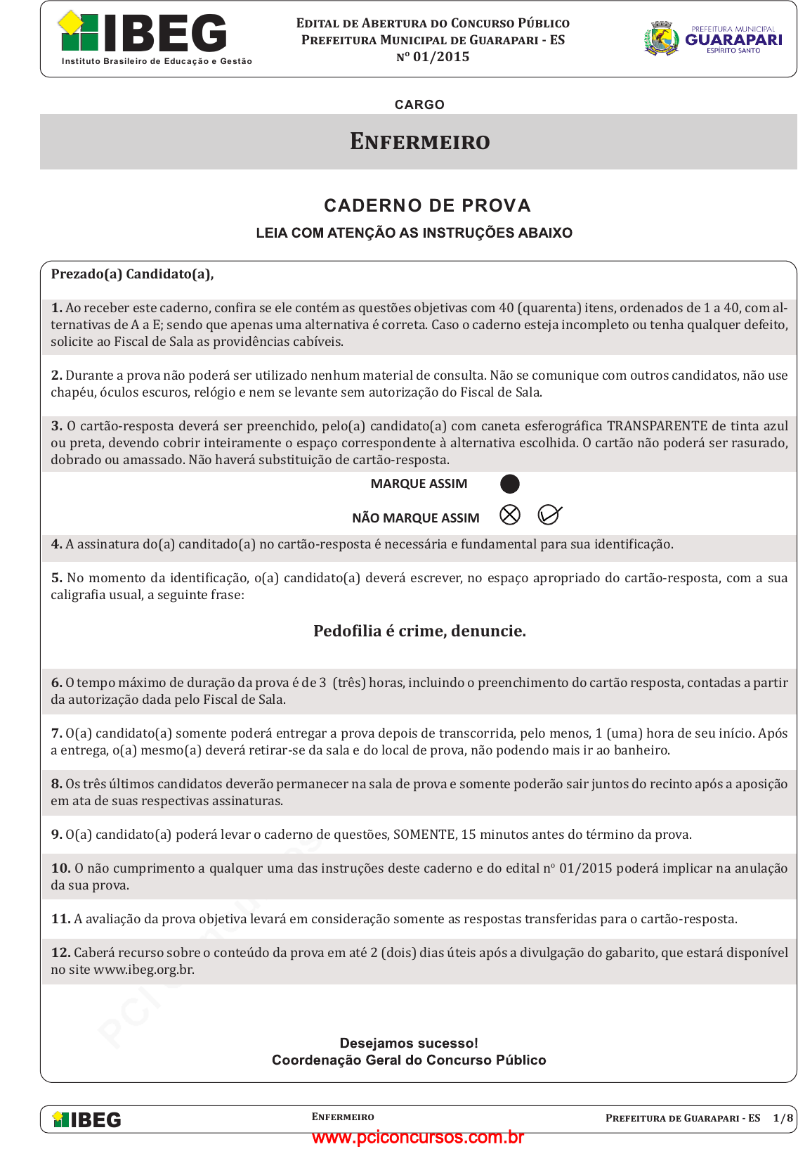 pcimarkpci MDAwMDowMDAwOjAwMDA6MDAwMDowMDAwOmZmZmY6MzZlOTpjMjU5:V2VkLCAxNSBTZXAgMjAyMSAxMToxMDo0NiAtMDMwMA== CARGO CADERNO DE PROVA MARQUE ASSIM NÃO MARQUE ASSIM IBEG Inst ituto Brasile iro de Educação e Gestão IBEG Edital de Abertura do Concurso Público Prefeitura Municipal de Guarapari - ES no 01/2015 Enfermeiro 1/8Enfermeiro Prefeitura de Guarapari - ES Prezado(a) Candidato(a), 1. Ao receber este caderno, confira se ele contém as questões objetivas com 40 (quarenta) itens, ordenados de 1 a 40, com al- ternativas de A a E; sendo que apenas uma alternativa é correta. Caso o caderno esteja incompleto ou tenha qualquer defeito, solicite ao Fiscal de Sala as providências cabíveis. 2. Durante a prova não poderá ser utilizado nenhum material de consulta. Não se comunique com outros candidatos, não use chapéu, óculos escuros, relógio e nem se levante sem autorização do Fiscal de Sala. 3. O cartão-resposta deverá ser preenchido, pelo(a) candidato(a) com caneta esferográfica TRANSPARENTE de tinta azul ou preta, devendo cobrir inteiramente o espaço correspondente à alternativa escolhida. O cartão não poderá ser rasurado, dobrado ou amassado. Não haverá substituição de cartão-resposta. 4. A assinatura do(a) canditado(a) no cartão-resposta é necessária e fundamental para sua identificação. 5. No momento da identificação, o(a) candidato(a) deverá escrever, no espaço apropriado do cartão-resposta, com a sua caligrafia usual, a seguinte frase: Pedofilia é crime, denuncie. 6. O tempo máximo de duração da prova é de 3 (três) horas, incluindo o preenchimento do cartão resposta, contadas a partir da autorização dada pelo Fiscal de Sala. 7. O(a) candidato(a) somente poderá entregar a prova depois de transcorrida, pelo menos, 1 (uma) hora de seu início. Após a entrega, o(a) mesmo(a) deverá retirar-se da sala e do local de prova, não podendo mais ir ao banheiro. 8. Os três últimos candidatos deverão permanecer na sala de prova e somente poderão sair juntos do recinto após a aposição em ata de suas respectivas assinaturas. 9. O(a) candidato(a) poderá levar o caderno de questões, SOMENTE, 15 minutos antes do término da prova. 10. O não cumprimento a qualquer uma das instruções deste caderno e do edital no 01/2015 poderá implicar na anulação da sua prova. 11. A avaliação da prova objetiva levará em consideração somente as respostas transferidas para o cartão-resposta. 12. Caberá recurso sobre o conteúdo da prova em até 2 (dois) dias úteis após a divulgação do gabarito, que estará disponível no site www.ibeg.org.br. www.pciconcursos.com.br pcimarkpci MDAwMDowMDAwOjAwMDA6MDAwMDowMDAwOmZmZmY6MzZlOTpjMjU5:V2VkLCAxNSBTZXAgMjAyMSAxMToxMDo0NiAtMDMwMA== IBEG 2/8Enfermeiro Prefeitura de Guarapari - ES QUESTÃO 03 De acordo com as regras de concordância prescritas pela norma padrão e as questões gramaticais presentes no texto, assinale a alternativa correta. (a) Caso o autor desejasse substituir o termo destacado na oração “O prin- cipal balneário do Espírito Santo, Guarapari, está longe da lama [de rejeitos oriunda da barragem de minério em Mariana, Minas Gerais], mas já sente os efeitos.” pela expressão Grande parte dos hotéis do principal balneário do Espírito Santo, os verbos “está” e “sente” deveriam obrigatoriamente per- manecer na 3ª pessoa do singular. (b) O vocábulo destacado na oração “Os casos de cancelamentos de diárias são isolados”, também poderia ser empregado no feminino para concordar com o termo “diárias”. (c) A oração “Os hóspedes estão ligando e pedindo informações.” poderia ser substituída pela redação Um grupo de hóspedes está ligando e pedindo bastantes informações. (d) Outra redação possível para a oração “relatou a proprietária da Pousada Praia do Morro, em Guarapari, Fátima Fonseca.” seria relatou a proprietária da Pousada Praia do Morro, o qual fica em Guarapari, Fátima Fonseca. (e) O autor, caso julgasse necessário, poderia substituir o trecho “A situa- ção não é muito diferente na pousada de Fernando Otávio Campos da Silva” pela redação A situação é meia diferente na pousada de Fernando Otávio Campos da Silva. QUESTÃO 04 Considerando as regras de acentuação gráfica e de ortografia vigentes, assi- nale a alternativa correta. (a) Os vocábulos “está” e “já” são acentuados pela mesma regra. (b) Caso o autor resolvesse acrescentar o prefixo super aos vocábulos “quantidade” e “efeitos”, deveria grafar superquantidade e super-efeitos. (c) É opcional a acentuação da forma verbal destacada na oração “eles têm ligado e perguntado se a lama chegou em Guarapari”. (d) No lugar do verbo destacado na oração “relatou a proprietária da Pou- sada Praia do Morro, em Guarapari, Fátima Fonseca.”, o autor poderia em- pregar discorreu ou expos. (e) Se julgasse necessário, o autor poderia substituir o período “Estamos gastando tempo para dizer que a lama não chegou aqui” pela redação Esta- mos gastando mal o tempo para dizer que aqui ainda não virou um lamaçal. Leia o texto abaixo para responder as questões de 05 a 09. Texto 2 Disponível em:< http://www.guarapari.es.gov.br/portal/index.php/semsa/item/561-secretaria-de-saude- promove-varias-acoes-do-outubro-rosa>. Acesso em: 16 jan. 2016. QUESTÃO 05 Com base na leitura compreensiva do texto, pode-se dizer que LÍNGUA PORTUGUESA Leia o texto abaixo para responder as questões de 01 a 04. Texto 1 Guarapari, os turistas e a lama O principal balneário do Espírito Santo, Guarapari, está longe da lama [de rejeitos oriunda da barragem de minério em Mariana, Minas Gerais], mas já sente os efeitos. Os casos de cancelamentos de diárias são isolados, mas a quantidade de telefonemas de turistas com pedidos de in- formação é incontável desde a chegada da lama ao mar, no último fim de semana. “Já percebi e muito os efeitos da lama. Os h