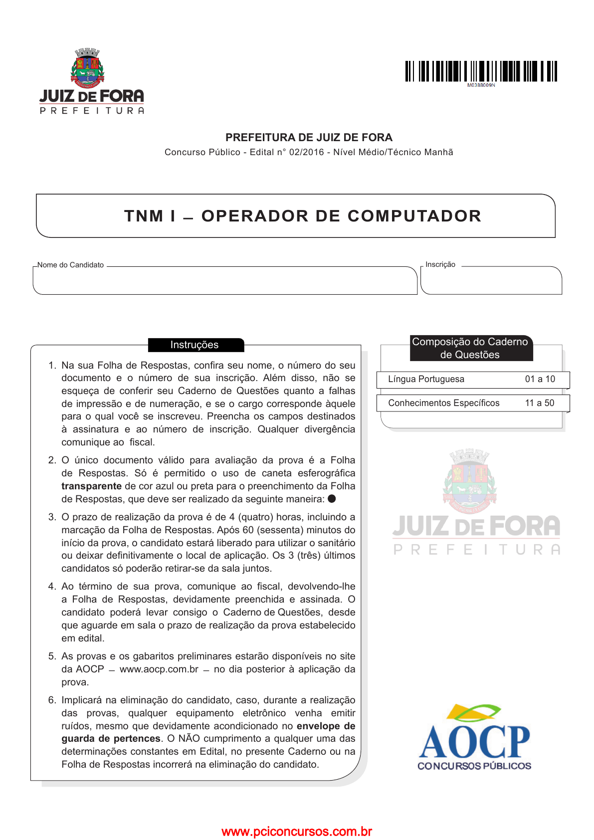 pcimarkpci MDAwMDowMDAwOjAwMDA6MDAwMDowMDAwOmZmZmY6MzZlOTpjMjU5:U2F0LCAxMSBTZXAgMjAyMSAwNTozMTowMyAtMDMwMA== Nome do Candidato Inscrição PREFEITURA DE JUIZ DE FORA Concurso Público - Edital n° 02/2016 - Nível Médio/Técnico Manhã TNM I ̶ OPERADOR DE COMPUTADOR Língua Portuguesa 01 a 10 Conhecimentos Específicos 11 a 50 Composição do Caderno de Questões 1. Na sua Folha de Respostas, confira seu nome, o número do seu documento e o número de sua inscrição. Além disso, não se esqueça de conferir seu Caderno de Questões quanto a falhas de impressão e de numeração, e se o cargo corresponde àquele para o qual você se inscreveu. Preencha os campos destinados à assinatura e ao número de inscrição. Qualquer divergência comunique ao fiscal. 2. O único documento válido para avaliação da prova é a Folha de Respostas. Só é permitido o uso de caneta esferográfica transparente de cor azul ou preta para o preenchimento da Folha de Respostas, que deve ser realizado da seguinte maneira: 3. O prazo de realização da prova é de 4 (quatro) horas, incluindo a marcação da Folha de Respostas. Após 60 (sessenta) minutos do início da prova, o candidato estará liberado para utilizar o sanitário ou deixar definitivamente o local de aplicação. Os 3 (três) últimos candidatos só poderão retirar-se da sala juntos. 4. Ao término de sua prova, comunique ao fiscal, devolvendo-lhe a Folha de Respostas, devidamente preenchida e assinada. O candidato poderá levar consigo o Caderno de Questões, desde que aguarde em sala o prazo de realização da prova estabelecido em edital. 5. As provas e os gabaritos preliminares estarão disponíveis no site da AOCP ̶ www.aocp.com.br ̶ no dia posterior à aplicação da prova. 6. Implicará na eliminação do candidato, caso, durante a realização das provas, qualquer equipamento eletrônico venha emitir ruídos, mesmo que devidamente acondicionado no envelope de guarda de pertences. O NÃO cumprimento a qualquer uma das determinações constantes em Edital, no presente Caderno ou na Folha de Respostas incorrerá na eliminação do candidato. Instruções www.pciconcursos.com.br pcimarkpci MDAwMDowMDAwOjAwMDA6MDAwMDowMDAwOmZmZmY6MzZlOTpjMjU5:U2F0LCAxMSBTZXAgMjAyMSAwNTozMTowMyAtMDMwMA== www.aocp.com.br Prefeitura de Juiz de Fora --------------------------------------------------------------------------------(destaque aqui)----------------------------------------------------------------------------- Gabarito Rascunho Questão Resp. 01 02 03 04 05 06 07 08 09 10 11 12 13 14 15 16 17 18 19 20 21 22 23 24 25 Questão Resp. 26 27 28 29 30 31 32 33 34 35 36 37 38 39 40 41 42 43 44 45 46 47 48 49 50 www.pciconcursos.com.br pcimarkpci MDAwMDowMDAwOjAwMDA6MDAwMDowMDAwOmZmZmY6MzZlOTpjMjU5:U2F0LCAxMSBTZXAgMjAyMSAwNTozMTowMyAtMDMwMA== 3TNM I - Operador de Computador L Í N G U A P O R T U G U E S A Considerações sobre a loucura Ferreira Gullar Ouço frequentemente pessoas opinarem sobre tratamento psiquiátrico sem na verdade conhecerem o problema. É bacana ser contra internação. Por isso mesmo traçam um retrato equivocado de como os pacientes eram tratados no passado em manicômios infernais por médicos que só pensavam em torturá-los com choques elétricos, camisas de força e metê-los em solitárias. Por isso mesmo exaltam o movimento antimanicomial, que se opõe à internação dos doentes mentais. Segundo eles, os pacientes são metidos em hospitais psiquiátricos porque a família quer se ver livre deles. Só pode fazer tal afirmação quem nunca teve que conviver com um doente mental e, por isso, ignora o tormento que tal situação pode implicar. Nada mais doloroso para uma mãe ou um pai do que ter de admitir que seu filho é esquizofrênico e ser, por isso, obrigado a interná-lo. Há certamente pais que se negam a fazê-lo, mas ao custo de ser por ele agredido ou vê-lo por fim à própria vida, jogando-se da janela do apartamento. Como aquelas pessoas não enfrentam tais situações, inventam que os hospitais psiquiátricos, ainda hoje, são locais de tortura. Ignoram que as clínicas atuais, em sua maioria, graças aos remédios neuroléticos, nada têm dos manicômios do passado. Recentemente, num desses programas de televisão, ouvi pessoas afirmarem que o verdadeiro tratamento psiquiátrico foi inventado pela médica Nise da Silveira, que curava os doentes com atividades artísticas. Trata-se de um equívoco. A terapia ocupacional, artística ou não, jamais curou algum doente. Trata-se, graças a Nise, de uma ocupação que lhe dá prazer e, por mantê-lo ocupado, alivia-lhe as tensões psíquicas. Quando o doente é, apesar de louco, um artista talentoso, como Emygdio de Barros ou Arthur Bispo do Rosário, realiza-se artisticamente e encontra assim um modo de ser feliz. Graças à atividade dos internados no Centro Psiquiátrico Nacional, do Engenho de Dentro, no Estado do Rio, criou-se o Museu de Imagens do Inconsciente, que muito contribuiu para o reconhecimento do valor estético dos artistas doentes mentais. Mas é bom entender que não é a loucura que torna alguém artista; de fato, ele é artístico apesar de louco. Tanto isso é verdade que, das dezenas de pacientes que trabalharam no ateliê do Centro Psiquiátrico, apenas quatro ou cinco criaram obras de arte. Deve-se reconhecer, também, que conforme a personalidade de cada um seu estado mental compõe a expressão estética que produz. No tal programa de TV, alguém afirmou que, graças a Nise da Silveira, o tratamento psiquiátrico tornou-se o que é hoje. Não é verdade, isso se deve à invenção dos remédios neurolépticos que possibilitam o controle do surto psíquico. É também graças a essa medicação que as internações se tornaram menos frequentes e, quando necessárias, duram pouco tempo – o tempo necessário ao controle do surto por medicação mais forte. Superada a crise, o paciente volta para casa e continua tomando as doses necessár