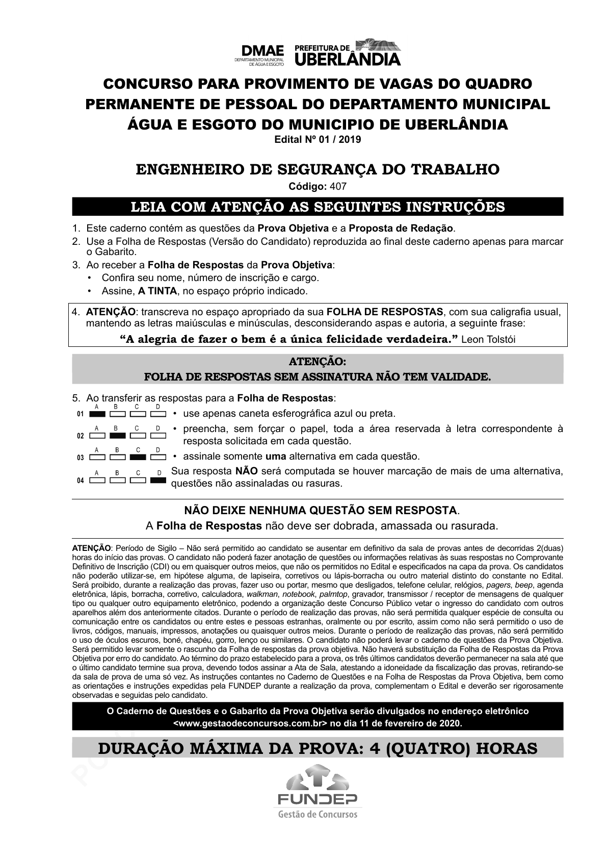 pcimarkpci MDAwMDowMDAwOjAwMDA6MDAwMDowMDAwOmZmZmY6MzZlOTpjMjU5:V2VkLCAxNSBTZXAgMjAyMSAxODo0NDo1MSAtMDMwMA== CONCURSO PARA PROVIMENTO DE VAGAS DO QUADRO PERMANENTE DE PESSOAL DO DEPARTAMENTO MUNICIPAL ÁGUA E ESGOTO DO MUNICIPIO DE UBERLÂNDIA Edital Nº 01 / 2019 ENGENHEIRO DE SEGURANÇA DO TRABALHO Código: 407 LEIA COM ATENÇÃO AS SEGUINTES INSTRUÇÕES 1. Este caderno contém as questões da Prova Objetiva e a Proposta de Redação. 2. Use a Folha de Respostas (Versão do Candidato) reproduzida ao final deste caderno apenas para marcar o Gabarito. 3. Ao receber a Folha de Respostas da Prova Objetiva: • Confira seu nome, número de inscrição e cargo. • Assine, A TINTA, no espaço próprio indicado. 4. ATENÇÃO: transcreva no espaço apropriado da sua FOLHA DE RESPOSTAS, com sua caligrafia usual, mantendo as letras maiúsculas e minúsculas, desconsiderando aspas e autoria, a seguinte frase: “A alegria de fazer o bem é a única felicidade verdadeira.” Leon Tolstói ATENÇÃO: FOLHA DE RESPOSTAS SEM ASSINATURA NÃO TEM VALIDADE. 5. Ao transferir as respostas para a Folha de Respostas: • use apenas caneta esferográfica azul ou preta. • preencha, sem forçar o papel, toda a área reservada à letra correspondente à resposta solicitada em cada questão. • assinale somente uma alternativa em cada questão. Sua resposta NÃO será computada se houver marcação de mais de uma alternativa, questões não assinaladas ou rasuras. NÃO DEIXE NENHUMA QUESTÃO SEM RESPOSTA. A Folha de Respostas não deve ser dobrada, amassada ou rasurada. ATENÇÃO: Período de Sigilo – Não será permitido ao candidato se ausentar em definitivo da sala de provas antes de decorridas 2(duas) horas do início das provas. O candidato não poderá fazer anotação de questões ou informações relativas às suas respostas no Comprovante Definitivo de Inscrição (CDI) ou em quaisquer outros meios, que não os permitidos no Edital e especificados na capa da prova. Os candidatos não poderão utilizar-se, em hipótese alguma, de lapiseira, corretivos ou lápis-borracha ou outro material distinto do constante no Edital. Será proibido, durante a realização das provas, fazer uso ou portar, mesmo que desligados, telefone celular, relógios, pagers, beep, agenda eletrônica, lápis, borracha, corretivo, calculadora, walkman, notebook, palmtop, gravador, transmissor / receptor de mensagens de qualquer tipo ou qualquer outro equipamento eletrônico, podendo a organização deste Concurso Público vetar o ingresso do candidato com outros aparelhos além dos anteriormente citados. Durante o período de realização das provas, não será permitida qualquer espécie de consulta ou comunicação entre os candidatos ou entre estes e pessoas estranhas, oralmente ou por escrito, assim como não será permitido o uso de livros, códigos, manuais, impressos, anotações ou quaisquer outros meios. Durante o período de realização das provas, não será permitido o uso de óculos escuros, boné, chapéu, gorro, lenço ou similares. O candidato não poderá levar o caderno de questões da Prova Objetiva. Será permitido levar somente o rascunho da Folha de respostas da prova objetiva. Não haverá substituição da Folha de Respostas da Prova Objetiva por erro do candidato. Ao término do prazo estabelecido para a prova, os três últimos candidatos deverão permanecer na sala até que o último candidato termine sua prova, devendo todos assinar a Ata de Sala, atestando a idoneidade da fiscalização das provas, retirando-se da sala de prova de uma só vez. As instruções contantes no Caderno de Questões e na Folha de Respostas da Prova Objetiva, bem como as orientações e instruções expedidas pela FUNDEP durante a realização da prova, complementam o Edital e deverão ser rigorosamente observadas e seguidas pelo candidato. O Caderno de Questões e o Gabarito da Prova Objetiva serão divulgados no endereço eletrônico <www.gestaodeconcursos.com.br> no dia 11 de fevereiro de 2020. DURAÇÃO MÁXIMA DA PROVA: 4 (QUATRO) HORAS pcimarkpci MDAwMDowMDAwOjAwMDA6MDAwMDowMDAwOmZmZmY6MzZlOTpjMjU5:V2VkLCAxNSBTZXAgMjAyMSAxODo0NDo1MSAtMDMwMA== ATENÇÃO Sr.(a) Candidato(a), Antes de começar a fazer a prova, confira se este caderno contém, ao todo, 45 (quarenta e cinco) questões de múltipla escolha, cada uma constituída de 4 (quatro) alternativas de respostas, assim distribuídas: 10 (dez) questões de Português, 10 (dez) questões de Raciocínio Lógico, 5 (cinco) questões de Atualidades, 5 (cinco) questões de Legislação, 15 (quinze) questões de Conhecimentos Específicos e Proposta de Redação, todas perfeitamente legíveis. Havendo algum problema, informe imediatamente ao aplicador de provas para que ele tome as providências necessárias. Caso não observe essa recomendação, não lhe caberá qualquer reclamação ou recursos posteriores. pcimarkpci MDAwMDowMDAwOjAwMDA6MDAwMDowMDAwOmZmZmY6MzZlOTpjMjU5:V2VkLCAxNSBTZXAgMjAyMSAxODo0NDo1MSAtMDMwMA== 3 PORTUGUêS INSTRUÇÃO: Leia o texto I a seguir para responder às questões de 1 a 3. TEXTO I “Só Gabriela parecia não sentir a caminhada, seus pés como que deslizando pela picada muitas vezes aberta na hora a golpes de facão, na mata virgem. Como se não existissem as pedras, os tocos, os cipós emaranhados. A poeira dos caminhos da caatinga a cobrira tão por completo que era impossível distinguir seus traços. Nos cabelos já não penetrava o pedaço de pente, tanto pó se acumulara. Parecia uma demente perdida nos caminhos. Mas Clemente sabia como ela era deveras e o sabia em cada partícula de seu ser, na ponta dos dedos e na pele do peito. Quando os dois grupos se encontraram, no começo da viagem, a cor do rosto de Gabriela e de suas pernas era ainda visível e os cabelos rolavam sobre o cangote, espalhando perfume. Ainda agora, através da sujeira a envolvê-la, ele a enxergava como a vira no primeiro dia, encostada numa árvore, o corpo esgu
