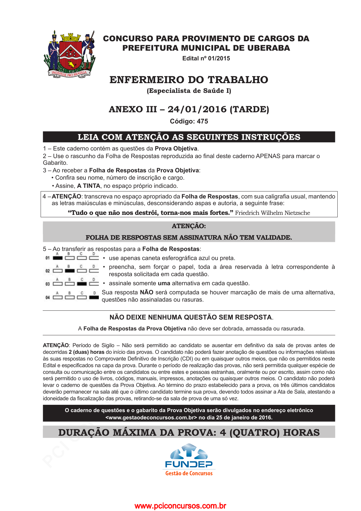 pcimarkpci MDAwMDowMDAwOjAwMDA6MDAwMDowMDAwOmZmZmY6MzZlOTpjMjU5:V2VkLCAxNSBTZXAgMjAyMSAyMTozNDo1NiAtMDMwMA== CONCURSO PARA PROVIMENTO DE CARGOS DA PREFEITURA MUNICIPAL DE UBERABA Edital nº 01/2015 ENFERMEIRO DO TRABALHO (Especialista de Saúde I) ANEXO III – 24/01/2016 (TARDE) Código: 475 LEIA COM ATENÇÃO AS SEGUINTES INSTRUÇÕES 1 – Este caderno contém as questões da Prova Objetiva. 2 – Use o rascunho da Folha de Respostas reproduzida ao final deste caderno APENAS para marcar o Gabarito. 3 – Ao receber a Folha de Respostas da Prova Objetiva: • Confira seu nome, número de inscrição e cargo. • Assine, A TINTA, no espaço próprio indicado. 4 – ATENÇÃO: transcreva no espaço apropriado da Folha de Respostas, com sua caligrafia usual, mantendo as letras maiúsculas e minúsculas, desconsiderando aspas e autoria, a seguinte frase: “Tudo o que não nos destrói, torna-nos mais fortes.” Friedrich Wilhelm Nietzsche ATENÇÃO: FOLHA DE RESPOSTAS SEM ASSINATURA NÃO TEM VALIDADE. 5 – Ao transferir as respostas para a Folha de Respostas: • use apenas caneta esferográfica azul ou preta. • preencha, sem forçar o papel, toda a área reservada à letra correspondente à resposta solicitada em cada questão. • assinale somente uma alternativa em cada questão. Sua resposta NÃO será computada se houver marcação de mais de uma alternativa, questões não assinaladas ou rasuras. NÃO DEIXE NENHUMA QUESTÃO SEM RESPOSTA. A Folha de Respostas da Prova Objetiva não deve ser dobrada, amassada ou rasurada. ATENÇÃO: Período de Sigilo – Não será permitido ao candidato se ausentar em definitivo da sala de provas antes de decorridas 2 (duas) horas do início das provas. O candidato não poderá fazer anotação de questões ou informações relativas às suas respostas no Comprovante Definitivo de Inscrição (CDI) ou em quaisquer outros meios, que não os permitidos neste Edital e especificados na capa da prova. Durante o período de realização das provas, não será permitida qualquer espécie de consulta ou comunicação entre os candidatos ou entre estes e pessoas estranhas, oralmente ou por escrito, assim como não será permitido o uso de livros, códigos, manuais, impressos, anotações ou quaisquer outros meios. O candidato não poderá levar o caderno de questões da Prova Objetiva. Ao término do prazo estabelecido para a prova, os três últimos candidatos deverão permanecer na sala até que o último candidato termine sua prova, devendo todos assinar a Ata de Sala, atestando a idoneidade da fiscalização das provas, retirando-se da sala de prova de uma só vez. O caderno de questões e o gabarito da Prova Objetiva serão divulgados no endereço eletrônico <www.gestaodeconcursos.com.br> no dia 25 de janeiro de 2016. DURAÇÃO MÁXIMA DA PROVA: 4 (QUATRO) HORAS www.pciconcursos.com.brwww.pciconcursos.com.br pcimarkpci MDAwMDowMDAwOjAwMDA6MDAwMDowMDAwOmZmZmY6MzZlOTpjMjU5:V2VkLCAxNSBTZXAgMjAyMSAyMTozNDo1NiAtMDMwMA== ATENÇÃO Sr.(a) Candidato(a), Antes de começar a fazer a prova, confira se este caderno contém, ao todo, 40 (quarenta) questões de múltipla escolha, cada uma constituída de 4 (quatro) alternativas de respostas, assim distribuídas: 10 (dez) questões de Português, 5 (cinco) questões de Atualidades, 5 (cinco) questões de Legislação e 20 (vinte) questões de Conhecimentos Específicos, todas perfeitamente legíveis. Havendo algum problema, informe imediatamente ao aplicador de provas para que ele tome as providências necessárias. Caso não observe essa recomendação, não lhe caberá qualquer reclamação ou recursos posteriores. www.pciconcursos.com.brwww.pciconcursos.com.br pcimarkpci MDAwMDowMDAwOjAwMDA6MDAwMDowMDAwOmZmZmY6MzZlOTpjMjU5:V2VkLCAxNSBTZXAgMjAyMSAyMTozNDo1NiAtMDMwMA== 3 PORTUGUÊS INSTRUÇÃO: Leia o texto a seguir e responda às questões de 1 a 8. O monge budista que ficou bilionário esnobando os investidores Se esse bilionário de 83 anos estiver certo, uma das principais lições ensinadas nas faculdades de Administração está errada. Sabe toda aquela insistência em se concentrar nos acionistas? Esqueça, diz Kazuo Inamori, empreendedor, guru de gestão e monge budista. Em vez disso, invista seu tempo na alegria dos funcionários. Ele utilizou essa filosofia para estabelecer a gigante dos eletrônicos Kyocera Corp. há mais de cinco décadas, criar a operadora de telefonia que agora é conhecida como KDDI Corp., avaliada em US$ 64 bilhões, e resgatar a Japan Airlines Co. de seu pedido de falência. Na sede da Kyocera, com vista para as colinas e os templos da antiga capital Kyoto, Inamori manifesta dúvidas sobre os modos capitalistas ocidentais. Sua perspectiva é um lembrete de que muitos setores fortes da indústria japonesa não acreditam nos planos propostos pelo primeiro-ministro Shinzo Abe para que as empresas se dediquem mais aos acionistas. “Se você quer os ovos, cuide bem das galinhas”, disse Inamori em uma entrevista no dia 23 de outubro. “Se você maltratar ou matar as galinhas, não vai dar certo”. Essa perspectiva tem seu peso devido ao sucesso de Inamori. A KDDI e a Kyocera têm juntas um valor de mercado de aproximadamente US$ 82 bilhões. Quando Inamori foi nomeado CEO da Japan Airlines em 2010, ele estava com 77 anos e não tinha nenhuma experiência no setor. No ano seguinte, ele conseguiu que a empresa aérea voltasse a lucrar e tirou-a da falência. Em 2012, ele a listou novamente na bolsa de Tóquio. Mudança de mentalidade O segredo, segundo Inamori, foi modificar a mentalidade dos funcionários. Após assumir o cargo de CEO sem remuneração, ele imprimiu para cada funcionário um pequeno livro sobre suas filosofias, onde afirmava que a empresa se dedicava ao crescimento deles. Ele também explicava o significado social do trabalho que eles realizavam e delineava princípios inspirados no budismo, que os funcionários deveriam adotar em suas vidas, como ser humilde e faz