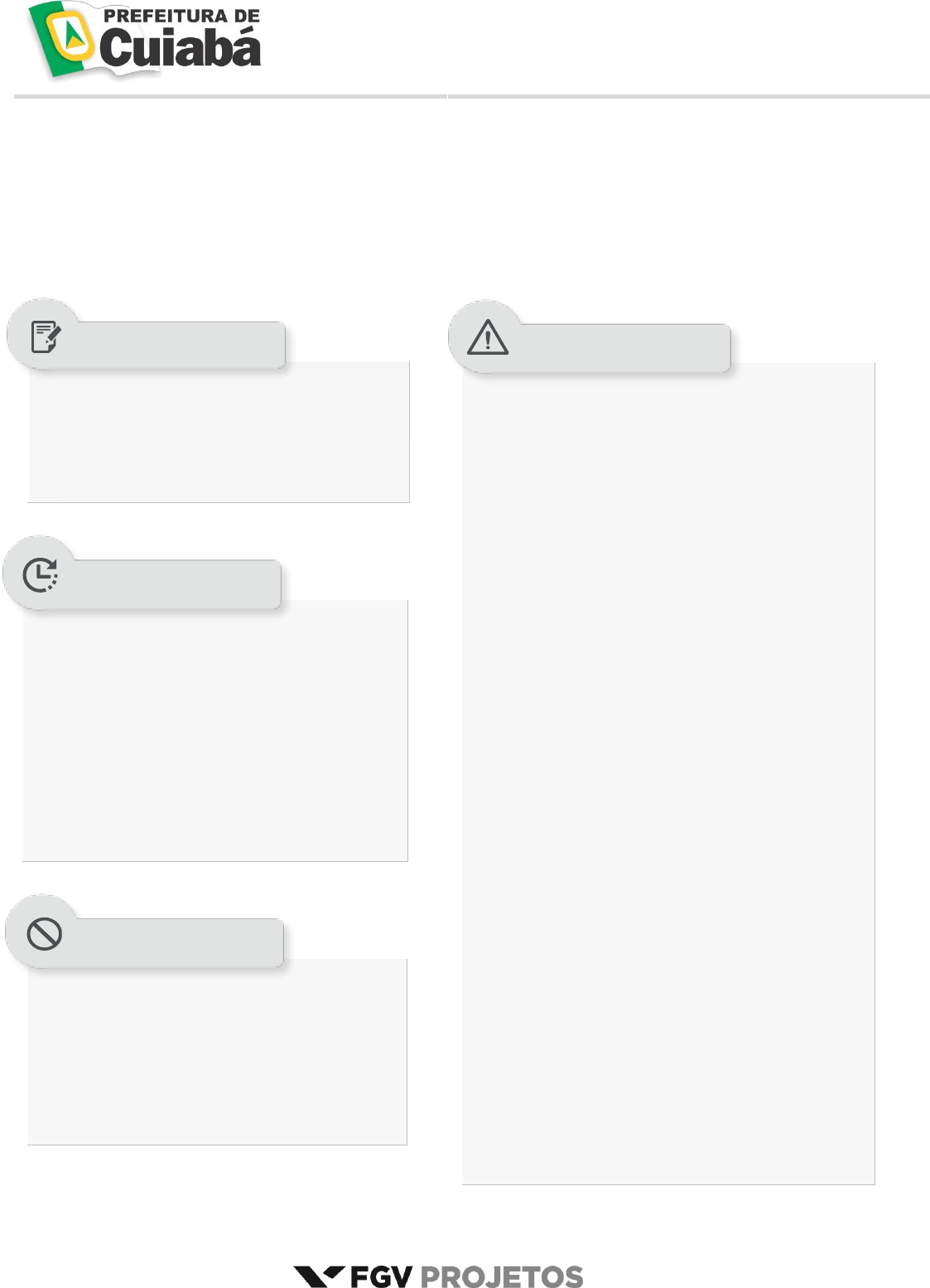 www.pciconcursos.com.br Secretaria Municipal de Educação Concurso Público 2015 MANHÃ Médio completo Técnico em Manutenção e Infraestrutura Auxiliar de Serviços Gerais Tipo 1 – BRANCA Além deste caderno de prova, contendo sessenta questões objetivas, você receberá do fiscal de sala: uma folha destinada às respostas das questões objetivas; As questões objetivas têm cinco alternativas de resposta (A, B, C, D, E) e somente uma delas está correta; Verifique se seu caderno está completo, sem repetição de questões ou falhas. Caso contrário, notifique imediatamente o fiscal da sala, para que sejam tomadas as devidas providências; Confira seus dados pessoais, especialmente nome, número de inscrição e documento de identidade e leia atentamente as instruções para preencher a folha de respostas; Use somente caneta esferográfica, em material transparente, com tinta preta ou azul; Assine seu nome apenas nos espaços reservados; Marque na folha de respostas o campo relativo à confirmação do tipo/cor de prova, conforme o caderno recebido; O preenchimento das respostas da prova objetiva é de sua responsabilidade e não será permitida a troca de folha de respostas em caso de erro; Reserve tempo suficiente para o preenchimento de suas respostas. Para fins de avaliação, serão levadas em consideração apenas as marcações realizadas na folha de respostas da prova objetiva, não sendo permitido anotar informações relativas às respostas em qualquer outro meio que não seja o caderno de provas; A FGV coletará as impressões digitais dos candidatos na folha de respostas; Os candidatos serão submetidos ao sistema de detecção de metais quando do ingresso e da saída de sanitários durante a realização das provas. Quatro horas é o tempo disponível para a realização da prova, já incluído o tempo para a marcação da folha de respostas da prova objetiva; ; Duas horas após o início da prova é possível retirar-se da sala, sem levar o caderno de provas; Sessenta minutos antes do término do período de prova é possível retirar-se da sala levando o caderno de provas. Qualquer tipo de comunicação entre os candidatos durante a aplicação da prova; Levantar da cadeira sem autorização do fiscal de sala; Usar o sanitário ao término da prova, após deixar a sala. SUA PROVA TEMPO NÃO SERÁ PERMITIDO INFORMAÇÕES GERAIS www.pciconcursos.com.br www.pciconcursos.com.br Secretaria Municipal de Educação de Cuiabá - Nível Médio FGV – Projetos Técnico em Manutenção e Infraestrutura - Auxiliar de Serviços Gerais Tipo 1 – Cor BRANCA – Página 3 Língua Portuguesa Texto 1 Novelas Não vejo novelas. A última que me prendeu no sofá foi escrita pelo Dias Gomes, que era um craque. Hoje, 15 segundos de novela bastam para me matar de tédio. Os mesmos personagens, o mesmo enredo, as mesmas caretas, as mesmas frases idiotas, as mesmas cenas toscas, a mesma história chata. (Roberto Gomes, Gazeta do Povo, 2009) 1 A afirmação inicial do texto é “Não vejo novelas”. Essa afirmação (A) é desmentida pelo restante do texto. (B) é justificada na continuidade do texto. (C) é retificada na progressão textual. (D) é confrontada pelo texto a seguir. (E) é retomada pelo que segue. 2 A nova forma da frase inicial “Não vejo novelas”, se colocada em discurso indireto, iniciando-se a nova frase por “O autor do texto declara que...”, seria (A) não via novelas. (B) não vê novelas. (C) não viu novelas. (D) não verá novelas. (E) não veria novelas. 3 Segundo o autor do texto, ele deixou de ver novelas porque (A) não tem mais tempo para acompanhá-las. (B) a televisão passou a apresentá-las com maior frequência. (C) elas perderam qualidade e originalidade. (D) os atores deixaram de ser profissionais de qualidade. (E) os autores de novelas passaram a explorar o cotidiano. 4 O autor do texto fala do tédio que sente ao ver as novelas atuais. O tédio é construído no texto por meio de um recurso de linguagem, que é (A) o emprego de palavras negativas. (B) o uso de gírias e expressões populares. (C) a utilização de estrangeirismos. (D) a repetição da palavra “mesmo”. (E) a utilização de muitas vírgulas. 5 “15 segundos de novela bastam para me matar de tédio.” A expressão “me matar de tédio” expressa (A) uma comparação. (B) uma ironia. (C) um exagero. (D) uma brincadeira. (E) uma ameaça. 6 Ao escrever que a novela de Dias Gomes o “prendeu ao sofá”, o autor do texto quer dizer que (A) ele possuía o vício de ver novelas. (B) nada tinha a fazer à noite, exceto ver televisão. (C) não era casado e se sentia sozinho. (D) preferia novela a cinema ou a teatro. (E) a novela despertava interesse. 7 Segundo o autor do texto, as novelas atuais apresentam alguns defeitos. Assinale a opção que indica o defeito que não é produzido pelo autor da novela. (A) Os mesmos personagens. (B) O mesmo enredo. (C) As mesmas caretas. (D) As mesmas frases idiotas. (E) A mesma história chata. 8 Ao afirmar que Dias Gomes “era um craque”, o autor do texto quer dizer que ele (A) jogava bem futebol além de ser autor de novelas. (B) trabalhava muito bem nas novelas como ator. (C) fazia muitas novelas ao mesmo tempo. (D) era um autor de novelas muito boas. (E) escrevia poucas novelas de sucesso. Texto 2 A novela Considerar a telenovela um produto cultural alienante é um tremendo preconceito da universidade. Quem acha que novela aliena está na verdade chamando o povo de débil mental. Bobagem imaginar que alguém é induzido a pensar que a vida é um mar de rosas só por causa de um enredo açucarado. A telenovela brasileira é um produto cultural de alta qualidade técnica, e algumas delas são verdadeiras obras de arte. Ela é educativa no sentido de levantar certas discussões para um público relativamente pouco informado. Na década de 70, os autores faziam isso de maneira mais sutil. Nos dias atuais, sem censura, as discussões 