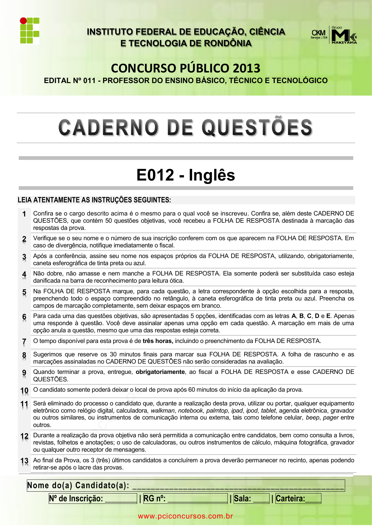 pcimarkpci MDAwMDowMDAwOjAwMDA6MDAwMDowMDAwOmZmZmY6MzZlOTpjMjU5:U3VuLCAxMiBTZXAgMjAyMSAxMDozNjowMyAtMDMwMA== INSTITUTO FEDERAL DE EDUCAÇÃO, CIÊNCIA E TECNOLOGIA DE RONDÔNIA CONCURSO PÚBLICO 2013 EDITAL Nº 011 - PROFESSOR DO ENSINO BÁSICO, TÉCNICO E TECNOLÓGICO E012 - Inglês LEIA ATENTAMENTE AS INSTRUÇÕES SEGUINTES: 1 Confira se o cargo descrito acima é o mesmo para o qual você se inscreveu. Confira se, além deste CADERNO DE QUESTÕES, que contém 50 questões objetivas, você recebeu a FOLHA DE RESPOSTA destinada à marcação das respostas da prova. 2 Verifique se o seu nome e o número de sua inscrição conferem com os que aparecem na FOLHA DE RESPOSTA. Em caso de divergência, notifique imediatamente o fiscal. 3 Após a conferência, assine seu nome nos espaços próprios da FOLHA DE RESPOSTA, utilizando, obrigatoriamente, caneta esferográfica de tinta preta ou azul. 4 Não dobre, não amasse e nem manche a FOLHA DE RESPOSTA. Ela somente poderá ser substituída caso esteja danificada na barra de reconhecimento para leitura ótica. 5 Na FOLHA DE RESPOSTA marque, para cada questão, a letra correspondente à opção escolhida para a resposta, preenchendo todo o espaço compreendido no retângulo, à caneta esferográfica de tinta preta ou azul. Preencha os campos de marcação completamente, sem deixar espaços em branco. 6 Para cada uma das questões objetivas, são apresentadas 5 opções, identificadas com as letras A, B, C, D e E. Apenas uma responde à questão. Você deve assinalar apenas uma opção em cada questão. A marcação em mais de uma opção anula a questão, mesmo que uma das respostas esteja correta. 7 O tempo disponível para esta prova é de três horas, incluindo o preenchimento da FOLHA DE RESPOSTA. 8 Sugerimos que reserve os 30 minutos finais para marcar sua FOLHA DE RESPOSTA. A folha de rascunho e as marcações assinaladas no CADERNO DE QUESTÕES não serão consideradas na avaliação. 9 Quando terminar a prova, entregue, obrigatoriamente, ao fiscal a FOLHA DE RESPOSTA e esse CADERNO DE QUESTÕES. 10 O candidato somente poderá deixar o local de prova após 60 minutos do início da aplicação da prova. 11 Será eliminado do processo o candidato que, durante a realização desta prova, utilizar ou portar, qualquer equipamento eletrônico como relógio digital, calculadora, walkman, notebook, palmtop, ipad, ipod, tablet, agenda eletrônica, gravador ou outros similares, ou instrumentos de comunicação interna ou externa, tais como telefone celular, beep, pager entre outros. 12 Durante a realização da prova objetiva não será permitida a comunicação entre candidatos, bem como consulta a livros, revistas, folhetos e anotações; o uso de calculadoras, ou outros instrumentos de cálculo, máquina fotográfica, gravador ou qualquer outro receptor de mensagens. 13 Ao final da Prova, os 3 (três) últimos candidatos a concluírem a prova deverão permanecer no recinto, apenas podendo retirar-se após o lacre das provas. Nome do(a) Candidato(a): ______________________________________________ Nº de Inscrição: ________ | RG nº: _______________ | Sala: ____ | Carteira:____ www.pciconcursos.com.br pcimarkpci MDAwMDowMDAwOjAwMDA6MDAwMDowMDAwOmZmZmY6MzZlOTpjMjU5:U3VuLCAxMiBTZXAgMjAyMSAxMDozNjowMyAtMDMwMA== www.pciconcursos.com.br pcimarkpci MDAwMDowMDAwOjAwMDA6MDAwMDowMDAwOmZmZmY6MzZlOTpjMjU5:U3VuLCAxMiBTZXAgMjAyMSAxMDozNjowMyAtMDMwMA== Página 3 Caderno de Questões –IFRO Edital 011 - E012 - Inglês Língua Portuguesa Texto para responder às questões de 01 a 10. A TRANSFIGURAÇÃO PELA POESIA. Vinícius de Moraes - Publicado no Jornal A Manhã. Creio firmemente que o confinamento em si mesmo, imposto a toda uma legião de criaturas pela guerra, é dinamite se acumulando no subsolo das almas para as explosões da paz. No seio mesmo da tragédia sinto o fermento da meditação crescer. Não tenho dúvida de que poderosos artistas surgirão das ruínas ainda não reconstruídas do mundo para cantar e contar a beleza e reconstruí-lo livre. Pois na luta onde todos foram soldados - a minoria nos campos de batalha, a maioria nas solidões do próprio eu, lutando a favor da liberdade e contra ela, a favor da vida e contra ela - os sobreviventes, de corpo e espírito, e os que aguardaram em lágrimas a sua chegada imprevisível, hão de se estreitar num abraço tão apertado que nem a morte os poderá separar. E o pranto que chorarem juntos há de ser água para lavar dos corações o ódio e das inteligências o mal-entendido. Porque haverá nos olhos, na boca, nas mãos, nos pés de todos uma ânsia tão intensa de repouso e de poesia, que a paixão os conduzirá para os mesmos caminhos, os únicos que fazem a vida digna: os da ternura e do despojamento. Tenho que só a poesia poderá salvar o mundo da paz política que se anuncia - a poesia que é carne, a carne dos pobres humilhados, das mulheres que sofrem, das crianças com frio, a carne das auroras e dos poentes sobre o chão ainda aberto em crateras. Só a poesia pode salvar o mundo de amanhã. E como que é possível senti-la fervilhando em larvas numa terra prenhe de cadáveres. Em quantos jovens corações, neste momento mesmo, já não terá vibrado o pasmo da sua obscura presença? Em quantos rostos não se terá ela plantado, amarga, incerta esperança de sobrevivência? Em quantas duras almas já não terá filtrado a sua claridade indecisa? Que langor, que anseio de voltar, que desejo de fruir, de fecundar, de pertencer, já não terá ela arrancado de tantos corpos parados no antemomento do ataque, na hora da derrota, no instante preciso da morte? E a quantos seres martirizados de espera, de resignação, de revolta já não terão chegado as ondas do seu misterioso apelo? Sofre ainda o mundo de tirania e de opressão, da riqueza de alguns para a miséria de muitos, da arrogância de certos para a humilhação de quase todos. Sofre o mundo da transformação dos pés em borracha, d