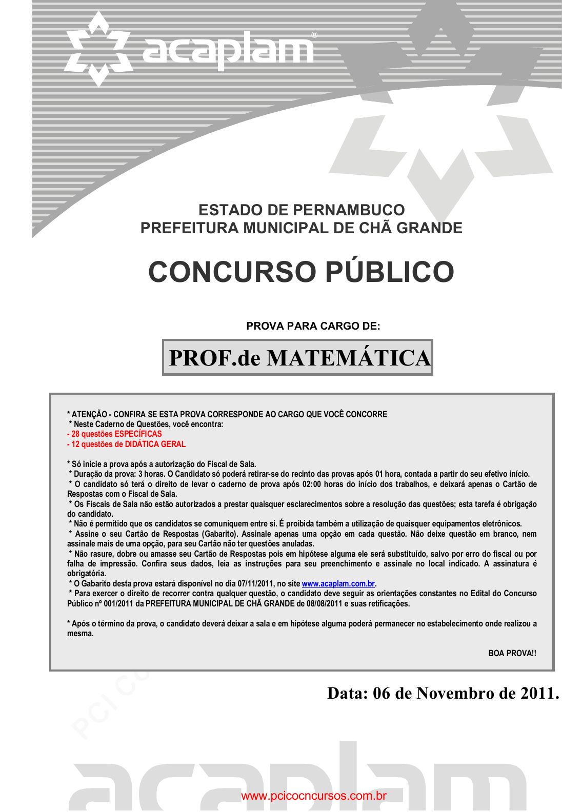 pcimarkpci MDAwMDowMDAwOjAwMDA6MDAwMDowMDAwOmZmZmY6MzZlOTpjMjU5:U3VuLCAxMiBTZXAgMjAyMSAxMTowMDozMCAtMDMwMA== PROVA PARA CARGO DE: Data: 06 de Novembro de 2011. ESTADO DE PERNAMBUCO PREFEITURA MUNICIPAL DE CHÃ GRANDE CONCURSO PÚBLICO * ATENÇÃO - CONFIRA SE ESTA PROVA CORRESPONDE AO CARGO QUE VOCÊ CONCORRE * Neste Caderno de Questões, você encontra: - 28 questões ESPECÍFICAS - 12 questões de DIDÁTICA GERAL * Só inicie a prova após a autorização do Fiscal de Sala. * Duração da prova: 3 horas. O Candidato só poderá retirar-se do recinto das provas após 01 hora, contada a partir do seu efetivo início. * O candidato só terá o direito de levar o caderno de prova após 02:00 horas do início dos trabalhos, e deixará apenas o Cartão de Respostas com o Fiscal de Sala. * Os Fiscais de Sala não estão autorizados a prestar quaisquer esclarecimentos sobre a resolução das questões; esta tarefa é obrigação do candidato. * Não é permitido que os candidatos se comuniquem entre si. É proibida também a utilização de quaisquer equipamentos eletrônicos. * Assine o seu Cartão de Respostas (Gabarito). Assinale apenas uma opção em cada questão. Não deixe questão em branco, nem assinale mais de uma opção, para seu Cartão não ter questões anuladas. * Não rasure, dobre ou amasse seu Cartão de Respostas pois em hipótese alguma ele será substituído, salvo por erro do fiscal ou por falha de impressão. Confira seus dados, leia as instruções para seu preenchimento e assinale no local indicado. A assinatura é obrigatória. * O Gabarito desta prova estará disponível no dia 07/11/2011, no site www.acaplam.com.br. * Para exercer o direito de recorrer contra qualquer questão, o candidato deve seguir as orientações constantes no Edital do Concurso Público nº 001/2011 da PREFEITURA MUNICIPAL DE CHÃ GRANDE de 08/08/2011 e suas retificações. * Após o término da prova, o candidato deverá deixar a sala e em hipótese alguma poderá permanecer no estabelecimento onde realizou a mesma. BOA PROVA!! PROF.de MATEMÁTICA www.pcicocncursos.com.br pcimarkpci MDAwMDowMDAwOjAwMDA6MDAwMDowMDAwOmZmZmY6MzZlOTpjMjU5:U3VuLCAxMiBTZXAgMjAyMSAxMTowMDozMCAtMDMwMA== PARTE I – PROFESSOR DE MATEMÁTICA 01 - Um funcionário trabalhando em uma Empresa A recebe R$ 5.000,00 por mês. Entretanto, com o fechamento da Empresa A, este funcionário somente consegue um salário de R$ 1.561,00 por mês em uma Empresa B. Em relação ao que o funcionário recebia na Empresa A, de quanto foi a perda salarial em termos percentuais? A) 35,08% B) 89,00% C) 64,92% D) 31,22% E) 68,78% 02 - O imposto de renda para uma pessoa física é um percentual (alíquota) da renda líquida. Calcula-se a renda líquida da pessoa subtraindo do total de rendimentos tributáveis (salários, etc.), as contribuições para a previdência, um valor por cada dependente, despesas com instrução, despesas médicas, pensão alimentícia judicial, etc. Pessoas com baixa renda não pagam imposto de renda (alíquota = 0%), pessoas com renda intermediária pagam uma alíquota de 15% e pessoas com renda mais elevada pagam uma alíquota de 27,5%. Assim, o imposto para uma determinada pessoa é calculado pela seguinte fórmula: p 100 a.ri onde i é o imposto, r é a renda líquida (base de cálculo), a é a alíquota (%) e p é a parcela a deduzir (para que o gráfico do imposto em função da renda líquida seja uma função contínua). Qual é a alternativa que melhor representa o gráfico do imposto de renda de uma pessoa em função de sua renda líquida? 03 - A expressão = 0,004t + 79,8 fornece o comprimento , em centímetros, de uma barra de metal em função de sua temperatura t, em graus Celsius (oC). Essa barra, inicialmente à temperatura de 50oC, sofre um aquecimento e sua temperatura é, então, aumentada em 20%. O aumento percentual correspondente, no comprimento da barra, é de A) 0,02% B) 0,04% C) 0,05% D) 0,08% E) 0,06% 04 - Observe o gráfico, em que o segmento AB é paralelo ao eixo das abscissas. Esse gráfico representa a relação entre a ingestão de certo composto, em mg/dia, e sua absorção pelo organismo, também em mg/dia. A única alternativa falsa relativa ao gráfico é A) Para ingestões de até 20 mg/dia, a absorção é proporcional à quantidade ingerida. B) Para ingestões acima de 20 mg/dia, quanto maior a ingestão, menor a porcentagem absorvida do composto ingerido. C) A absorção resultante de ingestão de mais de 20 mg/dia é igual à absorção resultante da ingestão de 20 mg/dia. D) Para ingestões de até 20 mg/dia, a constante de proporcionalidade que relaciona a absorção com a quantidade ingerida é menor que 1. E) A razão entre a quantidade absorvida e a quantidade ingerida é constante. 05 - Um cabo está suspenso entre dois postes de mesma altura e que distam 20m entre si. O cabo foi feito com um material especial de modo que a curva por ele representada é uma parábola. Sabendo-se que a flexão do cabo a uma distância de 2m de um dos postes é de 14,4cm e que a altura dos postes é de 9m, então é correto afirmar que o ponto mais baixo do cabo, em relação ao solo, ficará a uma altura de A) 7,35 m B) 8,35 m C) 8,6 m D) 7,6 m E) 8,3 m www.pcicocncursos.com.br pcimarkpci MDAwMDowMDAwOjAwMDA6MDAwMDowMDAwOmZmZmY6MzZlOTpjMjU5:U3VuLCAxMiBTZXAgMjAyMSAxMTowMDozMCAtMDMwMA== 06 - Uma revista publicou um artigo mostrando que a fórmula usada como padrão no esporte, há mais de três décadas, para o controle dos batimentos cardíacos está superada. No mesmo artigo, é apresentada uma nova fórmula que, assim como a fórmula tradicional, permite encontrar a freqüência cardíaca máxima, em batimentos por minuto, de uma pessoa em função de sua idade. Se X é a idade, em anos, de uma pessoa, e 20 X 80, então essas duas fórmulas são as seguintes: Fórmula Nova 208 – 0,7 . X Fórmula Tradicional 220 - X Com base nessas informações, é correto afirmar que A) para idades