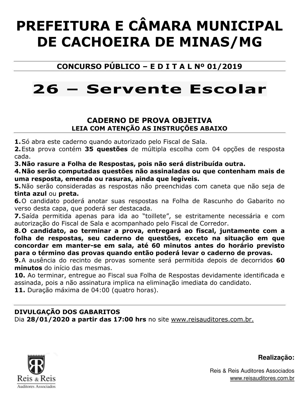 pcimarkpci MDAwMDowMDAwOjAwMDA6MDAwMDowMDAwOmZmZmY6MzZlOTpjMjU5:RnJpLCAxMCBTZXAgMjAyMSAyMjo0MTozNCAtMDMwMA== PREFEITURA E CÂMARA MUNICIPAL DE CACHOEIRA DE MINAS/MG CONCURSO PÚBLICO – E D I T A L Nº 01/2019 26 – Servente Escolar CADERNO DE PROVA OBJETIVA LEIA COM ATENÇÃO AS INSTRUÇÕES ABAIXO 1. Só abra este caderno quando autorizado pelo Fiscal de Sala. 2. Esta prova contém 35 questões de múltipla escolha com 04 opções de resposta cada. 3. Não rasure a Folha de Respostas, pois não será distribuída outra. 4. Não serão computadas questões não assinaladas ou que contenham mais de uma resposta, emenda ou rasuras, ainda que legíveis. 5. Não serão consideradas as respostas não preenchidas com caneta que não seja de tinta azul ou preta. 6. O candidato poderá anotar suas respostas na Folha de Rascunho do Gabarito no verso desta capa, que poderá ser destacada. 7. Saída permitida apenas para ida ao “toillete”, se estritamente necessária e com autorização do Fiscal de Sala e acompanhado pelo Fiscal de Corredor. 8. O candidato, ao terminar a prova, entregará ao fiscal, juntamente com a folha de respostas, seu caderno de questões, exceto na situação em que concordar em manter-se em sala, até 60 minutos antes do horário previsto para o término das provas quando então poderá levar o caderno de provas. 9. A ausência do recinto de provas somente será permitida depois de decorridos 60 minutos do início das mesmas. 10. Ao terminar, entregue ao Fiscal sua Folha de Respostas devidamente identificada e assinada, pois a não assinatura implica na eliminação imediata do candidato. 11. Duração máxima de 04:00 (quatro horas). DIVULGAÇÃO DOS GABARITOS Dia 28/01/2020 a partir das 17:00 hrs no site www.reisauditores.com.br. Realização: Reis & Reis Auditores Associados www.reisauditores.com.br pcimarkpci MDAwMDowMDAwOjAwMDA6MDAwMDowMDAwOmZmZmY6MzZlOTpjMjU5:RnJpLCAxMCBTZXAgMjAyMSAyMjo0MTozNCAtMDMwMA== RASCUNHO DO GABARITO Esta folha pode ser destacada 01 A B C D 21 A B C D 02 A B C D 22 A B C D 03 A B C D 23 A B C D 04 A B C D 24 A B C D 05 A B C D 25 A B C D 06 A B C D 26 A B C D 07 A B C D 27 A B C D 08 A B C D 28 A B C D 09 A B C D 29 A B C D 10 A B C D 30 A B C D 11 A B C D 31 A B C D 12 A B C D 32 A B C D 13 A B C D 33 A B C D 14 A B C D 34 A B C D 15 A B C D 35 A B C D 16 A B C D 17 A B C D 18 A B C D 19 A B C D 20 A B C D pcimarkpci MDAwMDowMDAwOjAwMDA6MDAwMDowMDAwOmZmZmY6MzZlOTpjMjU5:RnJpLCAxMCBTZXAgMjAyMSAyMjo0MTozNCAtMDMwMA== PROVA Nº 01 PORTUGUÊS 01) Analise a frase abaixo “A filha de Sara estava ENFERMA, preocupada foi até o médico que muito HUMILDE, explicou toda a situação, e Sara ficou CONTEMPLADA com a GENTILEZA do médico.” Assinale a alternativa que corresponde ao: Sinônimo, Antônimo, Sinônimo, Antônimo, das palavras em destaque, respectivamente: a) Saudável; Simples; Repudiada; Delicadeza. b) Doente; Soberbo; Admirada; Grosseria. c) Sadio; Desambicioso; Rejeitada; Arrogância. d) Adoentado; Modesto; Apreciada; Educação. 02) Marque a alternativa onde contém apenas palavras com acentos facultativos de acordo com a nova norma ortográfica: a) demos; cantámos. b) estudamos; gênero. c) puré; bebê. d) dêmos; sinônimo. 03) Em reação ao uso ou não de hífen, marque a opção correta: a) microondas; antirrugas; contra-cheque. b) anti-inflamatório; autoestima; micro-ondas. c) contrataque; sobreaviso; anti-social d) sobre-humano; auto-estima; antinflamatório. 04) Marque a opção em que as palavras não têm necessidade de letra maiúscula: a) Maria; Alemanha. b) Carnaval; Saturno. c) Rio de Janeiro; Estrela. d) ONU; Cruz Vermelha. 05) Sobre as formas nominais do verbo, aponte a opção em que a classificação das palavras como: infinitivo, particípio e gerúndio, estão respectivamente corretas: a) amado, falando, dar. b) rir, vivido, estudando. c) poder, estado, ganhado. d) trazendo, partido, ouvir. 06) A virgula está indevidamente empregada em: a) Corra, garoto, você está atrasado para a escola. b) Elas estavam muito, muito agitadas. c) Carlos Drummond de Andrade poeta do século XX, foi considerado um dos maiores autores da literatura brasileira. d) Minas Gerais, 31 de março de 1994. 07) Observe as opções abaixo a seguir e assinale a incorreta referente a divisão silábica: a) u - ru – guai. b) ba - la - i – o. c) blu - sa. d) que - ri – do. 08) Marque a opção que contém um adjetivo composto e um adjetivo biforme. a) verde-água; alto. b) alegre; azul. c) notável; mineiro. d) mato-grossense; amarelo. 09) Assinale a opção que possui apenas adjetivos: a) Inteligente; Bonita; Cachorro. b) Belo; Gordo; Elegante. c) Grande; Maria; Azul. d) Cavalo; Magro; Louco. 10) Aponte a alternativa cuja pontuação esteja correta: a) Se você se esforçasse um pouco mais, conseguiria realizar. b) Se você se esforçasse, um pouco mais, conseguiria realizar. c) Se você se esforçasse, um pouco mais conseguiria realizar. d) Se você, se esforçasse um pouco mais, conseguiria realizar. 11) Marque a alternativa no qual todos os substantivos estão no gênero feminino: a) garfo, amizade, profeta. b) réu, assunto, poeta. c) frade, cônsul, avó. d) situação, vasilha, colher. Responda às questões 12 a 14 com base no texto a seguir: “O gato, o galo e o ratinho Um ratinho vivia num buraco com sua mãe, depois de sair sozinho pela primeira vez, contou a ela: – Mãe, você não imagina os bichos estranhos que encontrei! Um era bonito e delicado, tinha um pelo muito macio e um rabo elegante, um rabo que se movia formando ondas. O outro era um monstro horrível! No alto da cabeça e debaixo do queixo ele tinha pedaços de carne crua, que balançavam quando ele andava. De repente os lados do corpo dele se sacudiram e ele deu um grito apavorante. Fiquei com tanto medo que fugi correndo, bem na hora que ia conversar um pouco com o simpático. pcimarkpci MDAwMDowMDAwOjAwMDA6MDAwMDowMDAwOmZmZmY6MzZlOTpjMjU5:RnJpLCAxMCBTZXAg