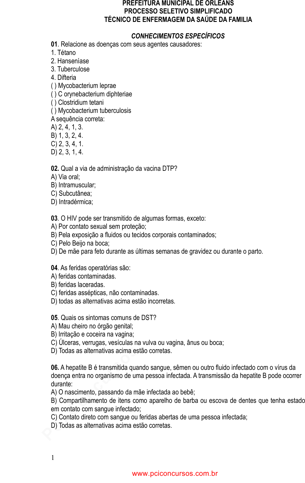 pcimarkpci MDAwMDowMDAwOjAwMDA6MDAwMDowMDAwOmZmZmY6MzZlOTpjMjU5:U2F0LCAxMSBTZXAgMjAyMSAwMzoyMTowMyAtMDMwMA== PREFEITURA MUNICIPAL DE ORLEANS PROCESSO SELETIVO SIMPLIFICADO TÉCNICO DE ENFERMAGEM DA SAÚDE DA FAMILIA CONHECIMENTOS ESPECÍFICOS 01. Relacione as doenças com seus agentes causadores: 1. Tétano 2. Hanseníase 3. Tuberculose 4. Difteria ( ) Mycobacterium leprae ( ) C orynebacterium diphteriae ( ) Clostridium tetani ( ) Mycobacterium tuberculosis A sequência correta: A) 2, 4, 1, 3. B) 1, 3, 2, 4. C) 2, 3, 4, 1. D) 2, 3, 1, 4. 02. Qual a via de administração da vacina DTP? A) Via oral; B) Intramuscular; C) Subcutânea; D) Intradérmica; 03. O HIV pode ser transmitido de algumas formas, exceto: A) Por contato sexual sem proteção; B) Pela exposição a fluidos ou tecidos corporais contaminados; C) Pelo Beijo na boca; D) De mãe para feto durante as últimas semanas de gravidez ou durante o parto. 04. As feridas operatórias são: A) feridas contaminadas. B) feridas laceradas. C) feridas assépticas, não contaminadas. D) todas as alternativas acima estão incorretas. 05. Quais os sintomas comuns de DST? A) Mau cheiro no órgão genital; B) Irritação e coceira na vagina; C) Úlceras, verrugas, vesículas na vulva ou vagina, ânus ou boca; D) Todas as alternativas acima estão corretas. 06. A hepatite B é transmitida quando sangue, sêmen ou outro fluido infectado com o vírus da doença entra no organismo de uma pessoa infectada. A transmissão da hepatite B pode ocorrer durante: A) O nascimento, passando da mãe infectada ao bebê; B) Compartilhamento de itens como aparelho de barba ou escova de dentes que tenha estado em contato com sangue infectado; C) Contato direto com sangue ou feridas abertas de uma pessoa infectada; D) Todas as alternativas acima estão corretas. 1 www.pciconcursos.com.br pcimarkpci MDAwMDowMDAwOjAwMDA6MDAwMDowMDAwOmZmZmY6MzZlOTpjMjU5:U2F0LCAxMSBTZXAgMjAyMSAwMzoyMTowMyAtMDMwMA== PREFEITURA MUNICIPAL DE ORLEANS PROCESSO SELETIVO SIMPLIFICADO TÉCNICO DE ENFERMAGEM DA SAÚDE DA FAMILIA 07. Para evitar a Síndrome Hemorrágica de recém-nascido é necessária a administração de uma vitamina nas primeiras horas de vida. Qual vitamina seria: A) K B) C C) E D) A 08. As injeções subcutâneas com agulha 10x5 deverão ser aplicadas com ângulo: A) 90º; B) 45º; C) 15º; D) Nenhuma das respostas anteriores. 09. _______ é uma terminologia que tem como significado ausência da respiração. A) Taquipnéia; B) Ortopnéia; C) Eupnéia; D) Apnéia; 10. Visando a um comportamento condizente com os preceitos ético-profissionais, o técnico de enfermagem deve: A) recusar-se a prestar assistência a um paciente cujo comportamento vá de encontro a seus valores morais e éticos. B) no caso da ausência permanente ou temporária do enfermeiro, executar atividades que vão além de sua competência para não deixar o cliente sem assistência. C) suspender suas atividades quando a instituição não oferecer condições mínimas para seu exercício profissional, comunicando ao COREN. D) obedecer, só em alguns casos, aos preceitos dispostos no código de ética. 11. Cabe a equipe de saúde, ao entrar em contato com uma mulher gestante, na unidade de saúde ou na comunidade, buscar compreender os múltiplos significados da gestação para aquela mulher e sua família. É correto dizer: A) O principal objetivo da assistência pré-natal é saber de quantas semanas está a gestação; B) A consulta de pré-natal de baixo risco envolve procedimentos bastante complexos, podendo ser realizado somente por profissional de saúde especializado em obstetrícia; C) A adesão das mulheres ao pré-natal independe da assistência prestada pelo serviço e pelos profissionais de saúde, não interferindo na redução dos elevados índices de mortalidade materna verificados no Brasil; D) Na visita domiciliar deverá ser visto o cartão da gestante e discutido os aspectos ligados às consultas, à vacinação, aos sintomas que ela está apresentando, aos aspectos relacionais com os demais membros da família e outros. Qualquer alteração deverá ser anotada e informada à equipe da unidade de saúde para avaliação e se necessário mudança no esquema de consultas preestabelecido. 12. O Sistema Único de Saúde, cuja proposta foi elaborada na 8ª Conferência Nacional de Saúde, estabelece diretrizes e princípios que orientam sua configuração: A) Bolsa família e PAC – Programa de Aceleração do Crescimento; B) Visibilidade; governabilidade; responsabilidade; C) universalidade; equidade; integralidade; D) Solidariedade e descentralização. 2 www.pciconcursos.com.br pcimarkpci MDAwMDowMDAwOjAwMDA6MDAwMDowMDAwOmZmZmY6MzZlOTpjMjU5:U2F0LCAxMSBTZXAgMjAyMSAwMzoyMTowMyAtMDMwMA== PREFEITURA MUNICIPAL DE ORLEANS PROCESSO SELETIVO SIMPLIFICADO TÉCNICO DE ENFERMAGEM DA SAÚDE DA FAMILIA 13. Em relação à assistência prestada à pessoa em crise convulsiva, não é uma conduta correta: A) Acomodar a pessoa para evitar quedas. B) Proteger o corpo da pessoa, principalmente a cabeça. C) Inserir objeto que proteja a boca para não morder a língua. D) Afastar objetos que possam ferir a pessoa durante a crise. 14. São doenças e agravos de notificação compulsórias: A) Cólera, malária, tuberculose, toxoplasmose, dengue e tracoma. B) Raiva humana, eventos adversos pós-vacinais, amebíase, a dengue e a varicela. C) Dengue, poliomielite, tuberculose, raiva humana e leptospirose. D) Teníase, shigelose, tuberculose, raiva humana e eventos adversos pós-vacinação. 15. Durantes os primeiros dias após o parto, as mamas secretam pequenas quantidades e líquidos, chamados: A) lóquios; B) ovulação; C) colostro; D) hipospádia; E) mecônio. PORTUGUES 16. Observe o emprego do Pronome “se”, no seguinte período: “ Não há político nesse mundo que não se julgue influente.” Indique a alternativa que o classifica corretamente: A) pronome reflexivo B) pronome oblíquo C) conjunç