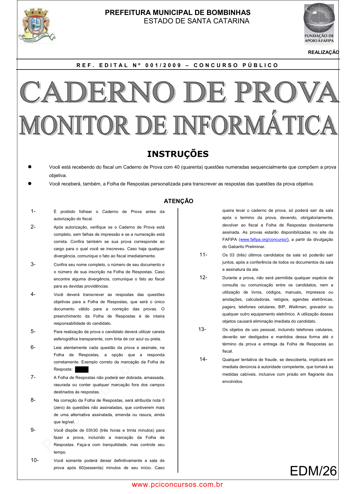 pcimarkpci MDAwMDowMDAwOjAwMDA6MDAwMDowMDAwOmZmZmY6MzZlOTpjMjU5:VHVlLCAxNCBTZXAgMjAyMSAyMjowMTo1NyAtMDMwMA== PREFEITURA MUNICIPAL DE BOMBINHAS ESTADO DE SANTA CATARINA REALIZAÇÃO R E F . E D I T A L N º 0 0 1 / 2 0 0 9 – C O N C U R S O P Ú B L I C O INSTRUÇÕES � Você está recebendo do fiscal um Caderno de Prova com 40 (quarenta) questões numeradas sequencialmente que compõem a prova objetiva. � Você receberá, também, a Folha de Respostas personalizada para transcrever as respostas das questões da prova objetiva. ATENÇÃO 1- É proibido folhear o Caderno de Prova antes da autorização do fiscal. 2- Após autorização, verifique se o Caderno de Prova está completo, sem falhas de impressão e se a numeração está correta. Confira também se sua prova corresponde ao cargo para o qual você se inscreveu. Caso haja qualquer divergência, comunique o fato ao fiscal imediatamente. 3- Confira seu nome completo, o número de seu documento e o número de sua inscrição na Folha de Respostas. Caso encontre alguma divergência, comunique o fato ao fiscal para as devidas providências. 4- Você deverá transcrever as respostas das questões objetivas para a Folha de Respostas, que será o único documento válido para a correção das provas. O preenchimento da Folha de Respostas é de inteira responsabilidade do candidato. 5- Para realização da prova o candidato deverá utilizar caneta esferográfica transparente, com tinta de cor azul ou preta. 6- Leia atentamente cada questão da prova e assinale, na Folha de Respostas, a opção que a responda corretamente. Exemplo correto da marcação da Folha de Resposta: 7- A Folha de Respostas não poderá ser dobrada, amassada, rasurada ou conter qualquer marcação fora dos campos destinados às respostas. 8- Na correção da Folha de Respostas, será atribuída nota 0 (zero) às questões não assinaladas, que contiverem mais de uma alternativa assinalada, emenda ou rasura, ainda que legível. 9- Você dispõe de 03h30 (três horas e trinta minutos) para fazer a prova, incluindo a marcação da Folha de Respostas. Faça-a com tranquilidade, mas controle seu tempo. 10- Você somente poderá deixar definitivamente a sala de prova após 60(sessenta) minutos de seu início. Caso queira levar o caderno de prova, só poderá sair da sala após o termino da prova, devendo, obrigatoriamente, devolver ao fiscal a Folha de Respostas devidamente assinada. As provas estarão disponibilizadas no site da FAFIPA (www.fafipa.org/concurso/), a partir da divulgação do Gabarito Preliminar. 11- Os 03 (três) últimos candidatos da sala só poderão sair juntos, após a conferência de todos os documentos da sala e assinatura da ata. 12- Durante a prova, não será permitida qualquer espécie de consulta ou comunicação entre os candidatos, nem a utilização de livros, códigos, manuais, impressos ou anotações, calculadoras, relógios, agendas eletrônicas, pagers, telefones celulares, BIP, Walkman, gravador ou qualquer outro equipamento eletrônico. A utilização desses objetos causará eliminação imediata do candidato. 13- Os objetos de uso pessoal, incluindo telefones celulares, deverão ser desligados e mantidos dessa forma até o término da prova e entrega da Folha de Respostas ao fiscal. 14- Qualquer tentativa de fraude, se descoberta, implicará em imediata denúncia à autoridade competente, que tomará as medidas cabíveis, inclusive com prisão em flagrante dos envolvidos. EDM/26 www.pciconcursos.com.br www.pciconcursos.com.br pcimarkpci MDAwMDowMDAwOjAwMDA6MDAwMDowMDAwOmZmZmY6MzZlOTpjMjU5:VHVlLCAxNCBTZXAgMjAyMSAyMjowMTo1OCAtMDMwMA== FOLHA PARA ANOTAÇÃO DAS RESPOSTAS DO CANDIDATO QUESTÃO 1 2 3 4 5 6 7 8 9 10 11 12 13 14 15 16 17 18 19 20 RESP. QUESTÃO 21 22 23 24 25 26 27 28 29 30 31 32 33 34 35 36 37 38 39 40 RESP. www.pciconcursos.com.br www.pciconcursos.com.br pcimarkpci MDAwMDowMDAwOjAwMDA6MDAwMDowMDAwOmZmZmY6MzZlOTpjMjU5:VHVlLCAxNCBTZXAgMjAyMSAyMjowMTo1OCAtMDMwMA== MONITOR DE INFORMÁTICA 3 PORTUGUÊS Questão 01 Assinale a alternativa cuja frase é gramaticalmen te INCORRETA. (A) Todos os envelopes contêm folhas de rascunho. (B) Todos os candidatos tem os requisitos exigidos. (C) É inútil pedir ajuda àqueles funcionários. (D) Se eu vier à aula amanhã, trarei o livro que me pediu. (E) Se ver novamente você dormindo durante o expediente, será demitido. Questão 02 Preencha as lacunas das assertivas abaixo e, em seguida, assinale a alternativa com a sequência correta. I. Depois que retornou do ______ a máquina não ficou boa. II. Ao deputado corrupto cabe a ______ dos direitos políticos. III. Encontraram uma criança perdida na ______ de brinquedos. IV. Ele _____ na carreira por causa do estudo. (A) concerto / sessão / seção / ascendeu (B) conserto / cessão / seção / ascendeu (C) concerto / cessão / seção / acendeu (D) concerto / sessão / cessão / ascendeu (E) concerto / cessão / seção / ascendeu Questão 03 Preencha as lacunas das assertivas abaixo e, em seguida, assinale a alternativa com a sequência correta. I. Você não foi à festa _______? II. ______ você desistiu da viagem? III. Não posso dizer a razão _____ me atrasei. IV. Não sei _____ de tanta confusão. (A) por quê / Por que / por que / o porquê (B) porquê / Por que / porque / o porquê (C) por quê / Por quê / por que / o porquê (D) por que / Por que / por que / o porquê (E) por que / Por que / por que / o porque Questão 04 Assinale a alternativa correta quanto à concordância. (A) Faziam dez anos que não via seus pais. (B) Houveram vários compromissos que fizeram com que ele chegasse atrasado. (C) A loja realizou uma liquidação para que se vendessem as roupas da coleção antiga. (D) Os Estados Unidos reforçou suas tropas no Oriente Médio. (E) Foi o gerente quem recebeu todos os méritos pelo aumento nas vendas. Questão 05 Analise as assertivas abaixo e, em seguida, assinale a alternativa correta. I. Ela viu que