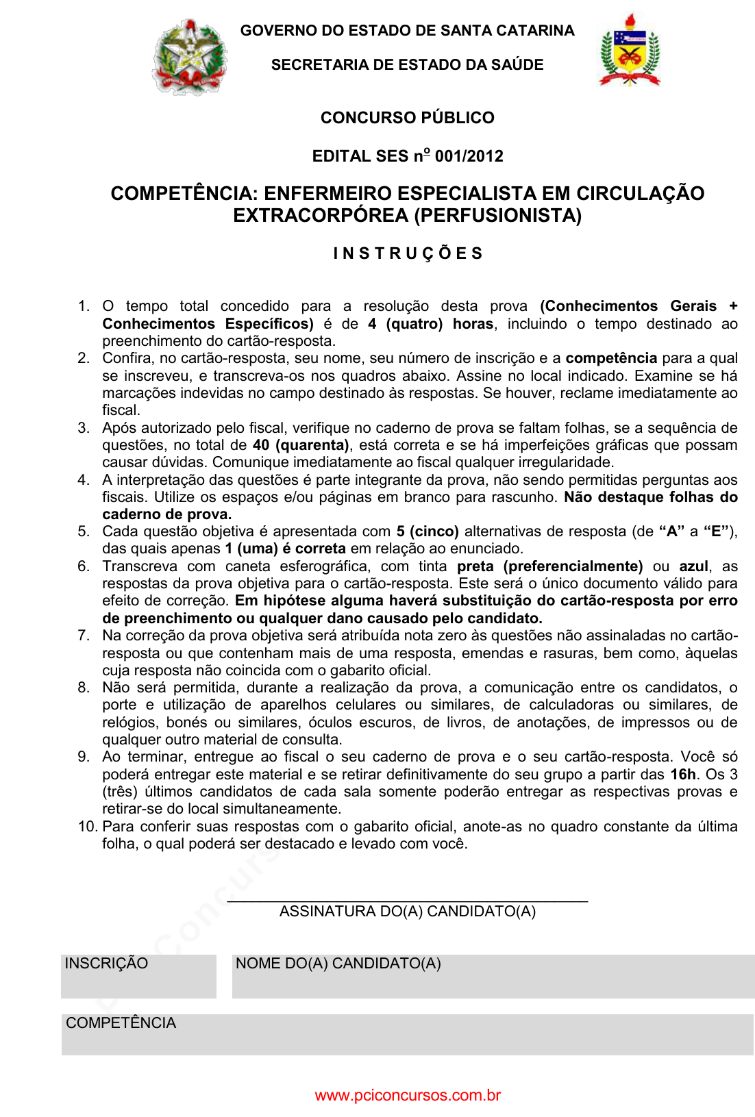 pcimarkpci MDAwMDowMDAwOjAwMDA6MDAwMDowMDAwOmZmZmY6MzZlOTpjMjU5:V2VkLCAxNSBTZXAgMjAyMSAxNDoxMzowNCAtMDMwMA== GOVERNO DO ESTADO DE SANTA CATARINA SECRETARIA DE ESTADO DA SAÚDE CONCURSO PÚBLICO EDITAL SES no 001/2012 COMPETÊNCIA: ENFERMEIRO ESPECIALISTA EM CIRCULAÇÃO EXTRACORPÓREA (PERFUSIONISTA) I N S T R U Ç Õ E S 1. O tempo total concedido para a resolução desta prova (Conhecimentos Gerais + Conhecimentos Específicos) é de 4 (quatro) horas, incluindo o tempo destinado ao preenchimento do cartão-resposta. 2. Confira, no cartão-resposta, seu nome, seu número de inscrição e a competência para a qual se inscreveu, e transcreva-os nos quadros abaixo. Assine no local indicado. Examine se há marcações indevidas no campo destinado às respostas. Se houver, reclame imediatamente ao fiscal. 3. Após autorizado pelo fiscal, verifique no caderno de prova se faltam folhas, se a sequência de questões, no total de 40 (quarenta), está correta e se há imperfeições gráficas que possam causar dúvidas. Comunique imediatamente ao fiscal qualquer irregularidade. 4. A interpretação das questões é parte integrante da prova, não sendo permitidas perguntas aos fiscais. Utilize os espaços e/ou páginas em branco para rascunho. Não destaque folhas do caderno de prova. 5. Cada questão objetiva é apresentada com 5 (cinco) alternativas de resposta (de “A” a “E”), das quais apenas 1 (uma) é correta em relação ao enunciado. 6. Transcreva com caneta esferográfica, com tinta preta (preferencialmente) ou azul, as respostas da prova objetiva para o cartão-resposta. Este será o único documento válido para efeito de correção. Em hipótese alguma haverá substituição do cartão-resposta por erro de preenchimento ou qualquer dano causado pelo candidato. 7. Na correção da prova objetiva será atribuída nota zero às questões não assinaladas no cartão- resposta ou que contenham mais de uma resposta, emendas e rasuras, bem como, àquelas cuja resposta não coincida com o gabarito oficial. 8. Não será permitida, durante a realização da prova, a comunicação entre os candidatos, o porte e utilização de aparelhos celulares ou similares, de calculadoras ou similares, de relógios, bonés ou similares, óculos escuros, de livros, de anotações, de impressos ou de qualquer outro material de consulta. 9. Ao terminar, entregue ao fiscal o seu caderno de prova e o seu cartão-resposta. Você só poderá entregar este material e se retirar definitivamente do seu grupo a partir das 16h. Os 3 (três) últimos candidatos de cada sala somente poderão entregar as respectivas provas e retirar-se do local simultaneamente. 10. Para conferir suas respostas com o gabarito oficial, anote-as no quadro constante da última folha, o qual poderá ser destacado e levado com você. ___________________________________________ ASSINATURA DO(A) CANDIDATO(A) INSCRIÇÃO NOME DO(A) CANDIDATO(A) COMPETÊNCIA www.pciconcursos.com.br pcimarkpci MDAwMDowMDAwOjAwMDA6MDAwMDowMDAwOmZmZmY6MzZlOTpjMjU5:V2VkLCAxNSBTZXAgMjAyMSAxNDoxMzowNCAtMDMwMA== SES 2012 – ENFERMEIRO ESPECIALISTA EM CIRCULAÇÃO EXTRACORPÓREA (PERFUSIONISTA) 2 CONHECIMENTOS GERAIS 01) De acordo com o Texto 1, identifique se são verdadeiras (V) ou falsas (F) as proposições abaixo. ( ) A ideia de que a mente das crianças é uma folha em branco ainda é aceita pela ciência. ( ) Antes das descobertas da neurociência, acreditava-se que todo conhecimento deveria ser transmitido pelos pais e pela escola às crianças muito pequenas. ( ) A palavra “mitos” (primeira linha do texto) está sendo usada no texto com o sentido de “ideias falsas, sem correspondência na realidade”. ( ) A pedagogia acreditava que a criança só poderia aprender alguma coisa depois que tivesse desenvolvido a linguagem. ( ) Atualmente já se sabe que os bebês adquirem noções simples de biologia, física e aritmética antes de atingir 3 meses de idade. Assinale a alternativa que apresenta a sequência CORRETA, de cima para baixo. A. ( ) F – V – V – V – F B. ( ) V – F – F – V – V C. ( ) F – V – F – F – V D. ( ) V – V – V – V – F E. ( ) F – V – F – V – F Texto I O maior dos mitos pedagógicos desmontados recentemente pela neurociência reza que a mente das crianças é uma folha em branco, e cabe aos pais e à escola preenchê-la com conhecimentos. Para isso, acreditava-se, era pré-requisito que a criança já tivesse desenvolvido a linguagem. Ocorre que as crianças são mais sabidas do que se pensava. Uma série de estudos prova que, a partir dos 3 meses de idade, os bebês se engajam num processo intenso de aprendizado de noções rudimentares de biologia, física e aritmética. Antes se pensava que os bebês observam o ambiente à sua volta e têm a atenção despertada por pessoas e objetos, mas não são capazes de adquirir conhecimento com isso. Agora se sabe que os bebês já têm consciência de que, por exemplo, os objetos precisam de um suporte para não cair no chão e de que coisas inanimadas só se movimentam se alguém mexer nelas. Antes se acreditava que a voz dos pais ou das pessoas conhecidas desperta a atenção das crianças muito pequenas porque elas se habituam a ouvi-la. Agora se sabe que as crianças desenvolvem mecanismos linguísticos antes mesmo de aprender a falar. Elas sabem que as palavras expressam um conteúdo e que o latido de um cachorro ou o toque de um telefone não têm significado algum. As descobertas da neurociência possibilitam aos educadores saber exatamente com o que estão lidando ao incutir conhecimento nos 100 bilhões de neurônios que carregamos no crânio. MELO, Carolina. Até os 8 Só Elogio, O.K.? Veja. São Paulo: Abril, ed. 2254, ano 45, n. 5, p. 73, 1 fev. 2012. [Adaptado] www.pciconcursos.com.br pcimarkpci MDAwMDowMDAwOjAwMDA6MDAwMDowMDAwOmZmZmY6MzZlOTpjMjU5:V2VkLCAxNSBTZXAgMjAyMSAxNDoxMzowNCAtMDMwMA== SES 2012 – ENFERMEIRO ESPECIALISTA EM CIRCULAÇÃ