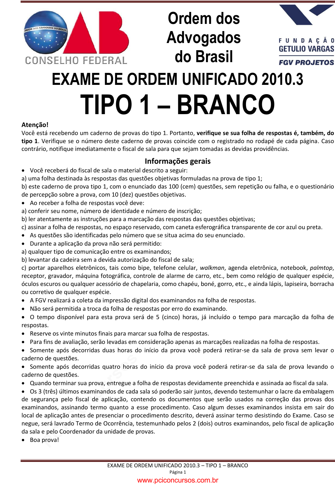 pcimarkpci MDAwMDowMDAwOjAwMDA6MDAwMDowMDAwOmZmZmY6MzZlOTpjMjU5:VGh1LCAxNiBTZXAgMjAyMSAwMDoxOToxNSAtMDMwMA== EXAME DE ORDEM UNIFICADO 2010.3 – TIPO 1 – BRANCO Página 1 Ordem dos Advogados do Brasil EXAME DE ORDEM UNIFICADO 2010.3 TIPO 1 – BRANCO Atenção! Você está recebendo um caderno de provas do tipo 1. Portanto, verifique se sua folha de respostas é, também, do tipo 1. Verifique se o número deste caderno de provas coincide com o registrado no rodapé de cada página. Caso contrário, notifique imediatamente o fiscal de sala para que sejam tomadas as devidas providências. Informações gerais Você receberá do fiscal de sala o material descrito a seguir: a) uma folha destinada às respostas das questões objetivas formuladas na prova de tipo 1; b) este caderno de prova tipo 1, com o enunciado das 100 (cem) questões, sem repetição ou falha, e o questionário de percepção sobre a prova, com 10 (dez) questões objetivas. Ao receber a folha de respostas você deve: a) conferir seu nome, número de identidade e número de inscrição; b) ler atentamente as instruções para a marcação das respostas das questões objetivas; c) assinar a folha de respostas, no espaço reservado, com caneta esferográfica transparente de cor azul ou preta. As questões são identificadas pelo número que se situa acima do seu enunciado. Durante a aplicação da prova não será permitido: a) qualquer tipo de comunicação entre os examinandos; b) levantar da cadeira sem a devida autorização do fiscal de sala; c) portar aparelhos eletrônicos, tais como bipe, telefone celular, walkman, agenda eletrônica, notebook, palmtop, receptor, gravador, máquina fotográfica, controle de alarme de carro, etc., bem como relógio de qualquer espécie, óculos escuros ou qualquer acessório de chapelaria, como chapéu, boné, gorro, etc., e ainda lápis, lapiseira, borracha ou corretivo de qualquer espécie. A FGV realizará a coleta da impressão digital dos examinandos na folha de respostas. Não será permitida a troca da folha de respostas por erro do examinando. O tempo disponível para esta prova será de 5 (cinco) horas, já incluído o tempo para marcação da folha de respostas. Reserve os vinte minutos finais para marcar sua folha de respostas. Para fins de avaliação, serão levadas em consideração apenas as marcações realizadas na folha de respostas. Somente após decorridas duas horas do início da prova você poderá retirar-se da sala de prova sem levar o caderno de questões. Somente após decorridas quatro horas do início da prova você poderá retirar-se da sala de prova levando o caderno de questões. Quando terminar sua prova, entregue a folha de respostas devidamente preenchida e assinada ao fiscal da sala. Os 3 (três) últimos examinandos de cada sala só poderão sair juntos, devendo testemunhar o lacre da embalagem de segurança pelo fiscal de aplicação, contendo os documentos que serão usados na correção das provas dos examinandos, assinando termo quanto a esse procedimento. Caso algum desses examinandos insista em sair do local de aplicação antes de presenciar o procedimento descrito, deverá assinar termo desistindo do Exame. Caso se negue, será lavrado Termo de Ocorrência, testemunhado pelos 2 (dois) outros examinandos, pelo fiscal de aplicação da sala e pelo Coordenador da unidade de provas. Boa prova! www.pciconcursos.com.br pcimarkpci MDAwMDowMDAwOjAwMDA6MDAwMDowMDAwOmZmZmY6MzZlOTpjMjU5:VGh1LCAxNiBTZXAgMjAyMSAwMDoxOToxNSAtMDMwMA== EXAME DE ORDEM UNIFICADO 2010.3 – TIPO 1 – BRANCO Página 2 www.pciconcursos.com.br pcimarkpci MDAwMDowMDAwOjAwMDA6MDAwMDowMDAwOmZmZmY6MzZlOTpjMjU5:VGh1LCAxNiBTZXAgMjAyMSAwMDoxOToxNSAtMDMwMA== EXAME DE ORDEM UNIFICADO 2010.3 – TIPO 1 – BRANCO Página 3 1 O prefeito de um determinado município resolve, por decreto municipal, alterar unilateralmente as vias de transporte de ônibus municipais, modificando o que estava previsto nos contratos de concessão pública de transportes municipais válidos por vinte anos. O objetivo do prefeito foi favorecer duas empresas concessionárias específicas, com que mantém ligações políticas e familiares, ao lhes conceder os trajetos e linhas mais rentáveis. As demais três empresas concessionárias que também exploram os serviços de transporte de ônibus no município por meio de contratos de concessão sentem-se prejudicadas. Na qualidade de advogado dessas últimas três empresas, qual deve ser a providência tomada? (A) Ingressar com ação judicial, com pedido de liminar para que o Poder Judiciário exerça o controle do ato administrativo expedido pelo prefeito e decrete a sua nulidade ou suspensão imediata, já que eivado de vício e nulidade, por configurar ato fraudulento e atentatório aos princípios que regem a Administração Pública. (B) Ingressar com ação judicial, com pedido de indenização em face do Município pelos prejuízos de ordem financeira causados. (C) Nenhuma medida merece ser tomada na hipótese, tendo em vista que um dos poderes conferidos à Administração Pública nos contratos de concessão é a modificação unilateral das suas cláusulas. (D) Ingressar com ação judicial, com pedido para que os benefícios concedidos às duas primeiras empresas também sejam extensivos às três empresas clientes. 2 São considerados agentes públicos todas as pessoas físicas incumbidas, sob remuneração ou não, definitiva ou transitoriamente, do exercício de função ou atividade pública. Assim, é correto afirmar que os notários e registradores são (A) agentes públicos ocupantes de cargo efetivo e se aposentam aos 70 (setenta) anos de idade. (B) agentes públicos vitalícios, ocupantes de cargo efetivo, e não se aposentam compulsoriamente. (C) delegatários de serviços públicos aprovados em concurso público. (D) os notários e registradores são delegatários de serviços públicos, investidos em cargos efetivos após aprovação em concu